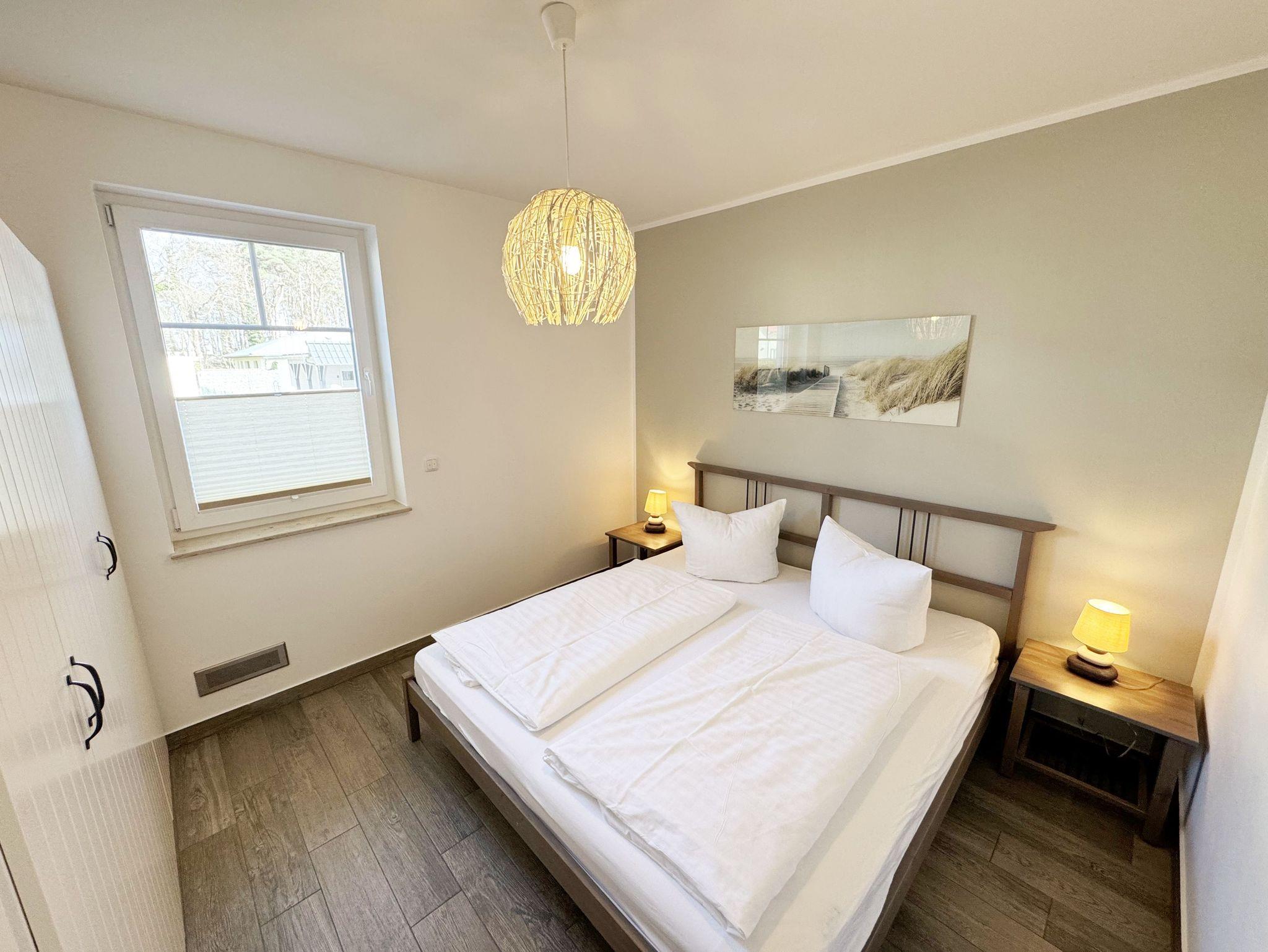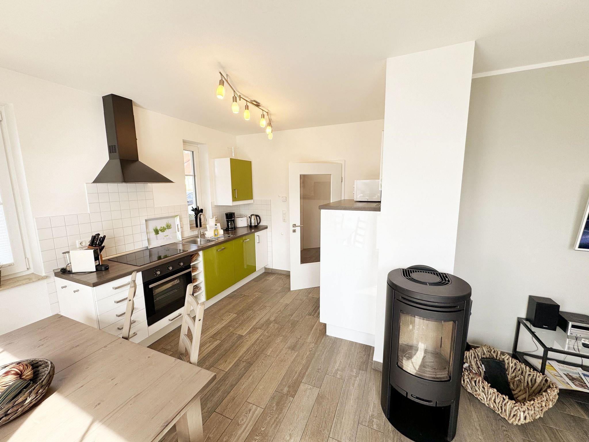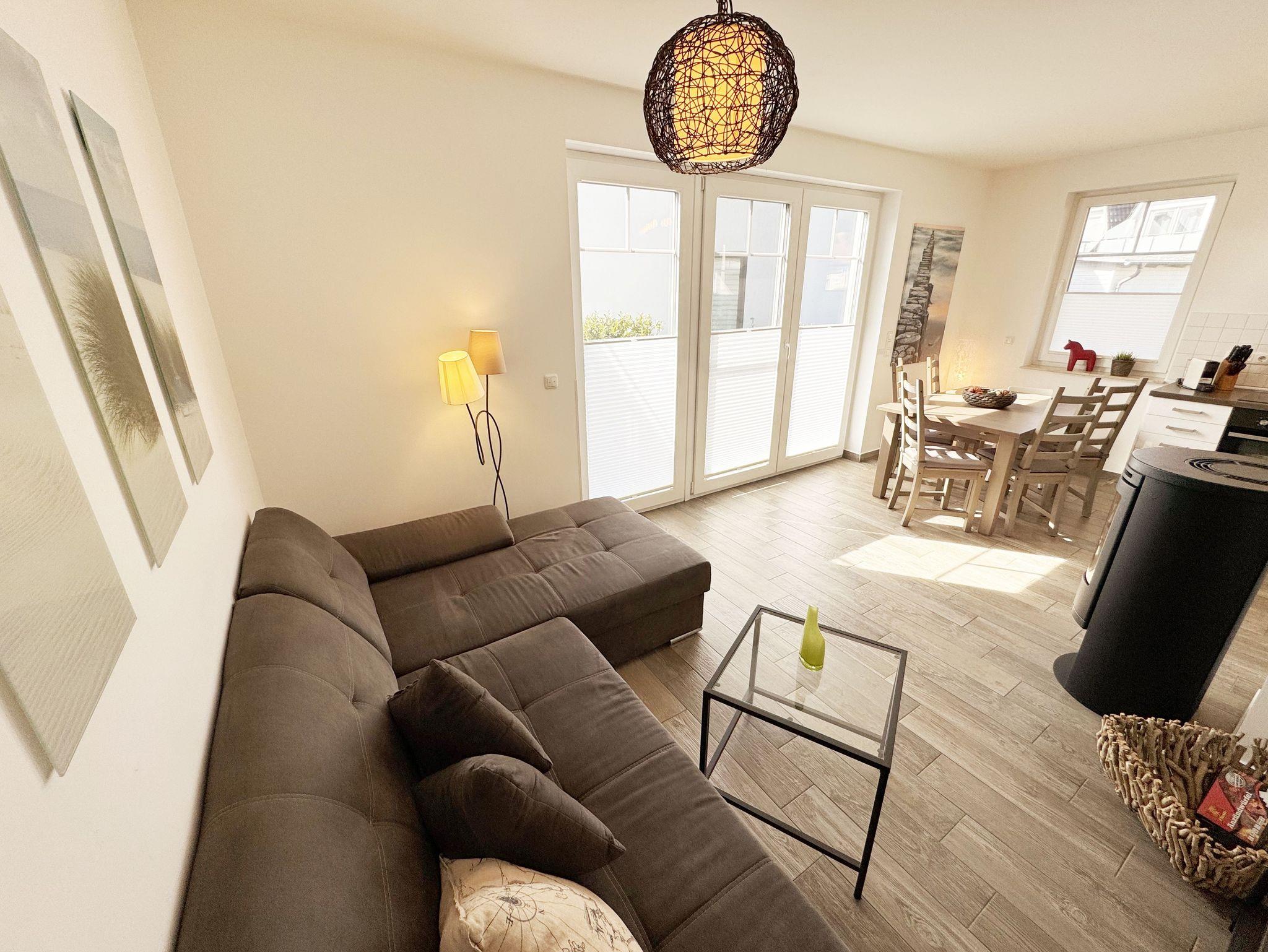 Die komfortable ca. 65 m² große, lichtdurchflutete 3-Zimmer-Wohnung (Nichtraucher) befindet sich im Erdgeschoss des Hauses Möwe. Sie ist über einen überdachten und separaten Eingang an der Giebelseite des Hauses zu erreichen und perfekt für 2 bis 4 Erwachsene +1 Kleinkind bis 3 Jahre im Kinderreisebett. Im Flur finden Sie eine Garderobe nebst Sitzbank, von wo Sie auch alle Räumlichkeiten erreichen. Der kombinierte Wohn-/Essbereich ist mit einer gemütlichen Couchecke samt Couchtisch und einer Stehlampe, einem Smart-TV und einer Mini-Stereo-Anlage incl. USB-Anschluss ausgestattet. Abgerundet wird es durch einen WLAN-Zugang. Für gemütliche Stunden in der kalten Jahreszeit steht Ihnen zusätzlich ein Kaminofen zur Verfügung. Angrenzend zum Wohnbereich befindet sich die moderne Küchenzeile mit einem Cerankochfeld, einem Backofen, einer Mikrowelle, einem Geschirrspüler, einem Kühlschrank mit Gefrierfach, einer Kaffeemaschine, einem Wasserkocher, einer Nespresso Maschine, einem Toaster und anderen praktischen Küchenutensilien. Ergänzend passt sich der Esstisch an. Von hier gelangen Sie auf Ihre ca. 16m² große und bestuhlte Südwest-Terrasse mit einem Sonnenschirm sowie einen zugehörigen kleinem Gartenanteil und Holzkohlegrill. Das große Schlafzimmer verfügt über ein Doppelbett (1,80m x 2,00m), verstellbare Lattenroste, Nachttischablagen und einen geräumigen Kleiderschrank mit Safe. Im kleinen Schlafzimmer befinden sich zwei Einzelbetten (0,90m x 2,00m) mit verstellbaren Lattenrosten und zwei Kommoden. Für einen ruhigen Schlaf sorgen zusätzlich Plissees, elektrische Außenrollos sowie Insektenschutzgitter. Zum innenliegenden Badezimmer gehören eine Dusche mit flachem Einstieg, ein Waschplatz, ein WC, ein beheizter Handtuchhalter, eine Waschmaschine, einen Fön sowie einen Kosmetikspiegel. In der kleinen vom Flur aus erreichbarer Abstellkammer stehen für Sie ein Staubsauger, ein Wäscheständer und Reinigungsutensilien bereit. Alle Räumlichkeiten sind mit durchgehend holzlimitierten Steinfußböden, einer Fußbodenheizung und einer automatischen Be- und Entlüftung ausgestattet. Haustiere sind nicht erlaubt. Der zur Wohnung gehörende PKW-Stellplatz (Nr.03) liegt vis-a-vis Ihrer Eingangstür. Auch der exklusiv durch Sie nutzbare großzügige Abstellraum (Nr. 03) für Ihre oder geliehene Fahrräder, Surf- und Strandutensilien befindet sich in unmittelbarer Nähe auf dem Grundstück. Die Erstausstattung eines Wäschepaketes (komplette Bettwäsche, 1 Duschhandtuch, 2 kleine Handtücher) können Sie bis 14 Tage vor der Anreise gegen einen Aufpreis dazu buchen oder durch eigene ergänzen. Ab 2 gebuchten Paketen erhalten Sie einmalig 1 Geschirrtuch und einen Duschvorleger dazu.