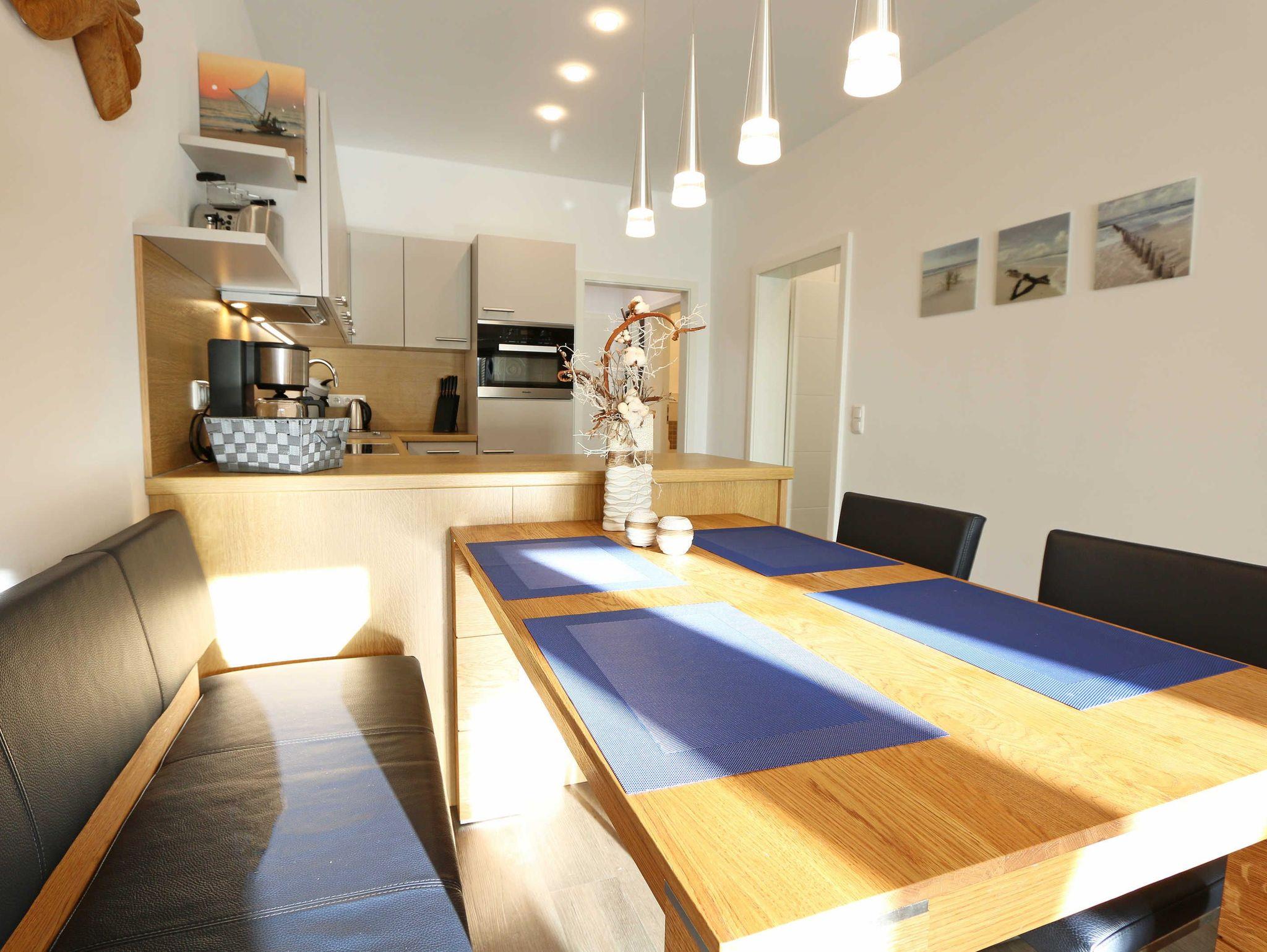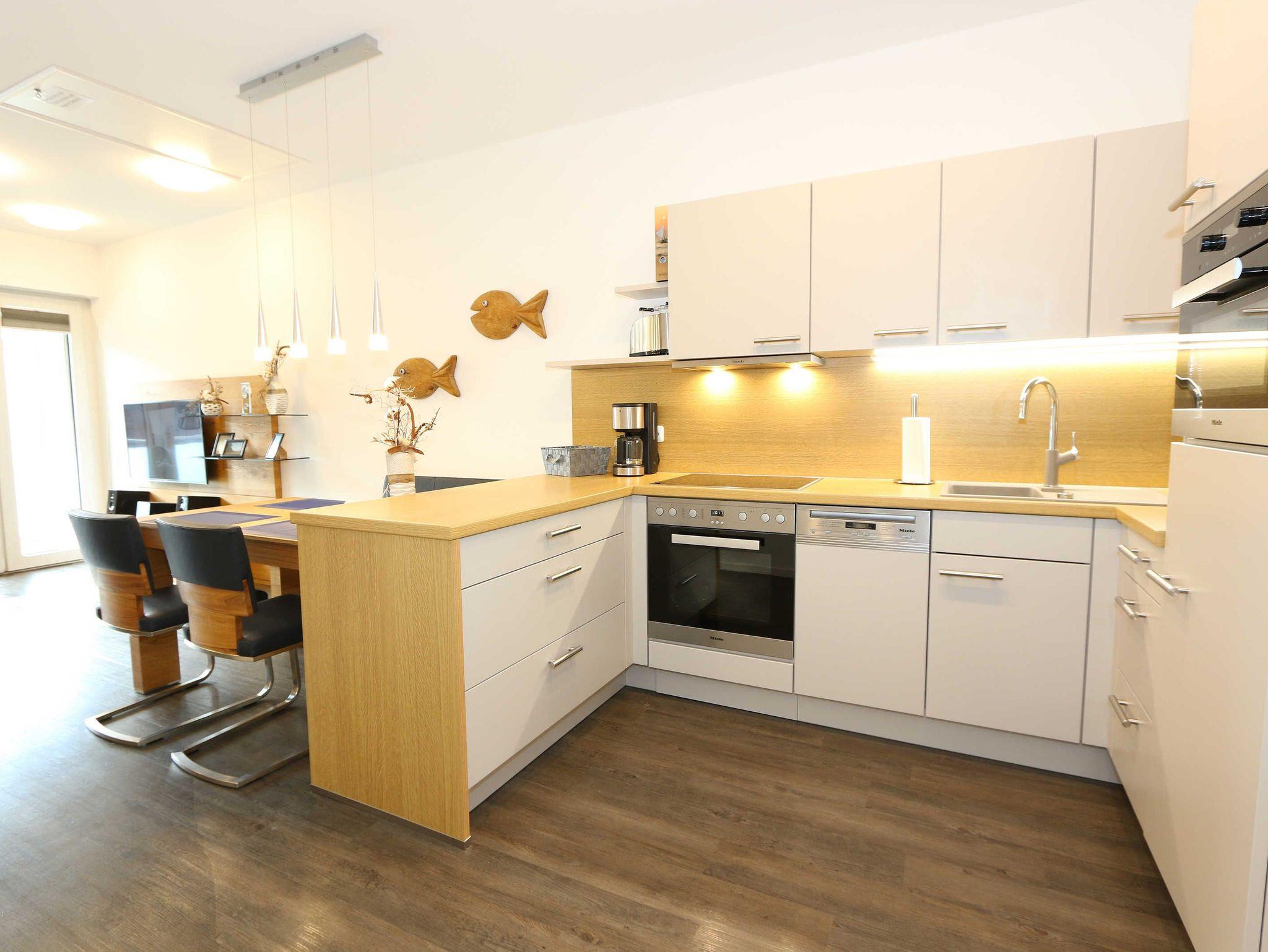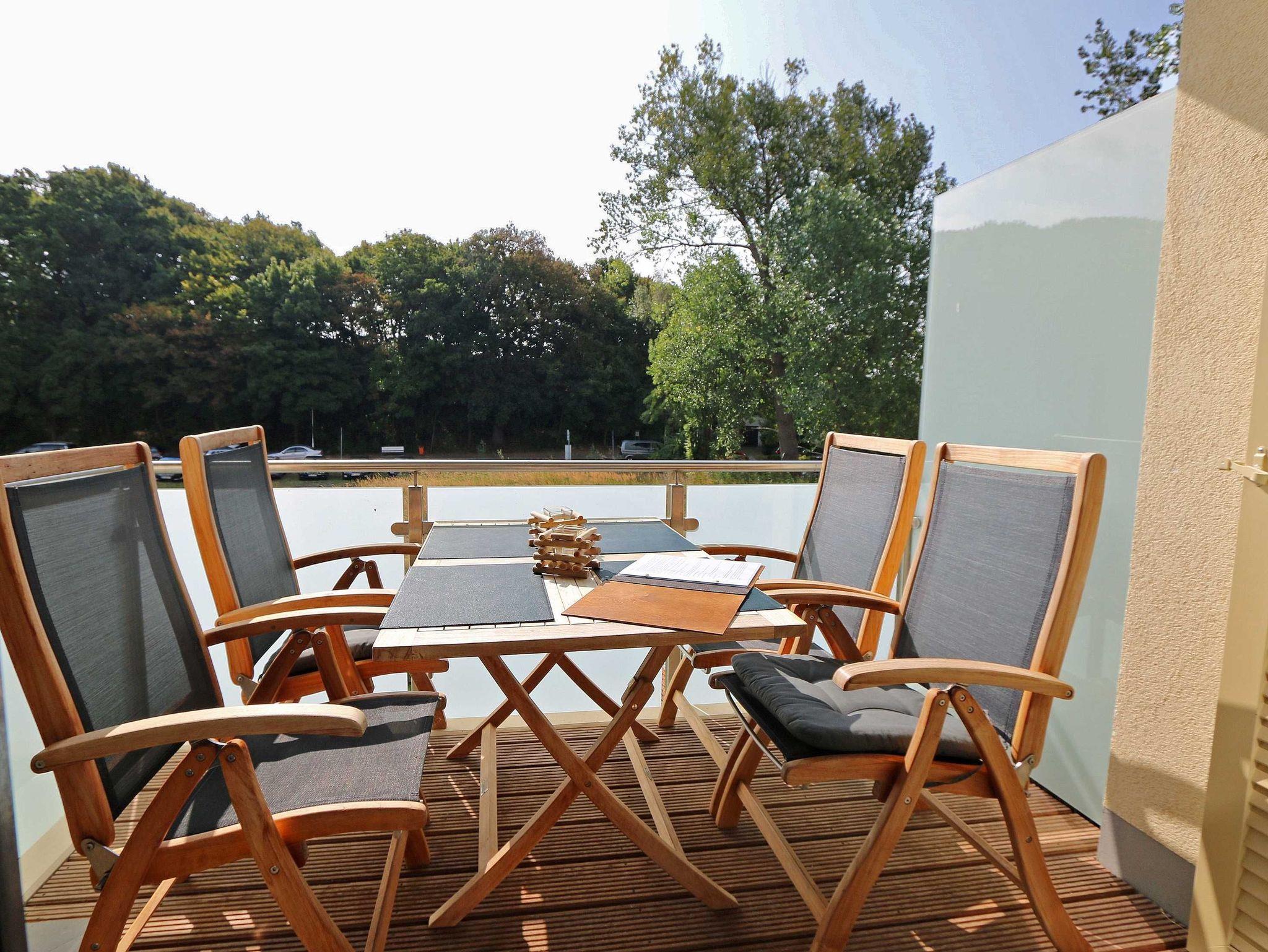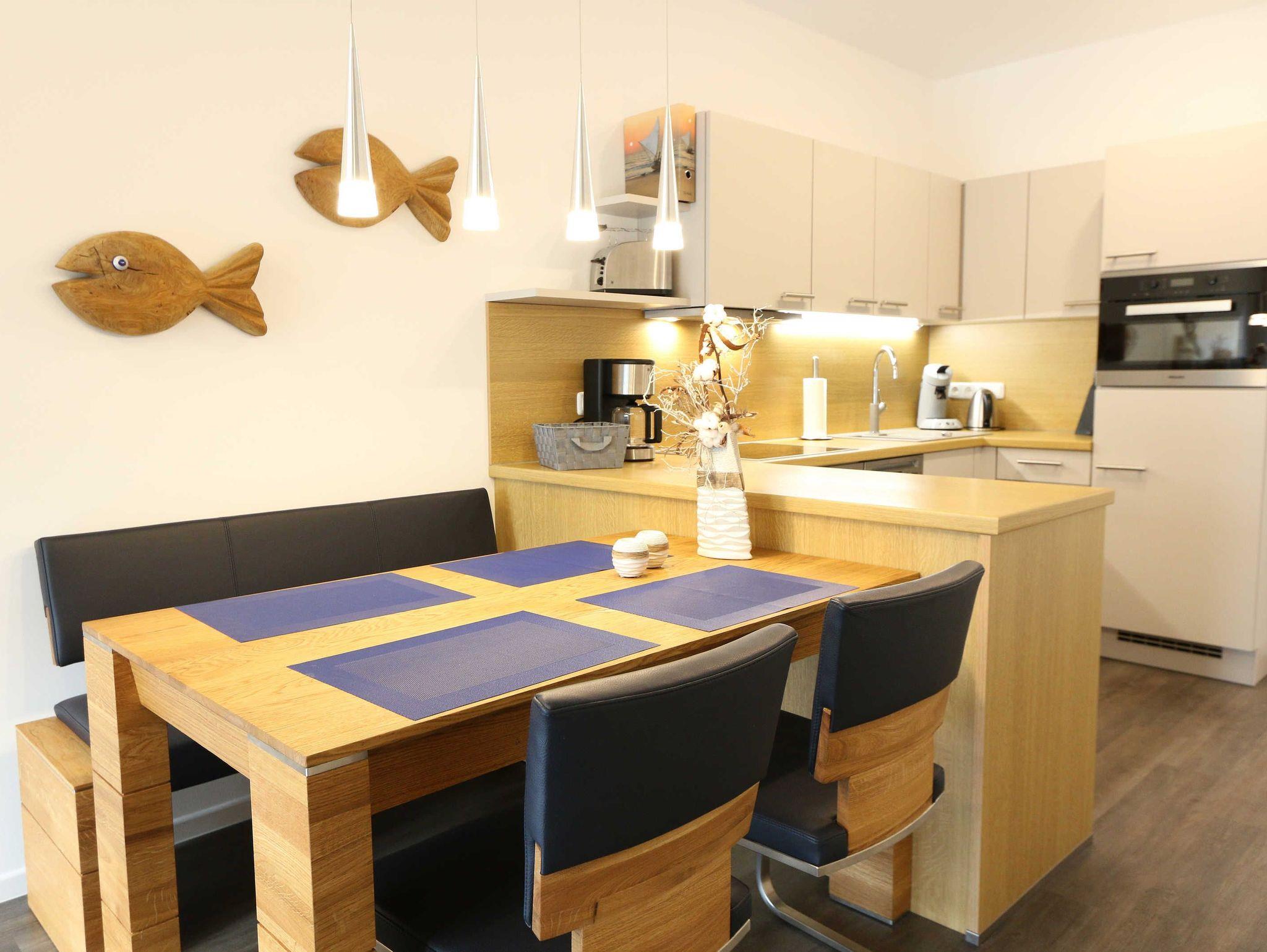 Das komfortabel und stilvoll eingerichtete Feriendomizil besticht durch viele mit Liebe zum Detail ausgesuchte Accessoires und einen traumhaften Balkonblick nach Süden auf den Lotsenberg. Die ca. 58 m² große Nichtraucherwohnung im 1. Obergeschoss ist mit Fußbodenheizung ausgestattet und bietet Ihnen Platz für 2 bis 4 Personen. Öffnen Sie die Wohnungstür und Sie betreten den hellen Flur mit Flurgarderobe nebst Sitzgelegenheit und bodentiefem Spiegel. Im vorderen Wohnbereich befindet sich eine hochwertige Küchenzeile mit Mikrowelle, Kühlschrank mit Gefrierfach, Backofen, Induktionskochfeld und Geschirrspüler. Auch Elektrogeräte wie Kaffeemaschine, Pad-Maschine (Senseo), Wasserkocher, Eierkocher, Toaster und Handmixer sowie viele andere nützliche Küchenhelfer sind hier vorhanden. Direkt dahinter fügt sich ein mit großem Eichen-Massivholztisch, modernen Freischwing-Stühlen und einer bequemen Sitzbank ausgestatteter Essbereich an. Von hier aus können Sie bereits beim Frühstück die Morgensonne durch die bodentiefen Wohnzimmerfenster genießen. Angrenzend öffnet sich der Raum zum großzügigen Wohnbereich, in dem Sie auf einer gemütlichen Sitzlandschaft - die sich mit wenigen Handgriffen zur vollwertigen Schlafgelegenheit ausklappen lässt ? entspannen können. Das komplette Ensemble, bestehend aus Couch mit Longchair (1,40 m x 2,00 m), Eiche-Couchtisch, Hockerbank und Beistelltisch mit Tischlampe im maritimen Stil, befindet sich auf der einen; ein Lowboard mit einer Spielesammlung, einem Smart-TV, Blu-Ray-Player und einer HiFi-Anlage mit Bluetooth und USB-Anschluss auf der anderen Seite. Auch auf einen Internetanschluss (WLAN) müssen Sie im Urlaub nicht verzichten. Dieser ist für Sie inklusive. In der kühlen Jahreszeit sorgt ein exklusiver Design-Kaminofen zusätzlich für wohlige Wärme. Durch die nach Süden ausgerichtete Glasfront des Wohnbereiches betreten Sie den mit Bangkirai belegten und mit einer Teakholz-Sitzgruppe möblierten Balkon mit Insektenschutzgitter und Sonnenschirm. Von hier aus genießen Sie einen herrlichen Blick ins Grüne, während Sie vor neugierigen Blicken durch eine mit Milchglas ausgefachte Edelstahl-Balkonbrüstung geschützt sind. Da sich der Balkon windgeschützt in das Obergeschoß einfügt und großzügig überdacht ist, können Sie hier auch die Abende genießen. Erholsame Ruhe finden Sie im geräumigen Schlafzimmer, in dem ein herrlich bequemes, individuell einstellbares Doppelbett (1,80 m x 2,00 m) in Komforthöhe mit verstellbaren Lattenrosten auf Sie wartet. Das elektrisch betriebene große Dachfenster, kann für einen ungestörten Schlaf völlig abgedunkelt werden und verfügt darüber hinaus über ein Insektenschutz-Rollo. Zwei Nachttischablagen mit dezenten Lampen laden zum Schmökern ein. Ein weiterer Smart-TV befindet sich hier an der Wand. In zwei großen Kleiderschränken sowie einer breiten Schubkastenkommode und auf 2 Herrendienern findet Ihre Kleidung Platz. Das geräumige, innenliegende Bad verfügt über eine große und bodentiefe Echtglas-Dusche, WC, einen Kosmetikspiegel, einen Fön, Ablageflächen und neben der Fußbodenheizung auch über einen elektrischen Handtuchtrockner. Im Abstellraum finden Sie unter anderem Staubsauger, Aschesauger für den Kamin, diverse Reinigungsutensilien, Wäscheständer sowie Balkonauflagen. Haustiere sind nicht erlaubt. Ihr PKW steht auf einem zur Wohnung gehörenden Stellplatz Nr. 06. Ihre mitgebrachten oder auch geliehenen Fahrräder sowie Strandutensilien und Co. können Sie im eigenen Schuppen aufbewahren. Hier befindet sich auch eine Anschlussmöglichkeit zum Aufladen von Ihren E-Bikes. Die Erstausstattung eines Wäschepaketes (komplette Bettwäsche, 1 Duschhandtuch, 2 kleine Handtücher) können Sie bis 14 Tage vor Anreise gegen einen Aufpreis dazu buchen oder durch eigene ergänzen. Ab 2 gebuchten Paketen erhalten Sie einmalig 1 Geschirrhandtuch und 1 Duschvorleger hinzu.