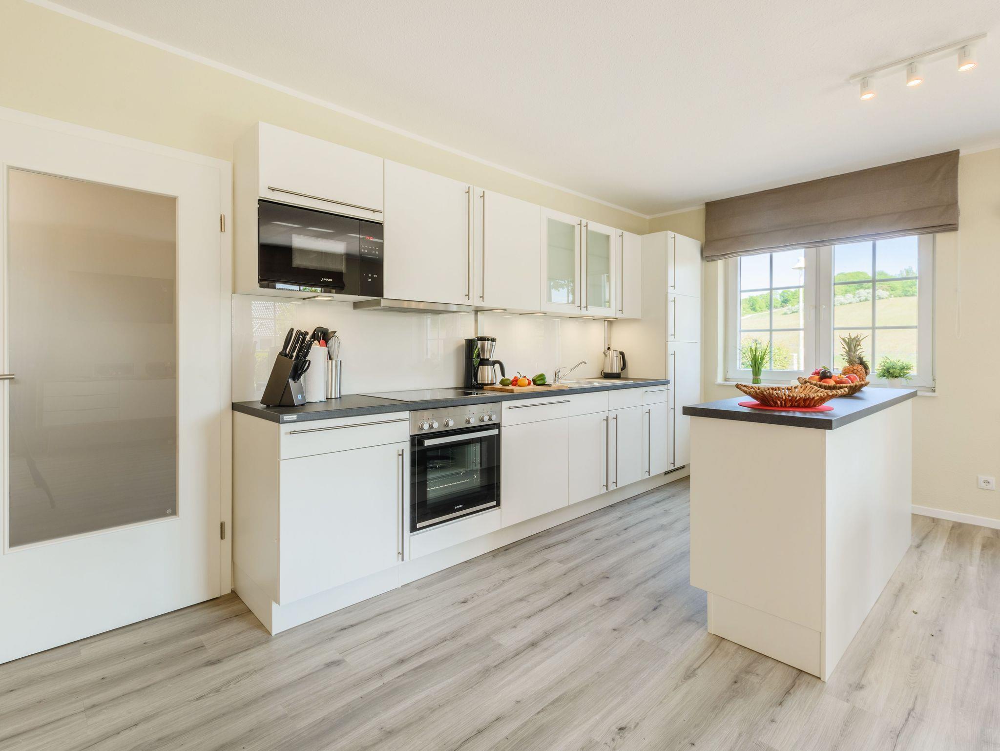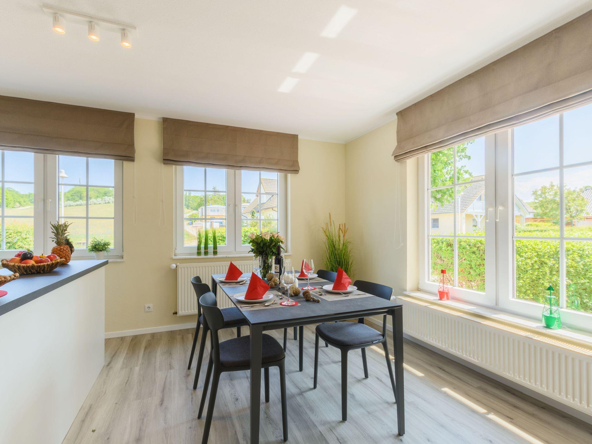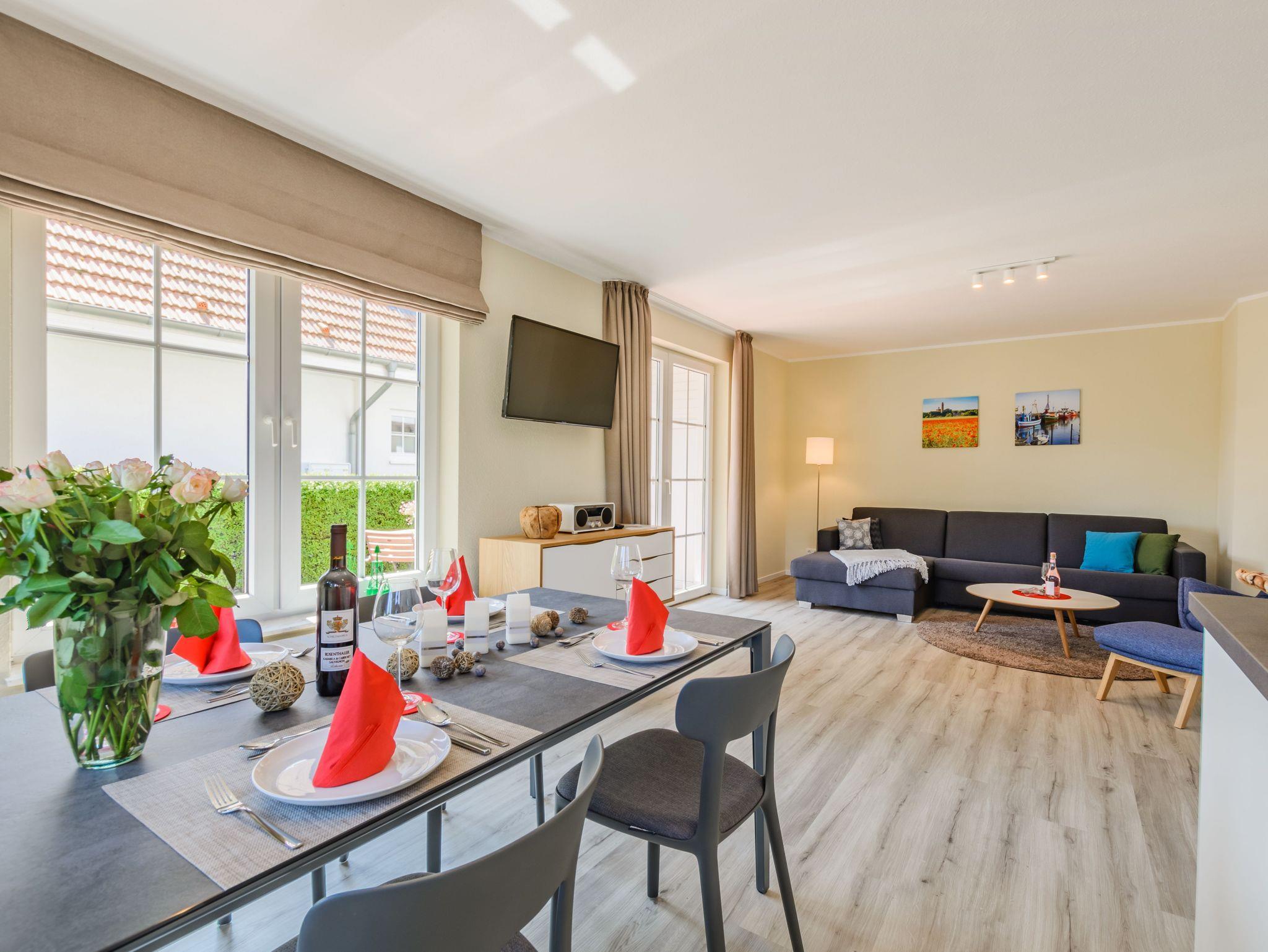Die Nichtraucherferienwohnung befindet sich im Erdgeschoss und erstreckt sich über ca. 60 qm wo sich max. 4 Erwachsene wohlfühlen können. Der großzügige und helle Wohn- Essbereich ist mit einer modernen Küchenzeile ausgestattet. Mit einem Kühlschrank mit Eisfach, Geschirrspüler, Cerankochfeld, Backofen, Mikrowelle, Wasserkocher, Kaffeemaschine, Toaster, Mixer, Waffeleisen können Sie Ihre gemütlichen Kochabende ganz individuell gestalten. Ein passender Essbereich rundet die Gemütlichkeit ab. Im angrenzenden Wohnbereich trägt eine bequeme Couch (Aufbettungsmöglichkeit für 3./4.Person, 1,50m x 1,95m) mit Couchtisch, ein Lesesessel mit Hocker sowie ein TV-Board zu Ihrer Entspannung bei. Die technische Ausstattung umfasst einen Smart-TV, ein DAB-Bluetooth-Radio sowie einen WLAN-Anschluss. Vom Wohnbereich gelangen Sie auf Ihre bestuhlte Terrasse (Süd) mit Sonnenschirm, von wo Sie aus Ihren Tag entspannt bei einem Glas Wein ausklingen lassen können. Hell und freundlich eingerichtet erwartet Sie ein gemütliches Schlafzimmer, mit einem komfortablen Boxspring-Bett (1,80m x 2,00m) mit 5 Zonen Tonnen-Taschenfederkern-Matratzen, Nachttischablagen, einen großzügigen Kleiderschrank sowie ein Smart-TV. Der Schlafbereich verfügt zudem über Vorhänge, die nahezu lichtundurchlässig sind und einen guten Sicht- und Sonnenschutz bieten. Für einen angenehmen Schlaf sorgen zusätzlich Insektenschutzgitter im Wohn- & Schlafbereich. Das Tageslicht-Badezimmer ist mit einer ebenerdigen Dusche, einem WC, einem Fön sowie einem Waschtisch ausgestattet. Im Nachbarhaus C können Sie eine Waschmaschine sowie einen Trockner gegen Gebühr nutzen. Hier stehen auch ein Bügelbrett und ein Bügeleisen zur Verfügung. In der Wohnung finden Sie zusätzlich ein Staubsauger, ein Besen mit Kehrset, ein Wäscheständer sowie ein Wäschekorb. Haustiere sind nicht erlaubt. Das Grillen auf dem ausgewiesenen Gemeinschaftsplatz lädt zu gemütlichen Abenden ein. Zur Entspannung lädt eine münzbetriebene Sauna mit kleinem Ruheraum im Untergeschoss von Haus B ein. Ihre Fahrräder können Sie begrenzt im Gemeinschaftskeller oder auf dem Grundstück abstellen. Ein PKW-Stellplatz steht Ihnen inklusive zur Verfügung. Die Erstausstattung eines Wäschepaketes (komplette Bettwäsche, 1 Duschhandtuch, 2 kleine Handtücher) können Sie bis 14 Tage vor Anreise gegen einen Aufpreis dazu buchen oder durch eigene ergänzen. Ab 2 gebuchten Paketen erhalten Sie einmalig 1 Geschirrhandtuch und 1 Duschvorleger hinzu.