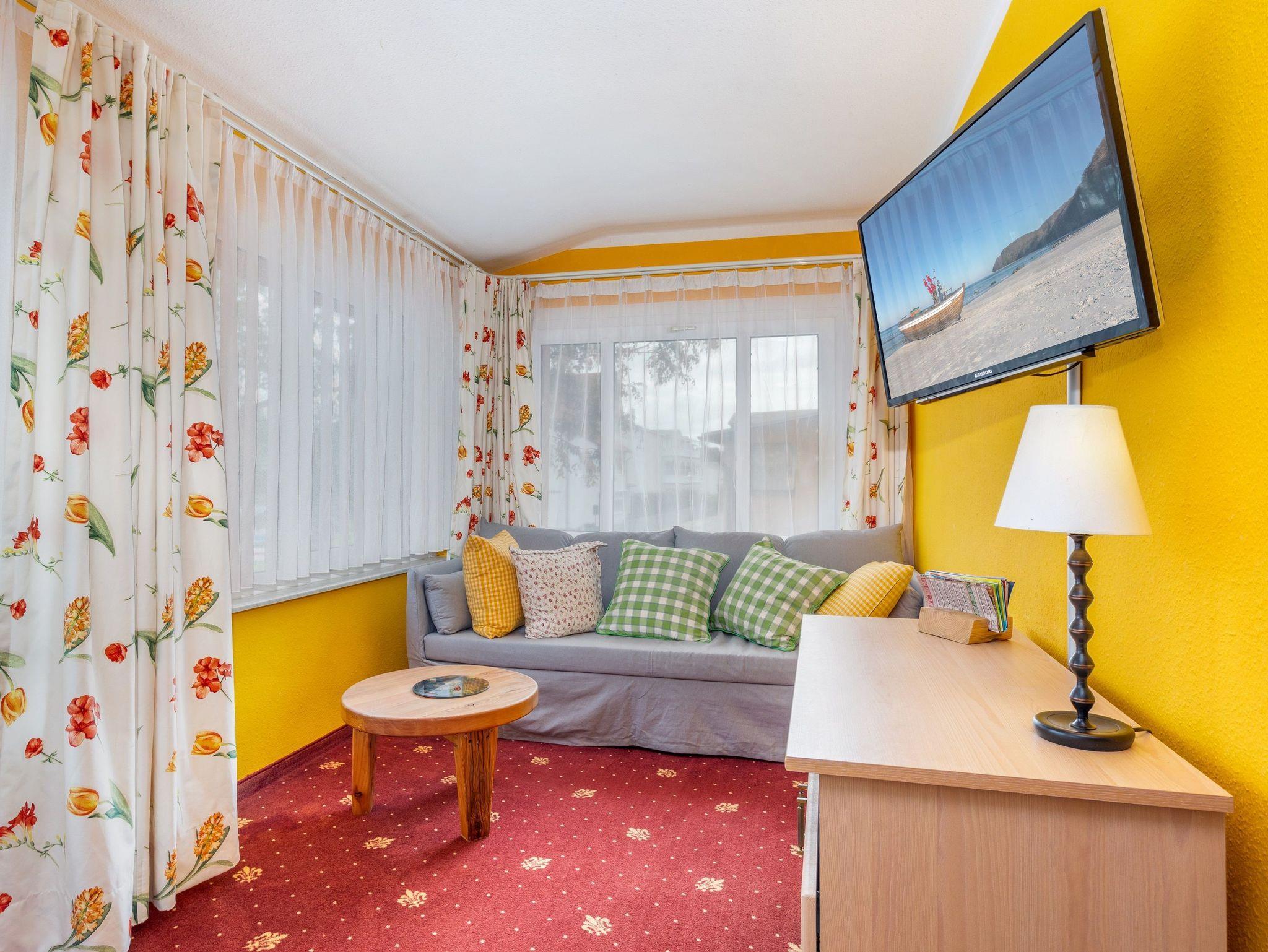 Im kombinierten Wohn-/Schlafraum befinden sich ein bequemes Doppelbett mit Nachttischen und Leselampen sowie ein Kleiderschrank, eine Schlafcouch mit Tisch und ein TV-Gerät. Hier steht auch ein Esstisch mit Stühlen.