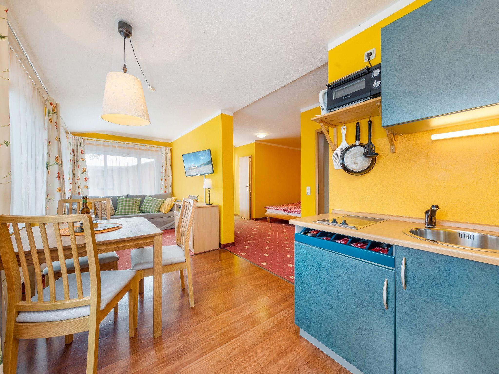 2-3 Pers.: Studio mit 35 m² Wohnfläche, Parterre. Wohn-/Schlafraum mit Esstisch, Pantry-Küche (2 P. E-Herd, Spülmaschine, Minibackofen, Kaffeemaschine, Wasserkocher, 6-Set-Ess-Geschirr und Besteck, kleine Auswahl an Gläsern, kleine Topfsammlung, ein paar kleine Küchenhelfer --- Grundausstattung!!!), Doppelbett, Couchgarnitur (weitere Schlafmöglichkeit 1 Pers.). Bad/WC. Terrasse mit Sitzmöbeln.