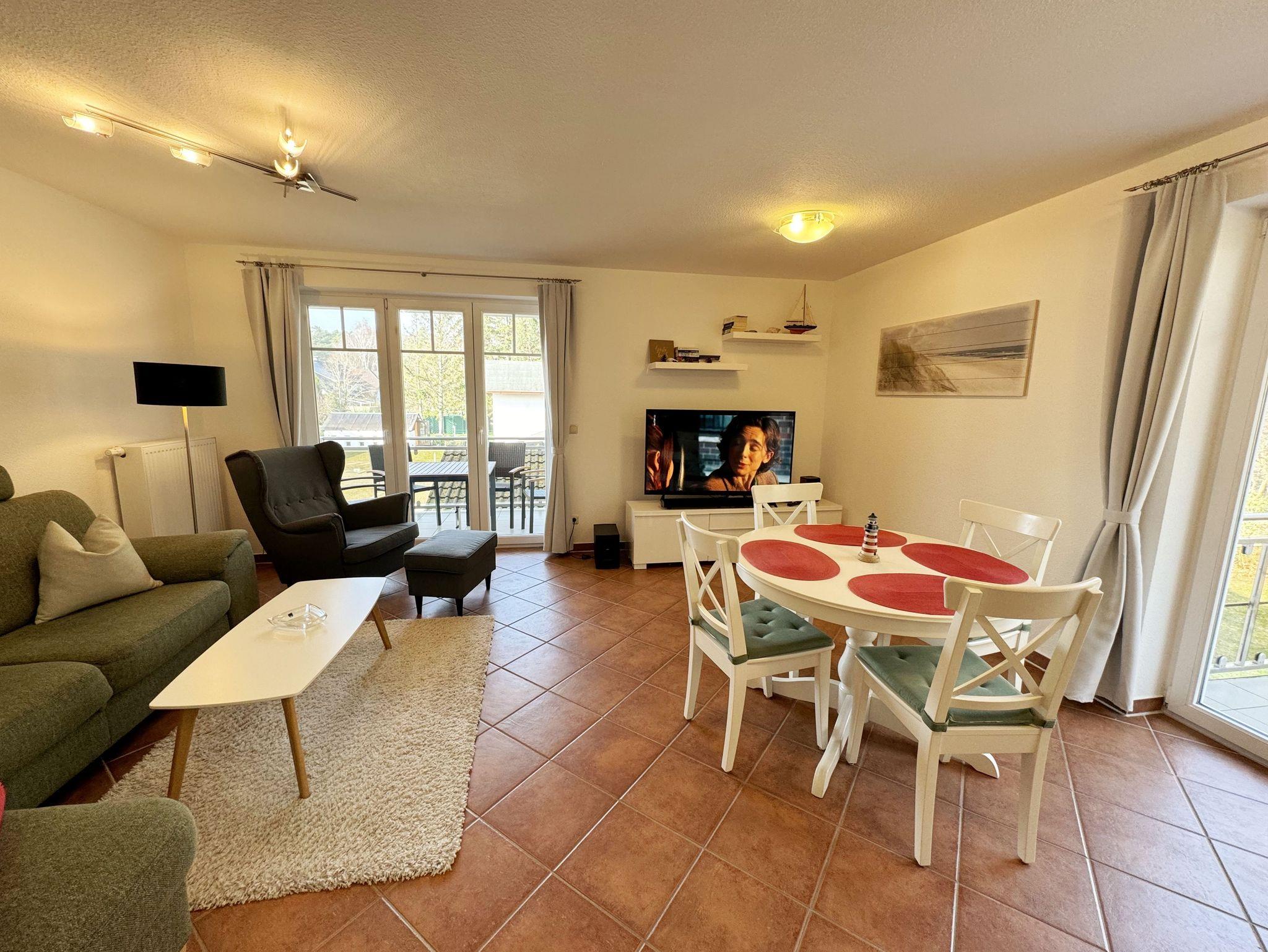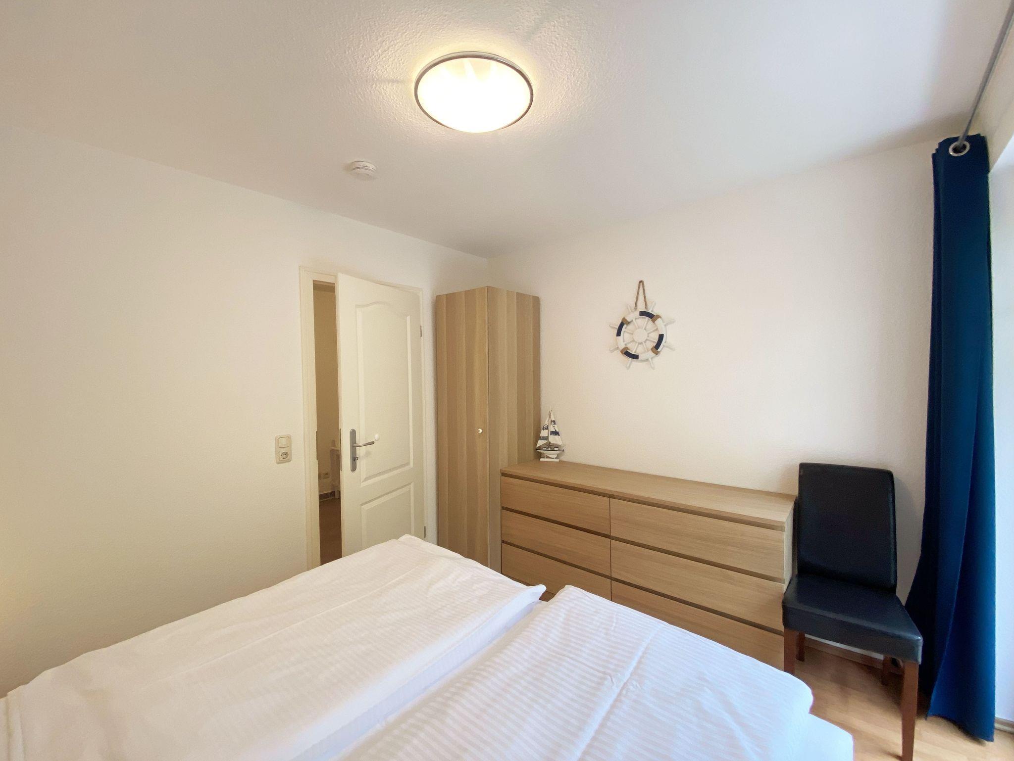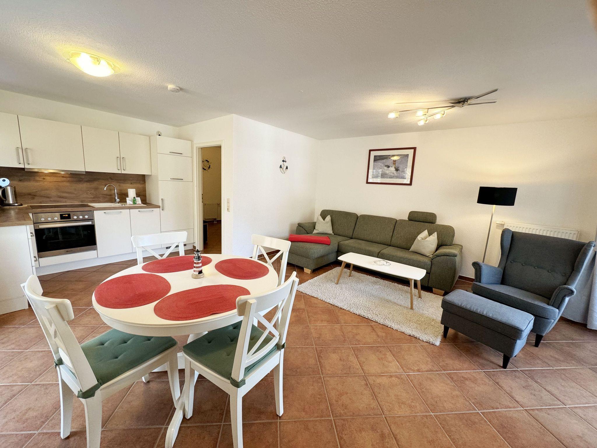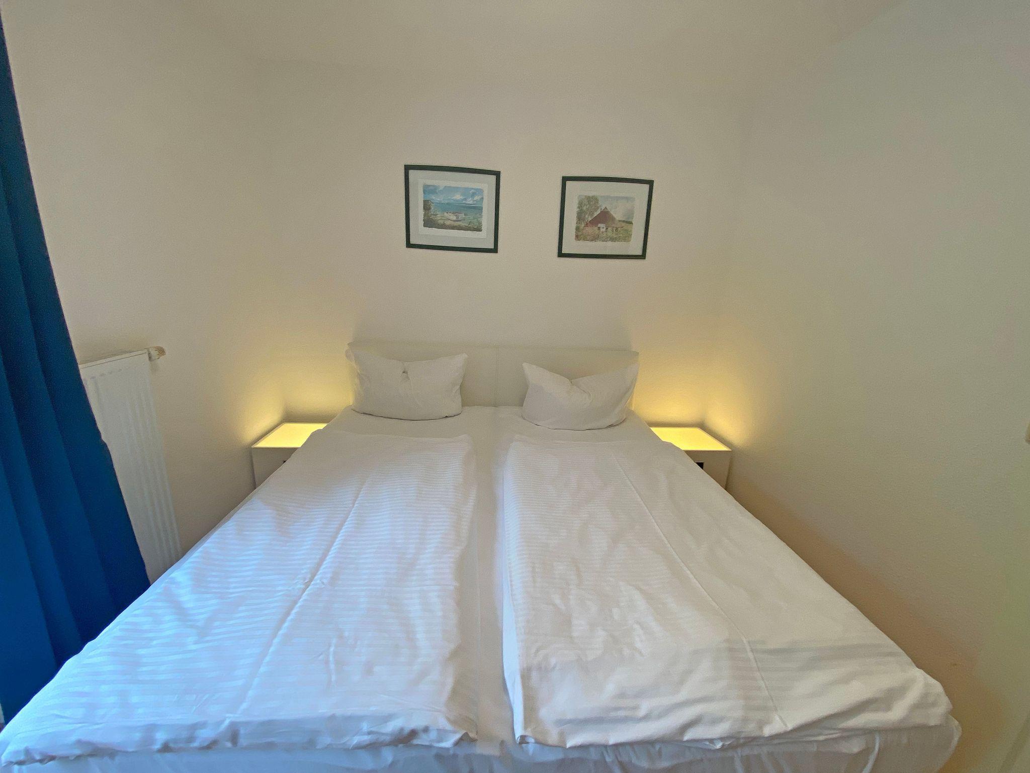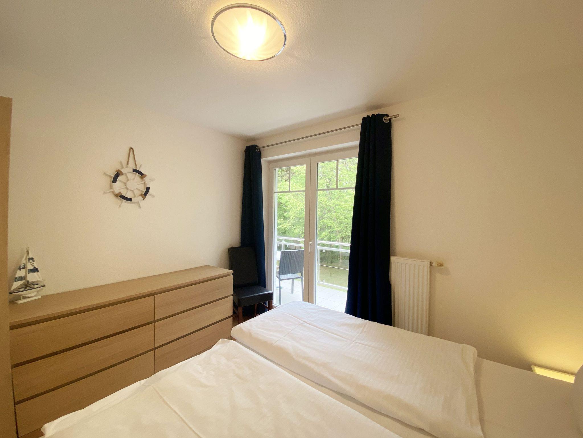Die gemütlich eingerichtete und ruhig gelegene Nichtraucherwohnung mit ca. 55 m² und ist ideal für 2 bis max. 4 Personen geeignet. Die Wohnung 12 befindet sich in der 1. Etage. Der Wohnbereich besteht aus einem Smart-TV, Blue-Ray-Player und Mini-Stereo-Anlage, WLAN, einer Eck-Couch mit Ausziehfunktion für die 3./4. Person (1,15m x 2,20), Couchtisch, einen Ohrensessel mit Hocker, Leselampe sowie einen Esstisch mit 4 Stühlen. Angrenzend zum Wohnbereich finden Sie eine offene Küchenzeile. Diese verfügt über diverse Küchenhelfer wie zum Beispiel einem Ceranfeld mit Backofen, Kühlschrank, Geschirrspüler, Mikrowelle, Wasserkocher, Toaster, Kaffeemaschine, Pad-Maschine (Senseo) und weitere Küchenutensilien. Vom Wohn- und Essbereich aus haben Sie jeweils einen Zugang zum Balkon die beide bestuhlt sind und zusätzlich einen Sonnenschirm und eine Sonnenliege bietet. Das separate Schlafzimmer mit bodentiefen Fenstern ist mit einem Boxspringbett (1,80 m x 2,00 m), Nachttischkonsolen und einem Kleiderschrank ausgestattet. Auch vom Schlafzimmer können Sie auf den östlichen Balkon gelangen. Im innenliegenden Badezimmer runden eine Dusche, WC, Fön und ein Waschtisch den Bereich ab. Alle Räumlichkeiten sind gefliest, außer das Schlafzimmer, in dem Laminat verlegt ist. Insektenschutzgitter befinden sich zusätzlich in allen Räumlichkeiten. Ein PKW-Stellplatz (7B/12) ist für Sie reserviert und befindet sich hinter dem Haus. Für Ihre geliehenen oder auch mitgebrachten Fahrräder ist eine abschließbare Unterstellmöglichkeit vorhanden. Für unsere kleinen Gäste sind 1x Kinderreisebett (ohne Matratze und Bett Inlett) sowie 1x Hochstuhl inklusive. Haustiere nicht erlaubt. Die Erstausstattung eines Wäschepaketes (komplette Bettwäsche, 1 Duschhandtuch, 2 kleine Handtücher) können Sie bis 14 Tage vor Anreise gegen einen Aufpreis dazu buchen oder durch eigene ergänzen. Ab 2 gebuchten Paketen erhalten Sie einmalig 1 Geschirrhandtuch und 1 Duschvorleger hinzu.