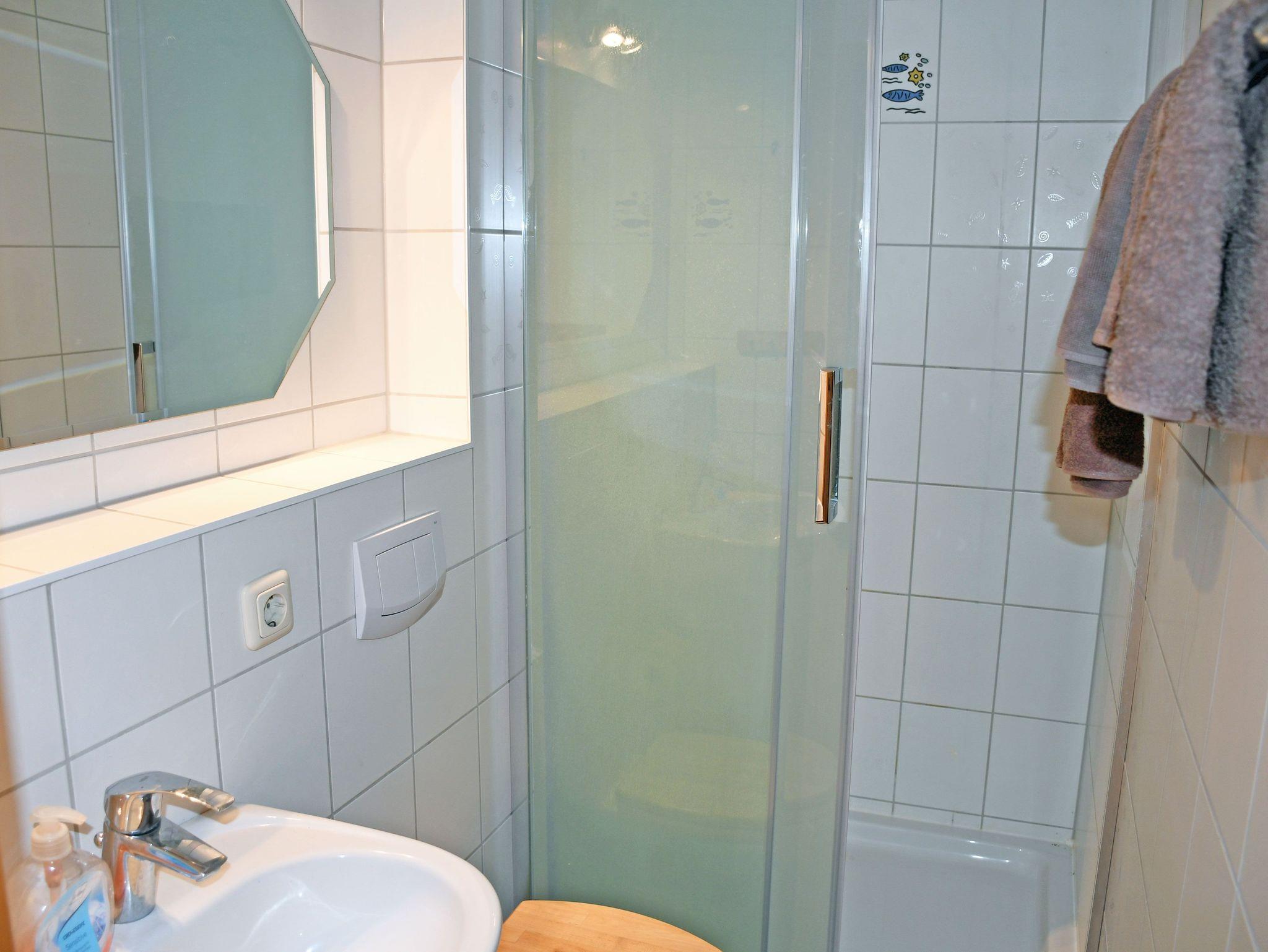 Das Bad ist mit Dusche, WC, Fön und Waschtisch ausgestattet.