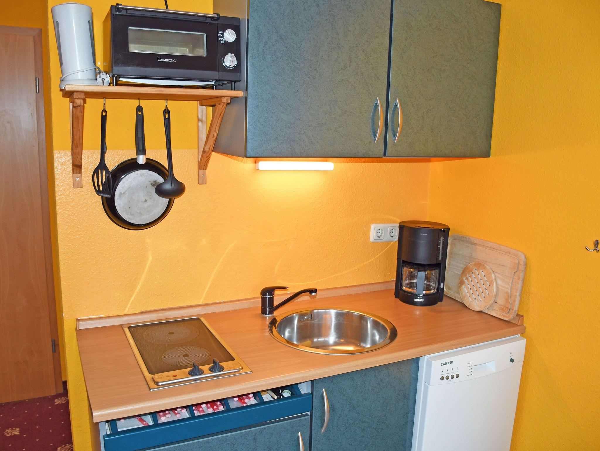 Die Pantry-Küche ist ausgestattet: 2 P. E-Herd, Spülmaschine, Minibackofen, Kaffeemaschine, Wasserkocher, 6-Set-Ess-Geschirr und Besteck, kleine Auswahl an Gläsern, kleine Topfsammlung, ein paar kleine Küchenhelfer --- Grundausstattung!!!