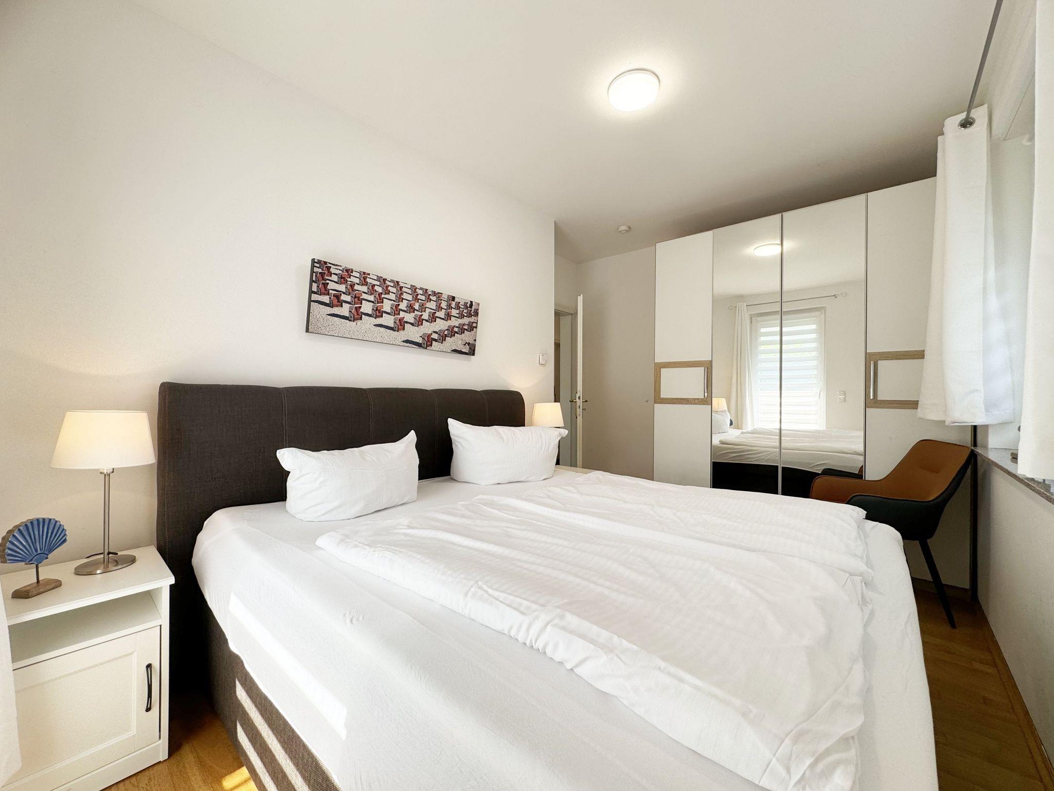 Die helle und großzügige 3-Zimmer-Komfort-Wohnung Nr. 04 im Haus Sanddorn ist modern eingerichtet und besticht durch ihre geschickte Raumaufteilung. Die Nichtraucher-Ferienwohnung mit ca. 67 m² befindet sich im Erdgeschoss des Hauses und bietet Ihnen 2 großen Terrassen. Der Wohnbereich verfügt über eine Eck-Couch (Aufbettungsmöglichkeit 5.Person /1,30m x 2,00m), einen Couchtisch, einen Lesesessel mit Hocker sowie ein TV-Board mit Smart-TV, Blu-Ray-Player und DAB-Radio mit USB, Bluetooth und CD-Player. Ein WLAN-Zugang rundet den technischen Bereich ab. An Gesellschaftsspiele und Urlaubslektüre wurde auch gedacht. An kühleren Tagen sorgt der Kamin für wohlige Wärme und die entsprechende Gemütlichkeit. Kaminholz können Sie gerne dazu buchen. Die angrenzende Küchenzeile fügt sich harmonisch an den Wohnbereich an. Um jede Mahlzeit zu genießen, steht Ihnen ein Kühlschrank mit Gefrierfach, ein Backofen, ein Cerankochfeld, eine Spülmaschine, eine Mikrowelle, eine Kaffeemaschine, eine Nespresso Maschine, ein Toaster, ein Wasserkocher sowie diverse Küchenutensilien zur Verfügung. Ein bequemer Essplatz rundet den Bereich ab. Vom Wohn-/Essbereich kommen Sie auf Ihre bestuhlte und überdachte Terrasse (Osten/Süden). Ein Sonnenschirm, sowie 2 Sonnenliegen, ein Strandkorb und ein Grill sorgen für die richtige Entspannung. Das 1. Schlafzimmer verfügt über ein Boxspringbett (1,80m x 2,00m), Nachttischablagen mit Beleuchtung, einen Kleiderschrank sowie ein Flachbild-TV mit integrierten DVD-Player. Hier haben Sie zusätzlich die Möglichkeit auf eine der zwei Terrassen zu gelangen. Das 2. Schlafzimmer verfügt über ein Boxspringbett (1,60m x 2,00m), Nachttischablagen mit Beleuchtung, einen Kleiderschrank, Insektenschutzgitter sowie ein Flachbild-TV. Auch hier haben Sie zusätzlich die Möglichkeit auf eine der zwei Terrassen zu gelangen. Für einen ruhigen und erholsamen Schlaf sorgen in beiden Schlafzimmern Aussenrollo´s welche Sie in der gesamten Wohnung vorfinden. Das Tageslichtbad ist mit einer ebenerdigen Dusche, einem WC, einer Waschmaschine mit integriertem Trockner, einem Waschplatz, einem Kosmetikspiegel, einem Fön, einem Ablagestuhl sowie Ablageflächen ausgestattet. In der gesamten Wohnung sorgt eine Fußbodenheizung für angenehme Wärme. Für unsere kleinen Gäste steht Ihnen 1x Kinderhochstuhl inklusive zur Verfügung. Ein Kinderreisebett kann dazu gebucht werden bzw. von zu Hause mitgebracht werden. Ihre mitgebrachten oder geliehenen Fahrräder können Sie in dem zu Ihrer Wohnung gehörenden Schuppen (Nr.04) verschließen.1 Haustier ist mit eigenem Schlafplatz gegen eine Gebühr ein gern gesehener Gast. Es besteht eine Leinenpflicht auf dem Grundstück. Ein PKW-Stellplatz Nr. 04 befindet sich direkt am Objekt. Die Erstausstattung eines Wäschepaketes (komplette Bettwäsche, 1 Duschhandtuch, 2 kleine Handtücher) können Sie bis 14 Tage vor Anreise gegen einen Aufpreis dazu buchen oder durch eigenes Ergänzen. Ab 2 gebuchten Paketen erhalten Sie einmalig 1 Geschirrhandtuch und 1 Duschvorleger hinzu.