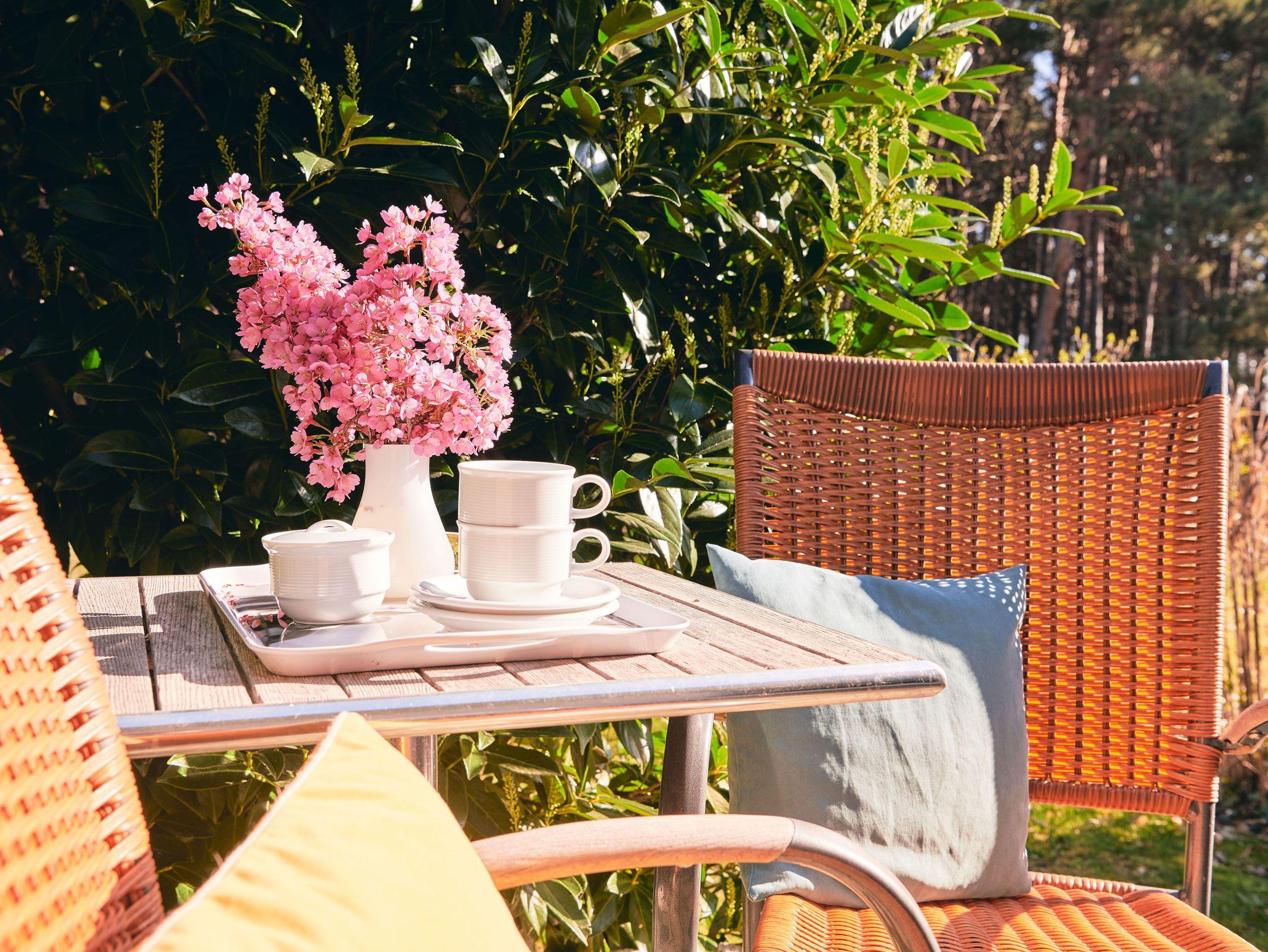 Das Appartement hat Zugang zu einem 420 qm großen eigenen eingezäunten Garten. Auf der sonnigen Terrasse kann der Tag mit einem ausgiebigen Frühstück beginnen. Ihr eigener Parkplatz ist ca. 60 m vom Haus entfernt.