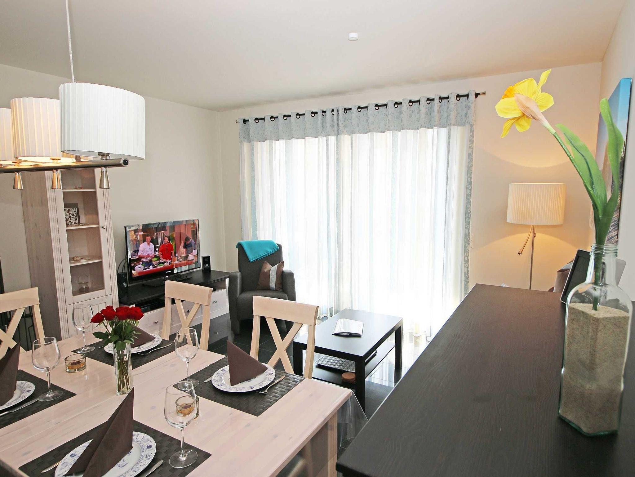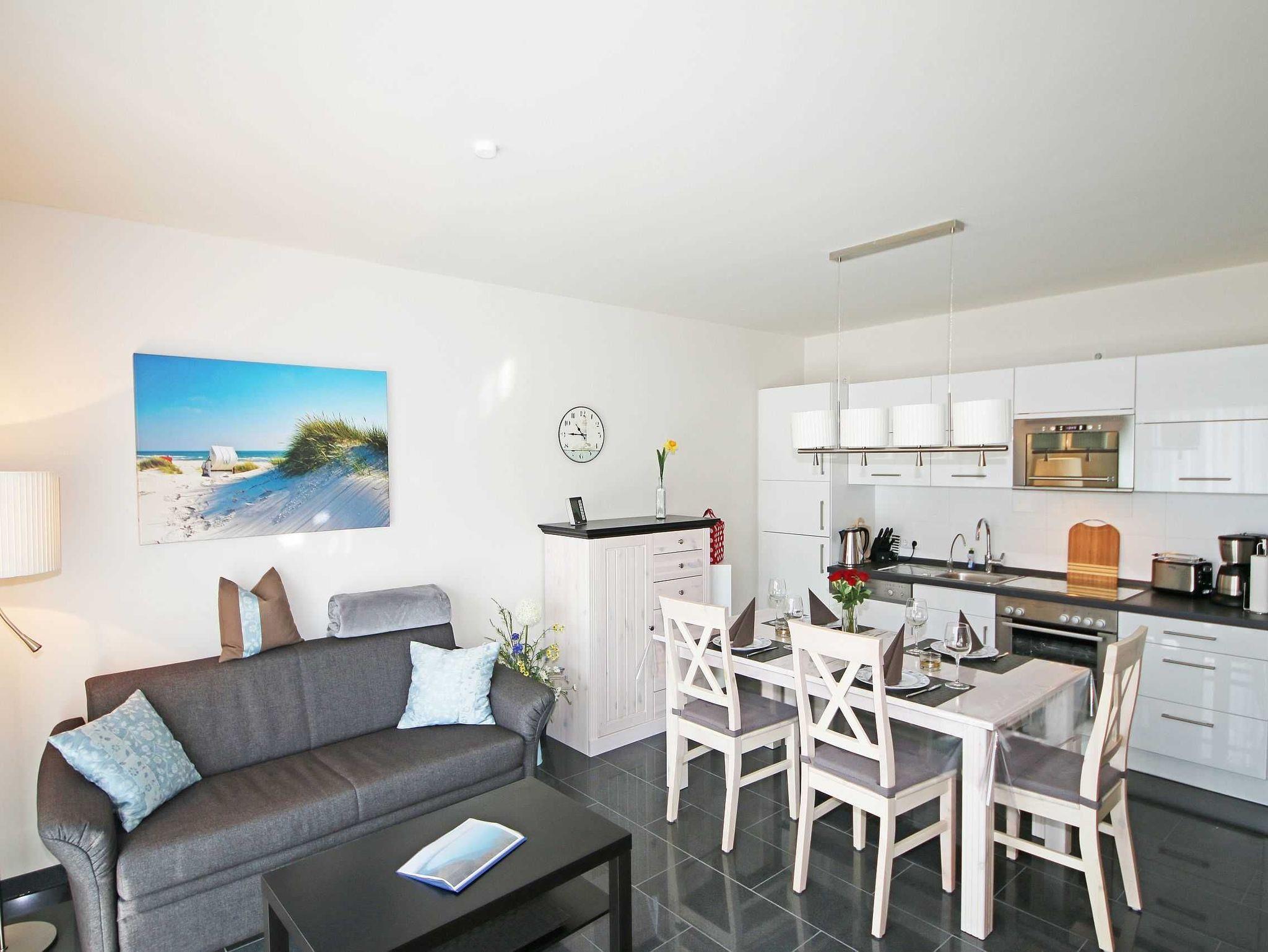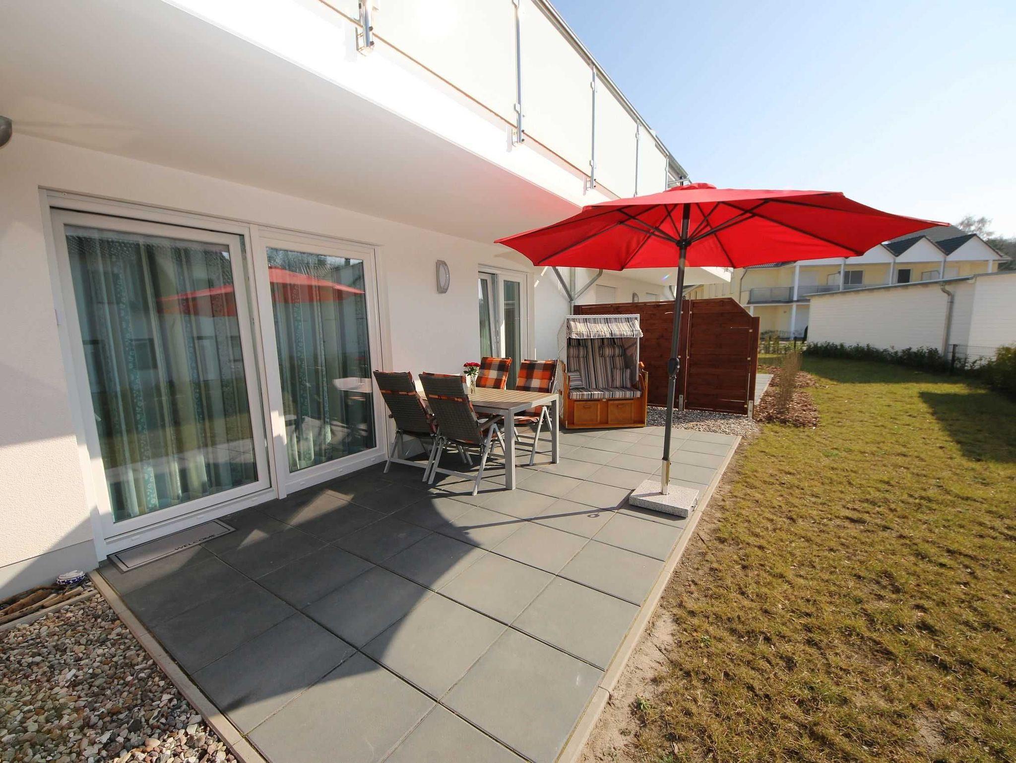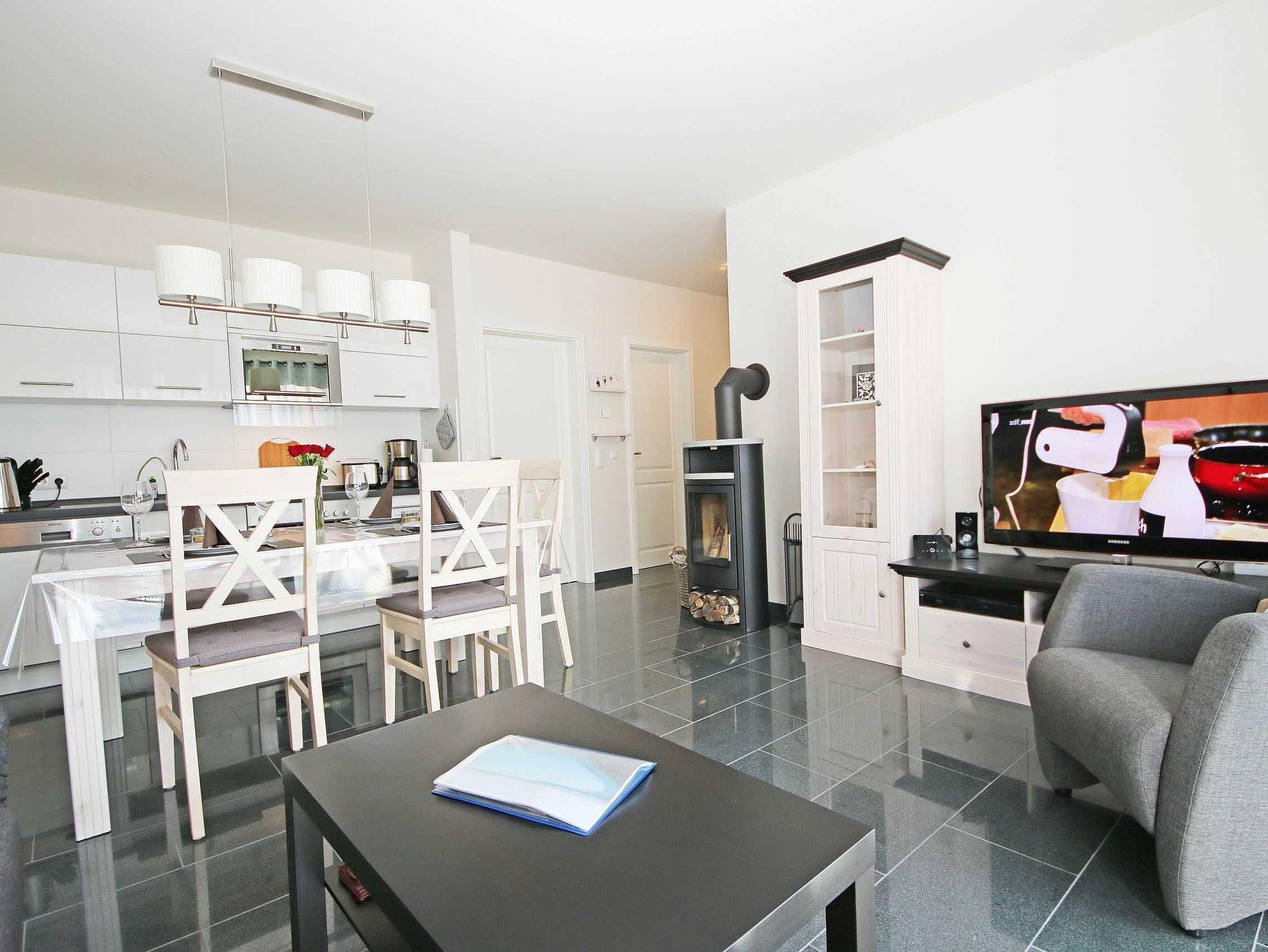 Modernes Appartement mit Kamin, Terrasse und Strandnähe auf Mönchgut, ideal für entspannte Tage am Meer.
