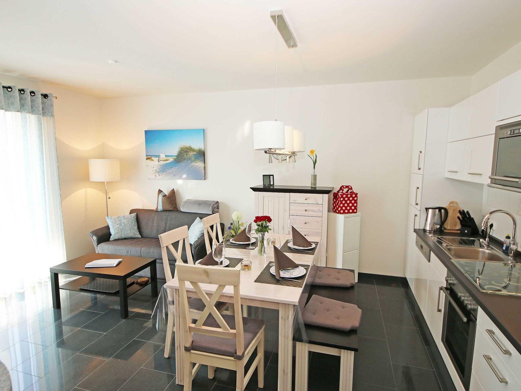 Das 3-Raumappartement (Nichtraucher) befindet sich in Parterre und bietet mit ca. 61 qm ausreichend Platz für bis zu 4 Personen. Die Wohnung ist im gehobenen Standard eingerichtet. An kälteren Abenden sorgt ein Kaminofen für eine wohlige Wärme und gemütliche Atmosphäre. Das Brennholz (solange der Vorrat reicht) steht Ihnen inklusive zur Verfügung. In der Ferienwohnung wurde ein hochwertiger Granitfußboden verarbeitet sowie in den beiden Schlafzimmern ein hochwertiger Parkettboden verlegt. An jedem Fenster wurde Insektenschutz angebracht sowie elektrische Rollläden. Der Wohnraum ist mit einer gemütlichen Couch, Leselampe, Smart-TV, Blu-Ray-Player, WLAN (inklusive) und einer Stereoanlage mit DAB-Radio ausgestattet. Von dem Wohnzimmer sowie vom 2. Schlafzimmer aus gelangen Sie auf die bestuhlte Terrasse mit Sonnenschirm, Strandkorb, Sonnenliege sowie Grill. Von hier aus Blicken Sie in Richtung Süden. Die offene und exklusive Küche ist im Wohnbereich integriert und komplett ausgestattet. Küchengeräte wie Ceranfeld, Backofen, Geschirrspüler, Kühlschrank mit Gefriermöglichkeit, Mikrowelle sowie Kaffeemaschine, Wasserkocher, Toaster und eine gemütliche Essecke wie auch weitere diverse Küchenutensilien runden den Koch- und Küchenbereich ab. In den Schlafzimmern befinden sich je ein Doppelbett (Bettenmaße: Schlafzimmer 1 - 1,80 m x 2,00 m / Schlafzimmer 2 - 1,40 m x 2,00 m), Nachttischkonsolen und ein Kleiderschrank. Das Tageslichtbad rundet mit einer Dusche, Waschtisch, Kosmetikspiegel, Fön und einem WC den Sanitärbereich ab. Für unsere kleinen Gäste steht 1x Kinderreisebett (ohne Matratze und Bett-Inlett) inklusive zur Verfügung. Zusätzlich steht Ihnen eine Waschmaschine zur Verfügung, die zur Nutzung inklusive ist. Ihre mitgebrachten bzw. gemieteten Fahrräder können Sie in einem für die Wohnung vorgesehen Abstellraum verwahren. Ein für Sie reservierter PKW-Stellplatz Nr. 03 ist ebenso vorhanden. Haustiere sind nicht erlaubt. Die Erstausstattung eines Wäschepaketes (komplette Bettwäsche, 1 Duschhandtuch, 2 kleine Handtücher, 2 Geschirrhandtücher) können Sie bis 14 Tage vor Anreise gegen einen Aufpreis dazu buchen oder durch eigene ergänzen.