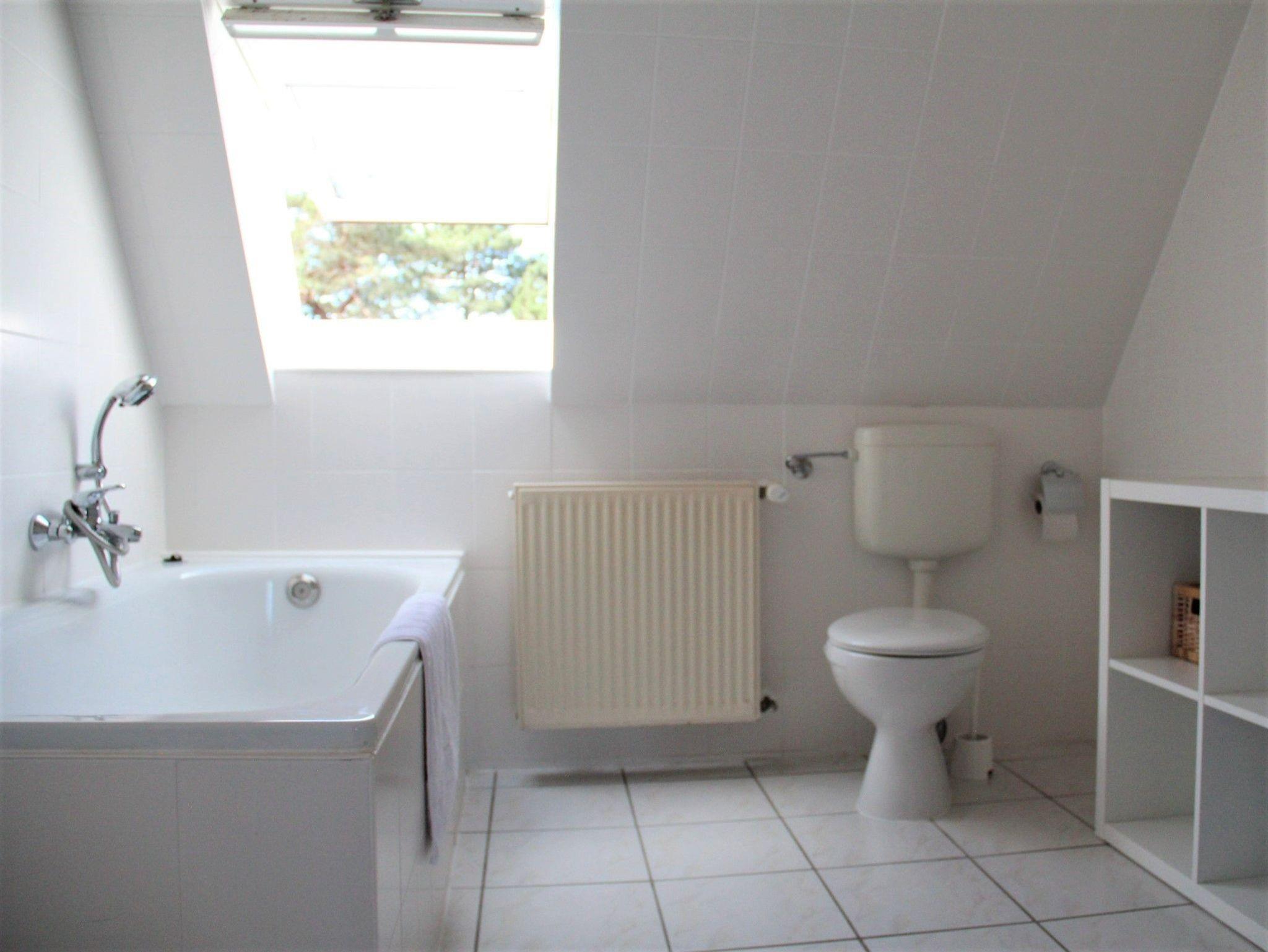 Im Obergeschoss befindet sich ein zweites Schlafzimmer mit Doppelbett (zwei Matrazen) und ein großes Badezimmer mit Badewanne und WC. Das Obergeschoss steht bei Buchung ab 3 Personen zur Verfügung. WLAN ist vorhanden.