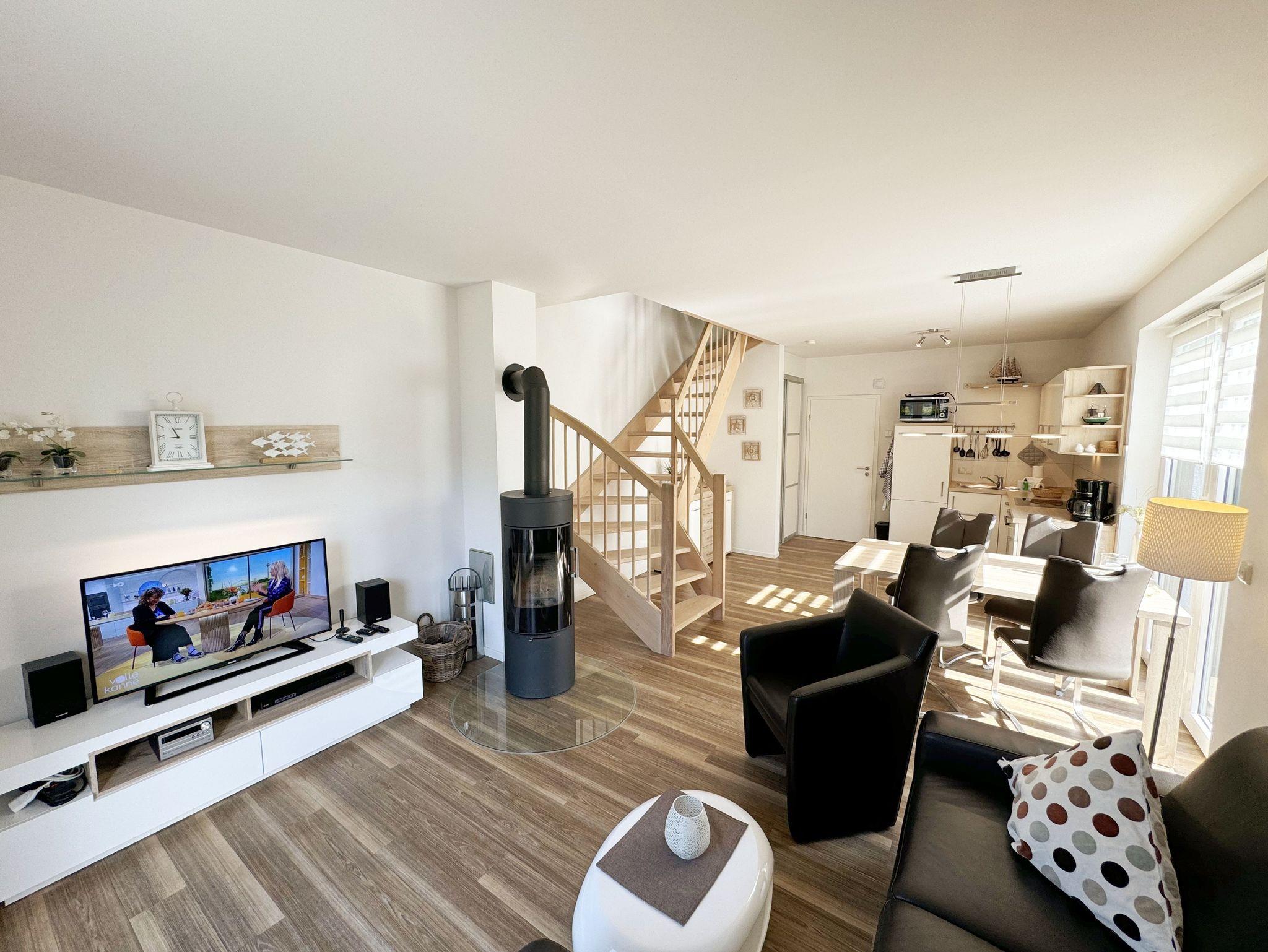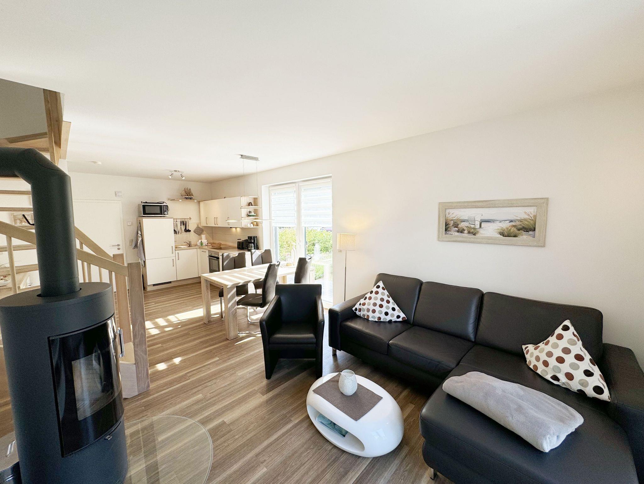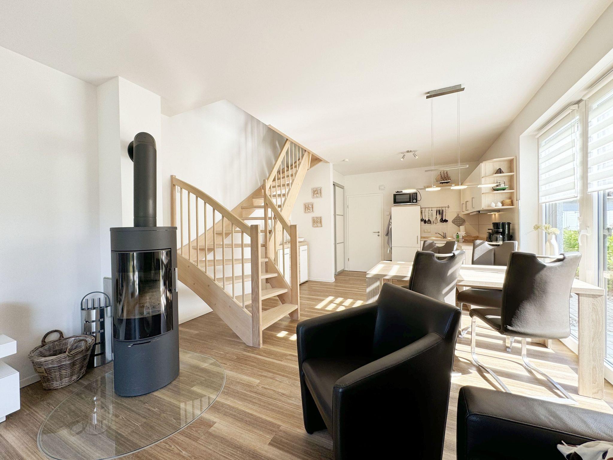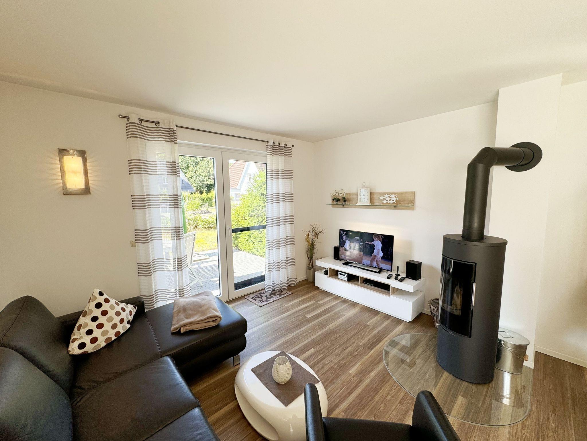Modern eingerichtete Ferienwohnung mit Kamin und Südterrasse in Thiessow nahe Ostseestrand.