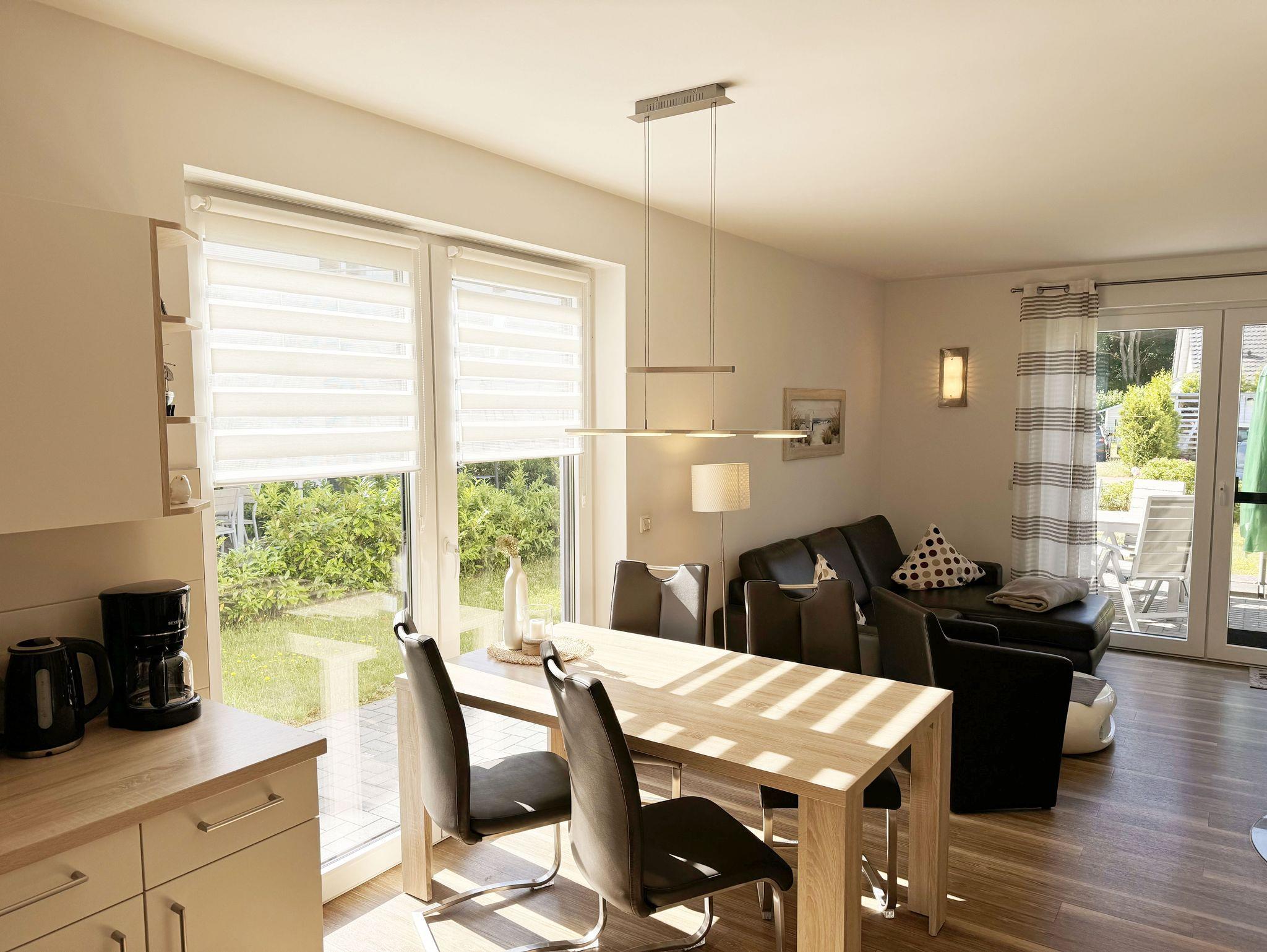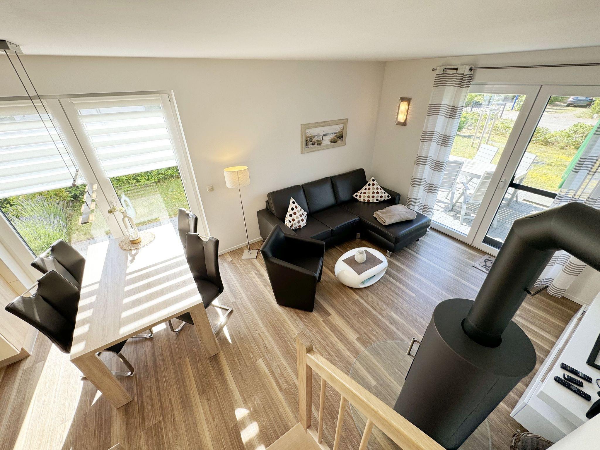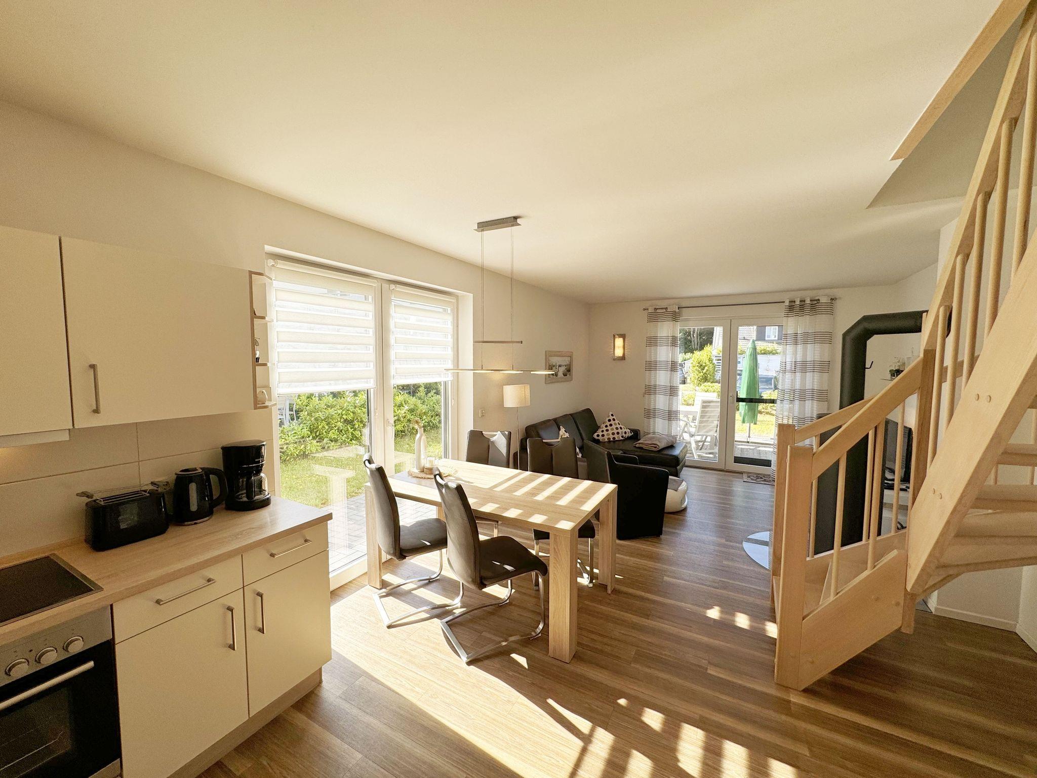Modern eingerichtete Ferienwohnung mit Kamin und Südterrasse in Thiessow nahe Ostseestrand.