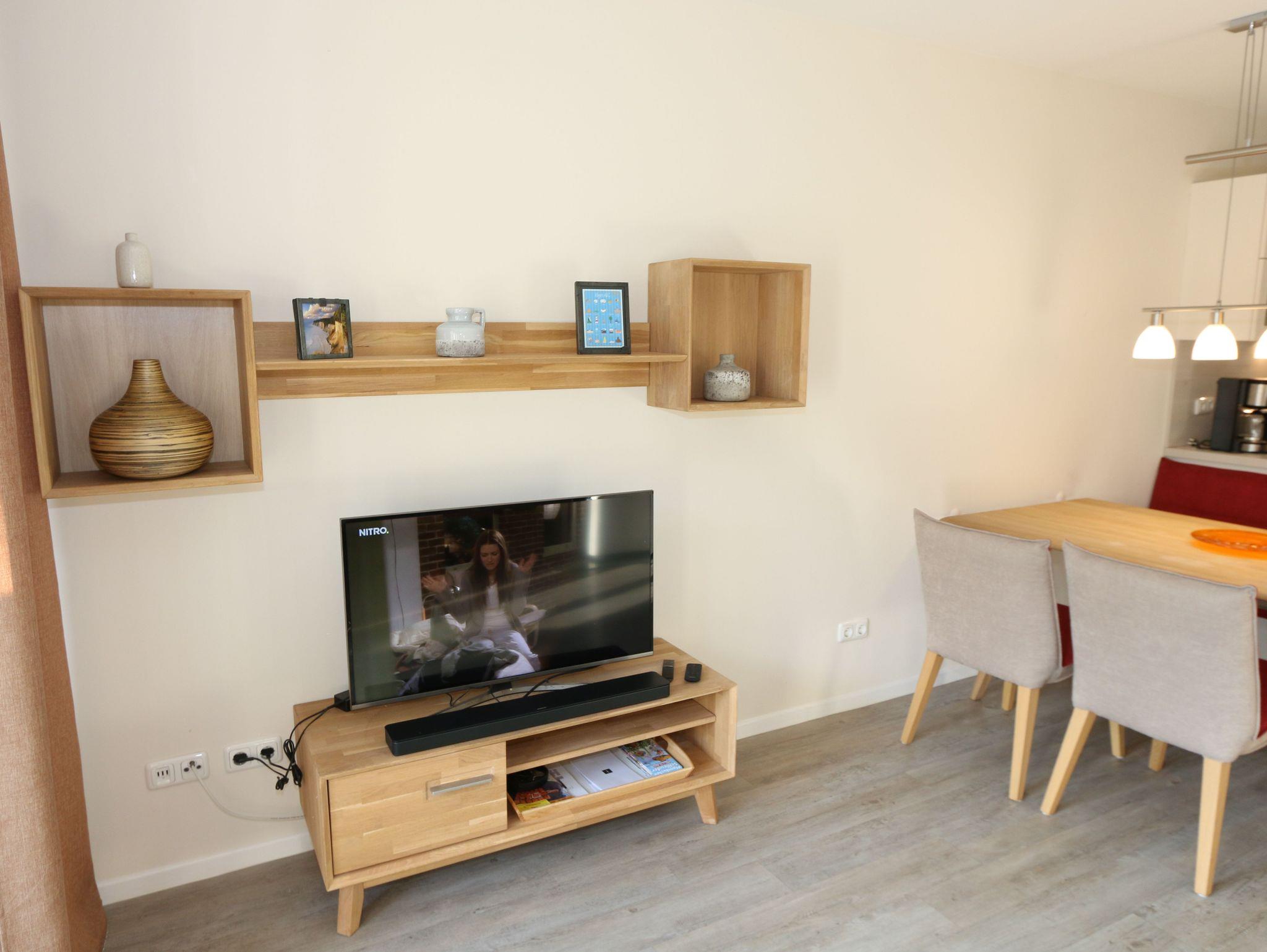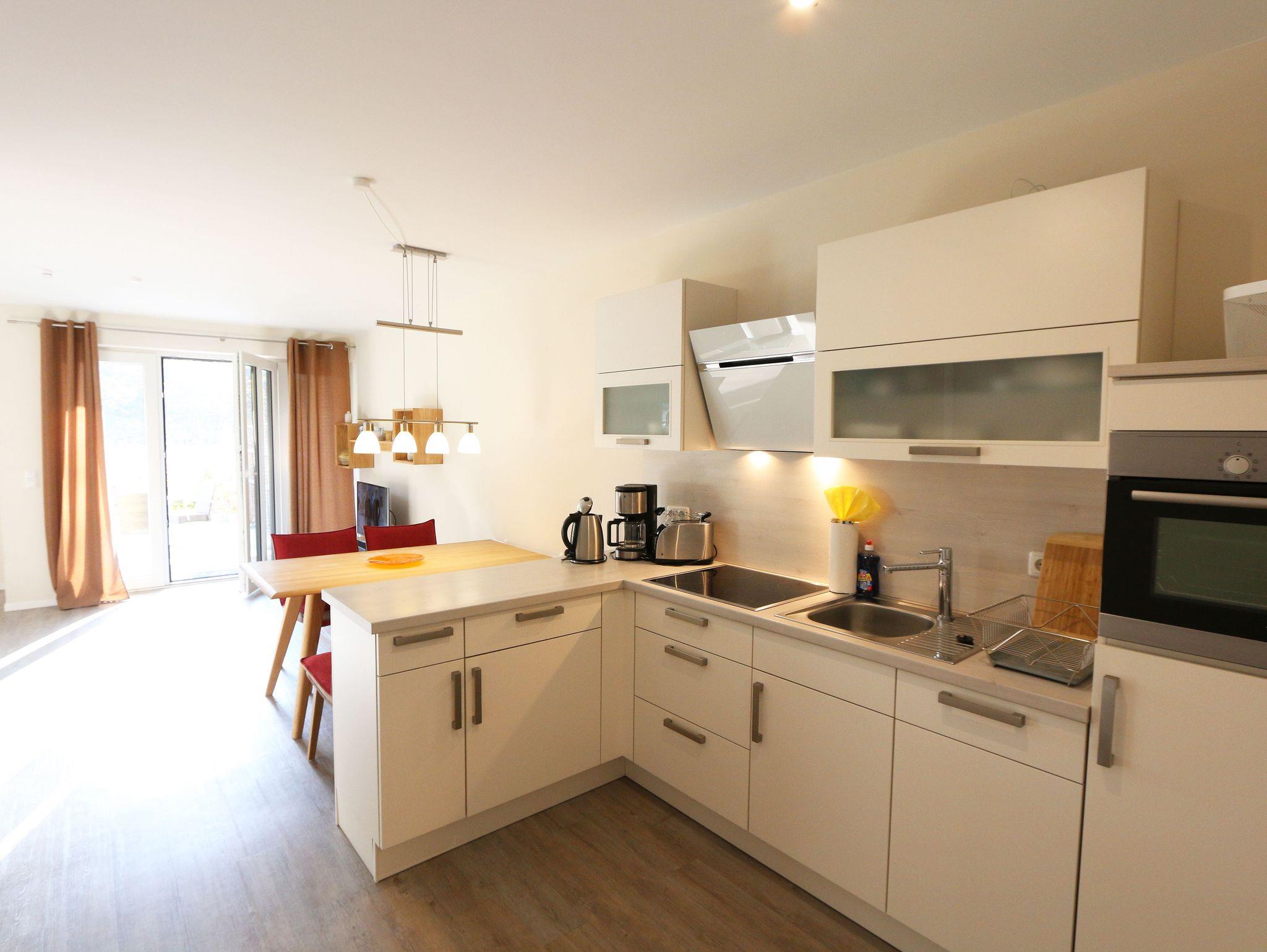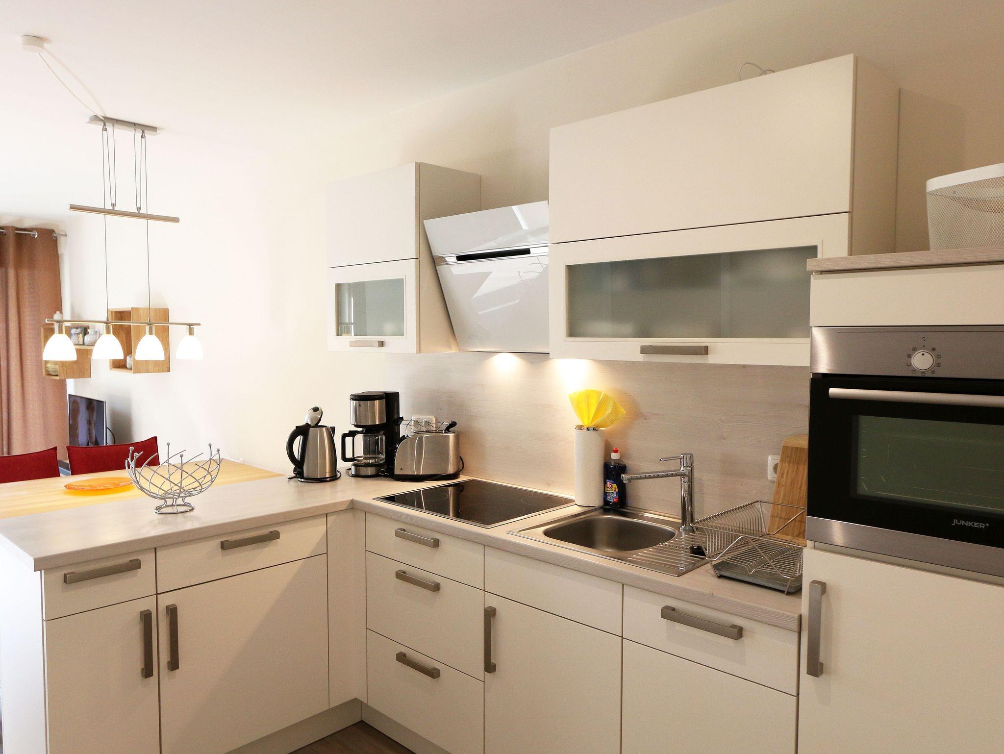 Die geschmackvolle im Erdgeschoß liegende Nichtraucherwohnung bietet Ihnen mit Ihren ca. 78qm ausreichend Platz für max. 2 bis 3 Erwachsene + 1 Kleinkind bis 3 Jahre im Kinderreisebett. Der offene, in maritimen Farben eingerichtete Wohnbereich ist mit hochwertigen und modernen Massivholzmöbeln ausgestattet. Eine Couch (Aufbettung für 3.Person 0,90m x 2,00m), ein Couchtisch, zwei Leselampe, ein Kamin Pelletofen für die kältere Jahreszeit, ein TV-Board mit Smart-TV sowie eine Bose Soundbar runden den Wohnbereich ab. Auch auf einen Internetanschluss (WLAN) müssen Sie nicht verzichten und somit können Sie die gängigen Streamingdienste am Smart-TV mit Ihrem Zugang nutzen. Dieser ist für Sie inklusive. Die angrenzende Küchenzeile passt sich dem Raum mit einem bequemen Essbereich an. Durch einen Kühlschrank mit Gefrierfach, eine Spülmaschine, einen Backofen, einem 4 Zonen-Cerankochfeld, eine Kaffeemaschine mit Thermoskanne, Nespresso Maschine mit Aufschäumer, einen Toaster, einen Wasserkocher und diverse Küchenhelfer lässt die Ausstattung für die gemeinsamen Mahlzeiten keine Wünsche offen. Auf die große und bestuhlte Terrasse mit Sonnenschirm und einem Weber-Holzkohlegrill, welche einmal nach Osten und nach Süden ausgerichtet ist, gelangen Sie vom Wohnbereich. Hier können Sie nicht nur in Ruhe Ihre Mahlzeiten genießen, sondern auch den Tag bei einem Glas Wein ausklingen lassen. Der dazugehörige kleine Garten kann gerne für ein König Spiel oder ein Federball Match genutzt werden oder einfach nur zum Genießen. Das Schlafzimmer ist mit einem Boxspringbett (1,80m x 2,00m), durchgehendem Topper, Nachttischablagen, einem Kosmetiktisch, Kleiderablage, sowie einem Kleiderschrank ausgestattet. Für einen ruhigen und angenehmen Schlaf sorgen zudem die Insektenschutzrollos sowie die Fensterläden, welche Sie auch in den anderen Räumlichkeiten wiederfinden. Das innenliegende Bad verfügt über eine ebenerdige Regendusche, einen Waschtisch, ein WC, einen Kosmetikspiegel, eine Waschmaschine, einen Fön und beheizbaren Handtuchtrockner. Alle Räumlichkeiten sind mit einer Fußbodenheizung versehen und sorgen somit für ein angenehmes Raumklima. Im wohnungseigenen Abstellraum befindet sich ein Wäscheständer, ein Staubsauger sowie weitere Reinigungshelfer. Gerne darf Ihr 4-Beiner mit eigenem Schlafplatz gegen eine Gebühr mitreisen. Ein PKW-Stellplatz (Nr. 02) befindet sich direkt vor dem Haus. Im dazugehörigen Schuppen (Nr.02) können Sie gerne Ihre mitgebrachten Fahrräder unterstellen und Ihre E-Bikes aufladen. Die Erstausstattung eines Wäschepaketes (komplette Bettwäsche, 1 Duschhandtuch, 2 kleine Handtücher) können Sie bis 14 Tage vor Anreise gegen einen Aufpreis dazu buchen oder durch eigene ergänzen. Ab 2 gebuchten Paketen erhalten Sie einmalig 1 Geschirrhandtuch und 1 Duschvorleger hinzu.