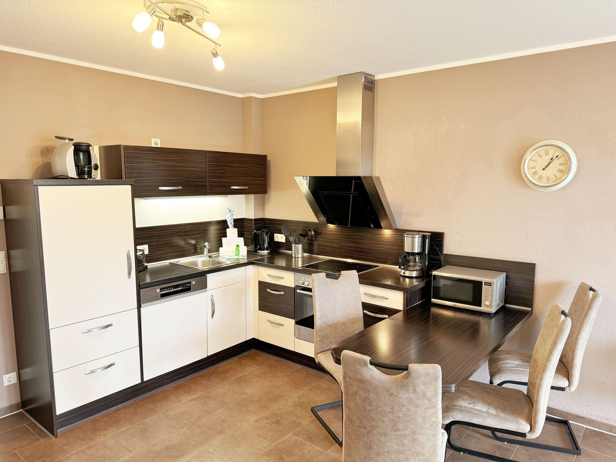 Die Nichtraucherferienwohnung Nr. 04 befindet sich im Erdgeschoss des Hauses und verfügt über eine Wohnfläche von ca. 50 qm. Die Ferienwohnung ist für 2 bis 4 Personen ausgelegt. Im kombinierten Wohn- und Essbereich befindet sich integrierte Küchenzeile. Die komplett ausgestattete Küchenzeile verfügt über ein Cerankochfeld, Backofen, Dunstabzugshaube, Kühlschrank mit Gefrierfach, Spülmaschine, Kaffeemaschine, Mikrowelle, Wasserkocher, Toaster und weitere diverse Küchenutensilien. Der Esstisch mit Bestuhlung ist für 4 Personen geeignet. Vom Wohnbereich aus gelangen Sie durch die Terrassentür auf die Terrasse. Das im Wohnbereich vorhandene Schlafsofa verfügt über eine Ausziehfunktion (1,30m x 2,00m) und kann von 2 Personen gut genutzt werden. Ein kleiner Couchtisch, Leselampe, TV-Board mit Smart-TV, Receiver, DVD/Blu-Ray-Player und Ministereoanlage runden den Wohnbereich ab. Auch im Urlaub brauchen Sie auf einen Internetanschluß (WLAN) nicht verzichten. Dieser ist für Sie inklusive. Das im Schlafbereich vorhandene Doppelbett hat eine Größe von 1,80m x 2,00m, Nachttischkonsolen und einen Kleiderschrank, der für die Unterbringung der Kleidung im Schlafbereich sorgt. Das Bad rundet mit einem WC, Waschbecken, Kosmetikspiegel, Fön, Dusche, und Handtuchwärmeheizkörper die Wohnung komplett ab. In allen Räumen sorgt eine Fußbodenheizung für angenehme Wärme. Die wohnungseigene Terrasse verfügt über einen Terrassentisch + 4 Stühlen, Elektrogrill und ist Richtung Süd/West ausgerichtet. Die Fenster haben Außenjalousien. Ein eigener PKW-Stellplatz Nr. 04 befindet sich auf dem Grundstück, mitgebrachte oder gemietete Fahrräder können im wohnungseigenen Abstellraum untergestellt werden. 1 gut erzogenes Haustier ist gegen eine Gebühr ein gern gesehener Gast. Die Erstausstattung eines Wäschepaketes (komplette Bettwäsche, 1 Duschhandtuch, 2 kleine Handtücher) können Sie bis 14 Tage vor Anreise gegen einen Aufpreis dazu buchen oder durch eigene ergänzen. Ab 2 gebuchten Paketen erhalten Sie einmalig 1 Geschirrhandtuch und 1 Duschvorleger hinzu.