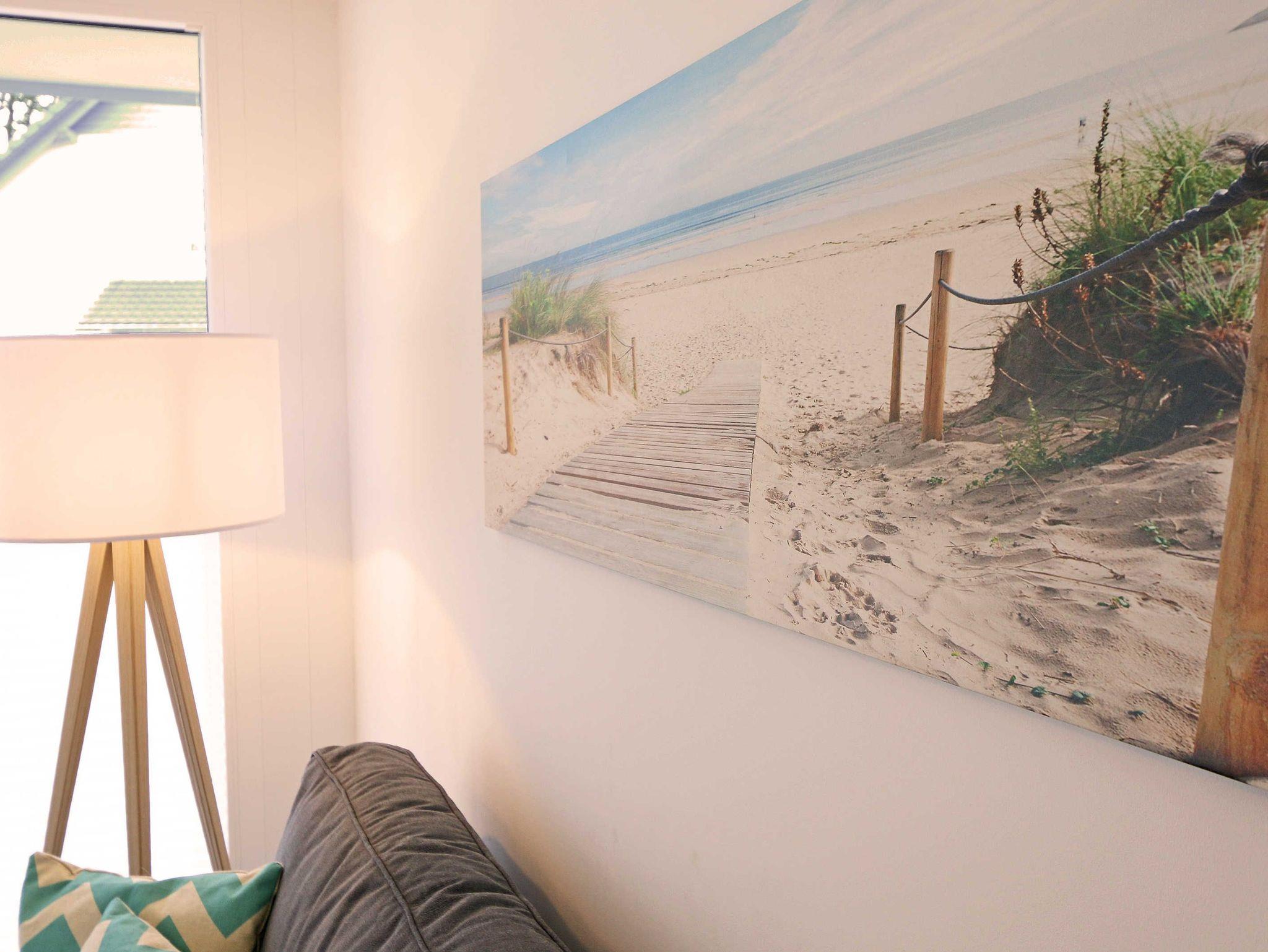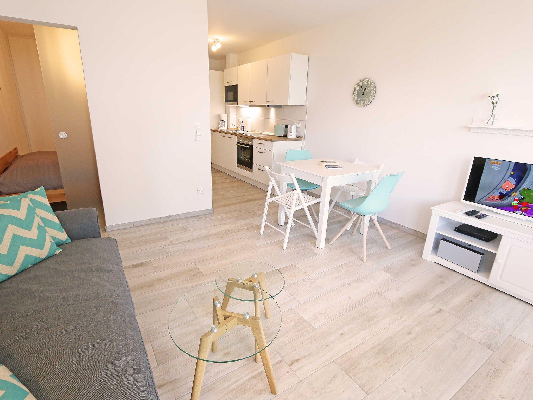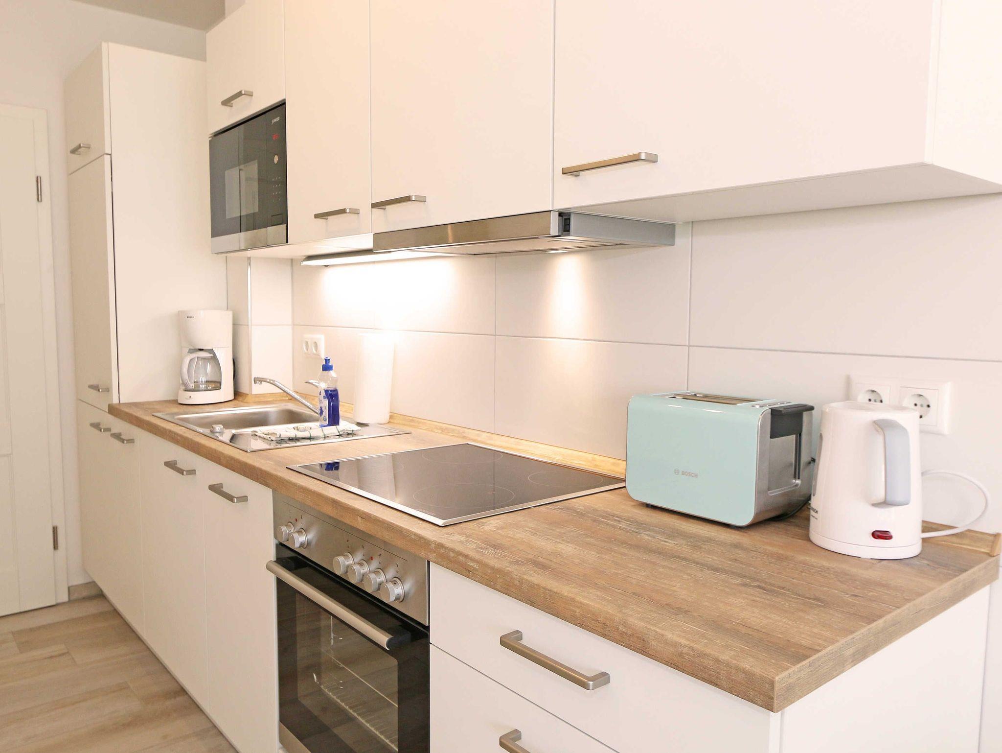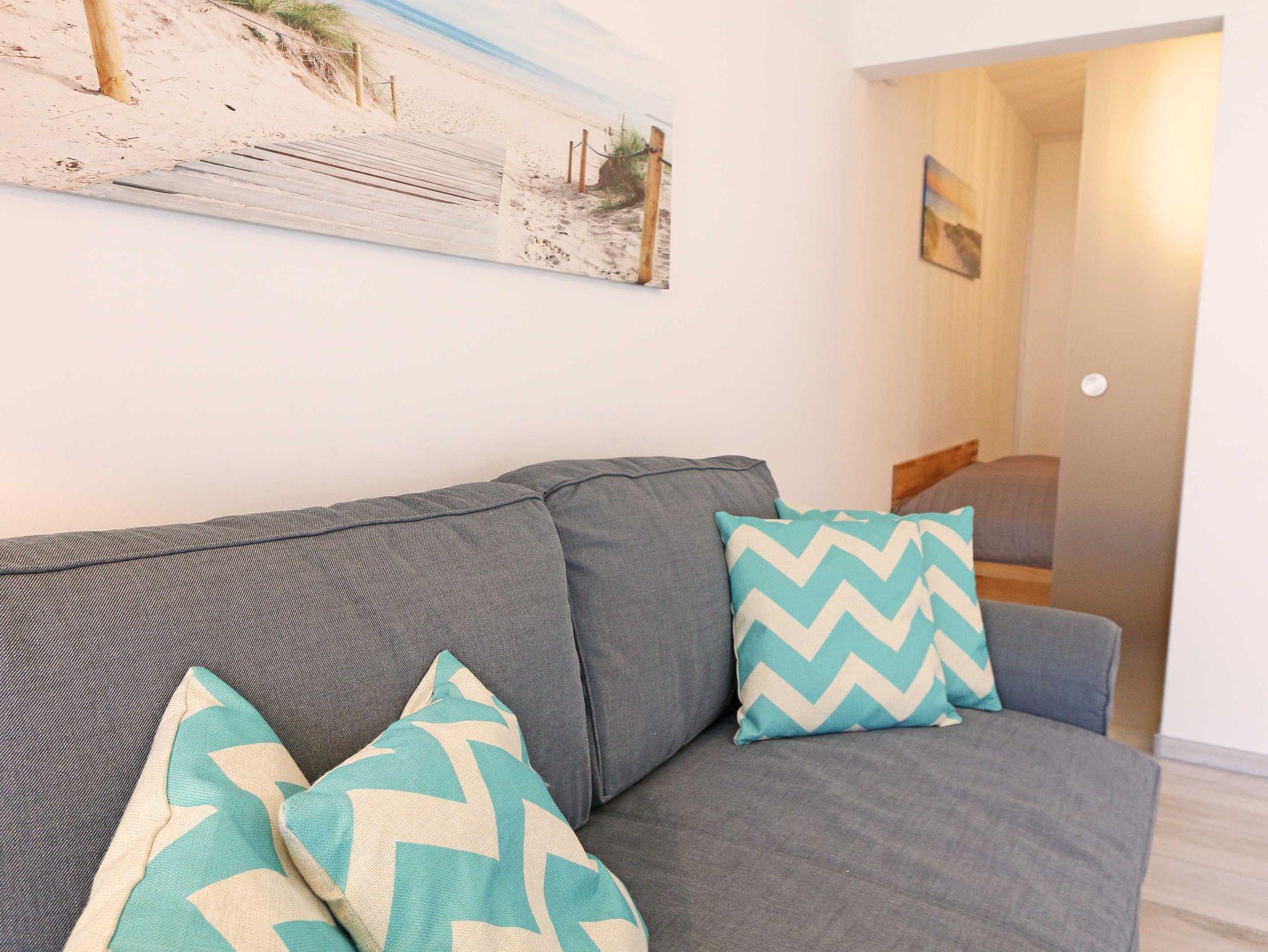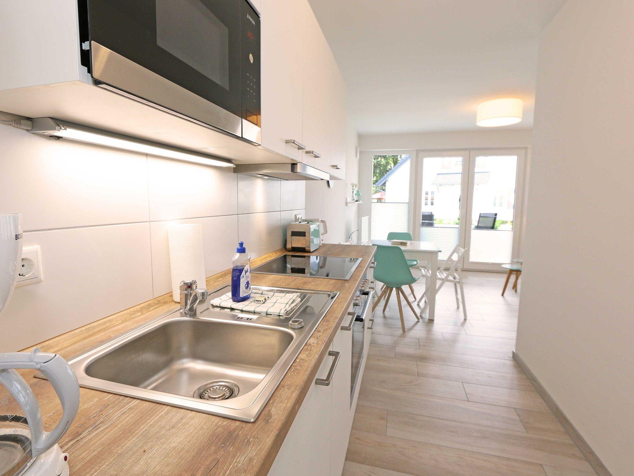 Die ca. 40 m² große Nichtraucherferienwohnung ?Strandoase? haben wir liebevoll im natürlich-nordischen ?Strandhauslook? eingerichtet. Sie befindet sich im Erdgeschoss einer wunderschön angelegten, kleinen Ferienwohnanlage. Unsere Ferienwohnung besticht durch die ca. 4 x 4,50 m große, zur Hälfte überdachte, nach Süd/West ausgerichtete Terrasse im Grünen. Die ?Strandoase? ist für 2 Personen optimal geeignet. Der offene Wohn-/Essbereich ist ausgestattet mit einer gemütlichen Couch, die sich jedoch ebenfalls in ein voll funktionstüchtiges Bett mit Lattenrost und Matratze (Liegefläche 1,60 m x 2,00 m) verwandeln lässt und Schlafplatz für eine weitere Person bietet. Ein Couchtisch, ein Sideboard, eine Leselampe sowie ein Flachbild-TV, ein Blu-Ray-Player, Micro-Hifi-System mit Bluetooth, CD/USB und ein kostenloser WLAN-Internetzugang runden das Bild ab. Die offene und integrierte Küchenzeile ist ausgestattet mit einem Kühlschrank mit Gefrierfach, Geschirrspüler, 4-Zonen-Ceranfeld mit Backofen, Mikrowelle, Kaffeemaschine, Wasserkocher, Toaster, Mixer sowie diversen Küchenutensilien. Das Schlafzimmer verfügt über ein Doppelbett (1,60 m x 2,00 m) mit zwei 7-Zonen-Kaltschaummatratzen, Nachttischablagen und einen Einbauschrank. Das moderne Badezimmer bietet Waschplatz, WC, Fön, eine ebenerdige Glasdusche, einen Handtuchtrockner sowie eine Waschmaschine. Alle Räumlichkeiten sind mit einer Fußbodenheizung ausgestattet. Eine Insektenschutzgittertür ist vorhanden. Der PKW kann auf dem kostenfreien Stellplatz (Nr. 3) direkt am Haus geparkt werden. Zu der Wohnung gehört zudem ein ca. 4,5 m² großer, abschließbarer Fahrradschuppen (Nr. 3), der sich auch zur Unterbringung von Wassersportequipment eignet. Direkt am Haus befindet sich ein gemütlicher Gemeinschafts-Grillplatz mit Sitzgelegenheiten. Gerne dürfen Sie einen Hund gegen eine Gebühr, der Bett und Sofa meidet, mitbringen. Da kein Schlafplatz (Körbchen, Decke, etc.) vorhanden ist, bringen Sie bitte Ihr eigenes ?Bettchen? für den Hund mit. Die Erstausstattung eines Wäschepaketes (komplette Bettwäsche, 1 Duschhandtuch, 2 kleine Handtücher) können Sie bis 14 Tage vor Anreise gegen einen Aufpreis dazu buchen oder durch eigene ergänzen. Ab 2 gebuchten Paketen erhalten Sie einmalig 1 Geschirrhandtuch und 1 Duschvorleger hinzu. Wir wünschen Ihnen einen traumhaften Urlaub an der Ostsee.