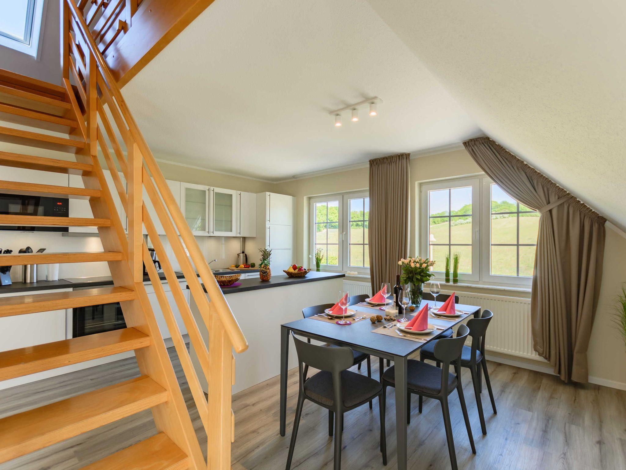Die Nichtraucherferienwohnung befindet sich in der 1. Etage und erstreckt sich über 2 Etagen. Mit Ihren ca. 75 qm können sich max. 6 Erwachsene wohlfühlen. Der großzügige und helle Wohn- Essbereich ist mit einer modernen Küchenzeile ausgestattet. Mit einem Kühlschrank mit Eisfach, Geschirrspüler, Cerankochfeld, Backofen, Mikrowelle, Wasserkocher, Kaffeemaschine, Toaster, Mixer, Waffeleisen können Sie Ihre gemütlichen Kochabende ganz individuell gestalten. Ein passender Essbereich rundet die Gemütlichkeit ab. Im angrenzenden Wohnbereich trägt eine bequeme Couch (Aufbettungsmöglichkeit für 5./6.Person, 1,50m x 1,95m) mit Couchtisch, ein Lesesessel mit Hocker sowie ein TV-Board zu Ihrer Entspannung bei. Die technische Ausstattung umfasst einen Smart-TV, ein DAB-Bluetooth-Radio sowie einen WLAN-Anschluss. Vom Wohnbereich gelangen Sie auf Ihren bestuhlten Balkon (Süd) mit Sonnenschirm, von wo Sie aus Ihren Tag entspannt bei einem Glas Wein ausklingen lassen können. Hell und freundlich eingerichtet erwartet Sie ein gemütliches Schlafzimmer auf gleicher Ebene, mit einem komfortablen Boxspring-Bett (1,80m x 2,00m) mit 5 Zonen Tonnen-Taschenfederkern-Matratzen, Nachttischablagen, einen großzügigen Kleiderschrank sowie ein Smart-TV. Das 2. Schlafzimmer erreichen Sie durch eine Treppe, welche vom Wohnbereich aus startet. Hier befindet sich ebenfalls ein bequemes Boxspringbett (1,80m x 2,00m) mit Nachttischablagen sowie einer kleinen Leseecke oder Relax-Ecke. Beide Schlafbereiche verfügen zudem über Vorhänge/Rollos, die nahezu lichtundurchlässig sind und einen guten Sicht- und Sonnenschutz bieten. Für einen angenehmen Schlaf sorgen zusätzlich Insektenschutzgitter im Wohn- & Schlafbereich. Das Tageslicht-Badezimmer ist mit einer ebenerdigen Dusche, einem WC, einen Handtuchtrockner, einem Fön sowie einem Waschtisch ausgestattet. In der Wohnung finden Sie zusätzlich ein Staubsauger, ein Besen mit Kehrset, ein Wäscheständer sowie ein Wäschekorb. Im Nachbarhaus C können Sie eine Waschmaschine sowie einen Trockner gegen Gebühr nutzen. Hier stehen auch ein Bügelbrett und ein Bügeleisen zur Verfügung. Haustiere sind nicht erlaubt. Das Grillen auf dem ausgewiesenen Gemeinschaftsplatz lädt zu gemütlichen Abenden ein. Zur Entspannung lädt eine münzbetriebene Sauna mit kleinem Ruheraum im Untergeschoss von Haus B ein. Ihre Fahrräder können Sie begrenzt im Gemeinschaftskeller oder auf dem Grundstück abstellen. Ein PKW-Stellplatz steht Ihnen inklusive zur Verfügung. Die Erstausstattung eines Wäschepaketes (komplette Bettwäsche, 1 Duschhandtuch, 2 kleine Handtücher) können Sie bis 14 Tage vor Anreise gegen einen Aufpreis dazu buchen oder durch eigene ergänzen. Ab 2 gebuchten Paketen erhalten Sie einmalig 1 Geschirrhandtuch und 1 Duschvorleger hinzu.