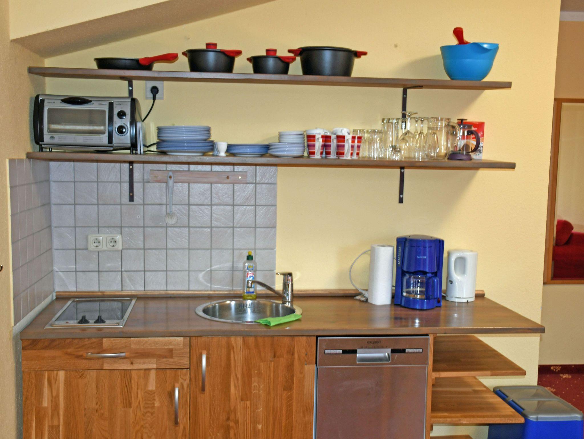 Die Pantry-Küche ist ausgestattet: 2 P. E-Herd, Spülmaschine, Minibackofen, Kaffeemaschine, Wasserkocher, 6-Set-Ess-Geschirr und Besteck, kleine Auswahl an Gläsern, kleine Topfsammlung, ein paar kleine Küchenhelfer --- Grundausstattung!!!