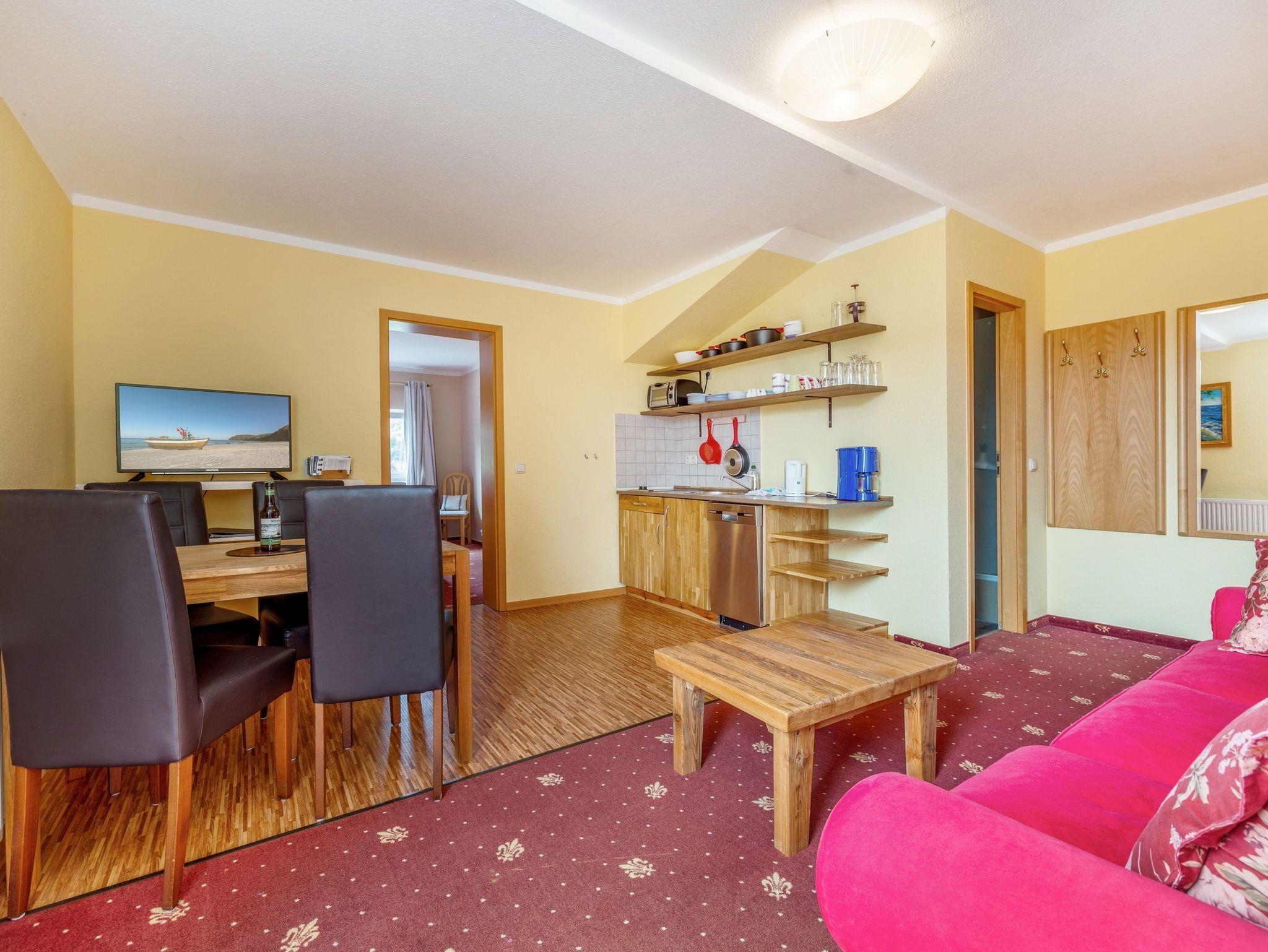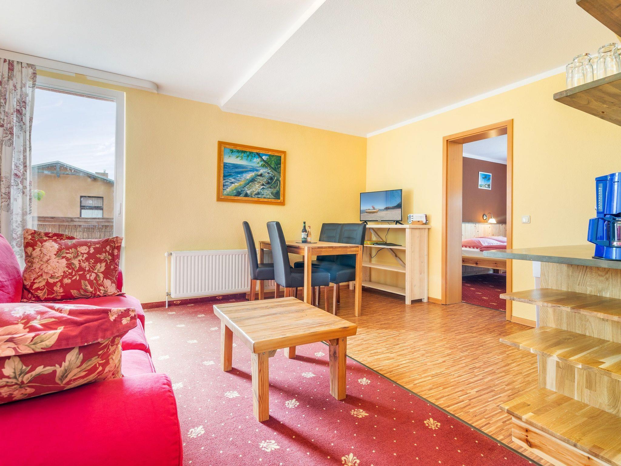 2-4 Pers.: 2-Zimmer-Wohnung mit 37 qm Wohnfläche, 1. Etage. Wohn-/Essraum mit Couchgarnitur (Ausziehcouch 2 Pers.), Esstisch, Küchenzeile (2 P. E-Herd, Spülmaschine, Minibackofen, Kaffeemaschine, Wasserkocher, 8-Set-Ess-Geschirr und Besteck, kleine Auswahl an Gläsern, kleine Topfsammlung, ein paar kleine Küchenhelfer --- Grundausstattung!!!)). Doppelbett, Couchgarnitur (Ausziehcouch 2 Personen), Bad/WC. Balkon mit Sitzmöbeln.