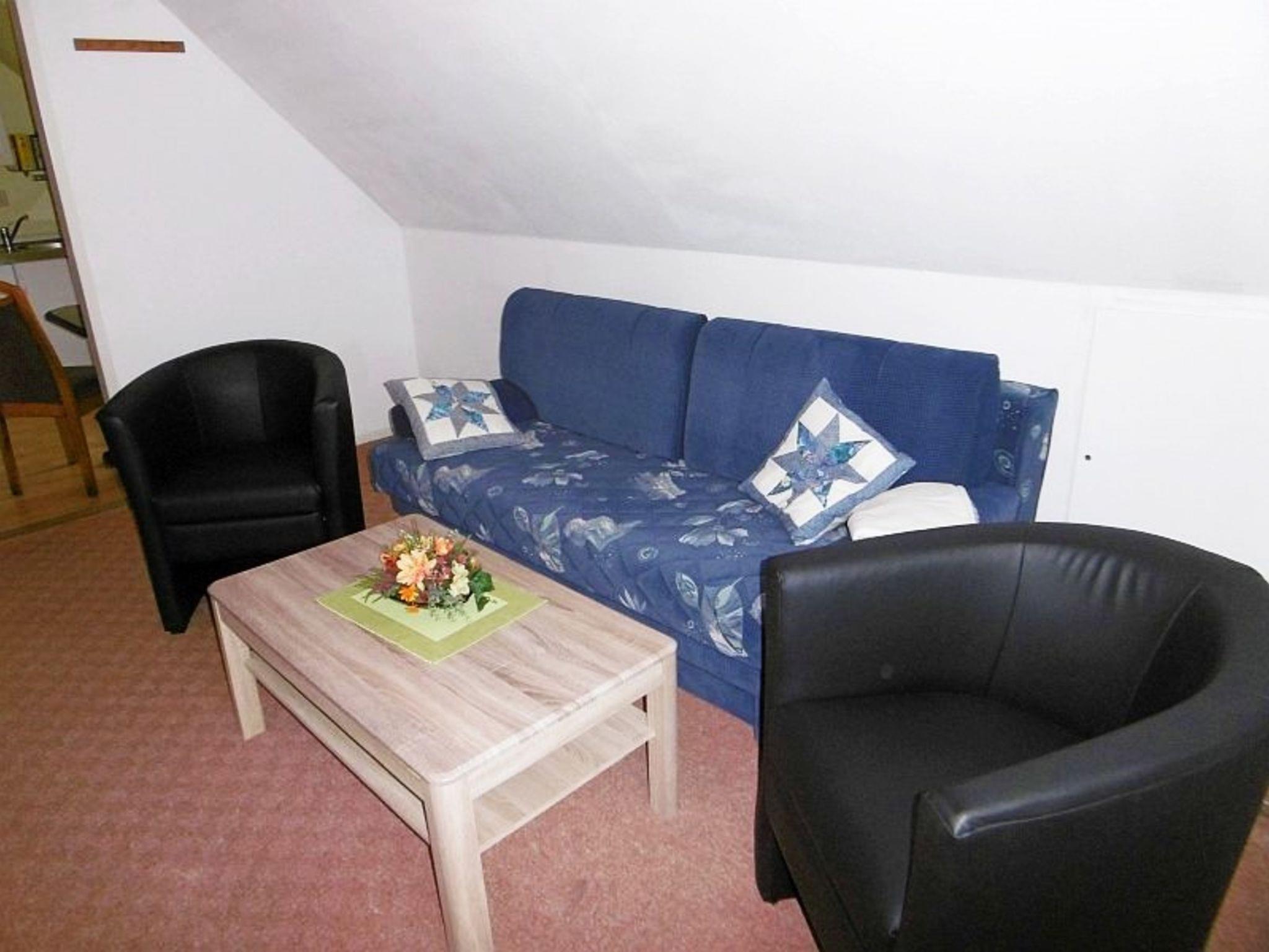 Die Feriemwohnungen befinden sich im Obergeschoß im Haus des Vermieters und sind über eine Innentreppe zu erreichen. Die abgeschlossenen Wohnungen verfügen je über einen Wohnraum mit der Aufbettungsmöglichkeit auf der Schlafcouch, einem Schlafraum mit Doppelbetten, der Küche und dem Duschbad.