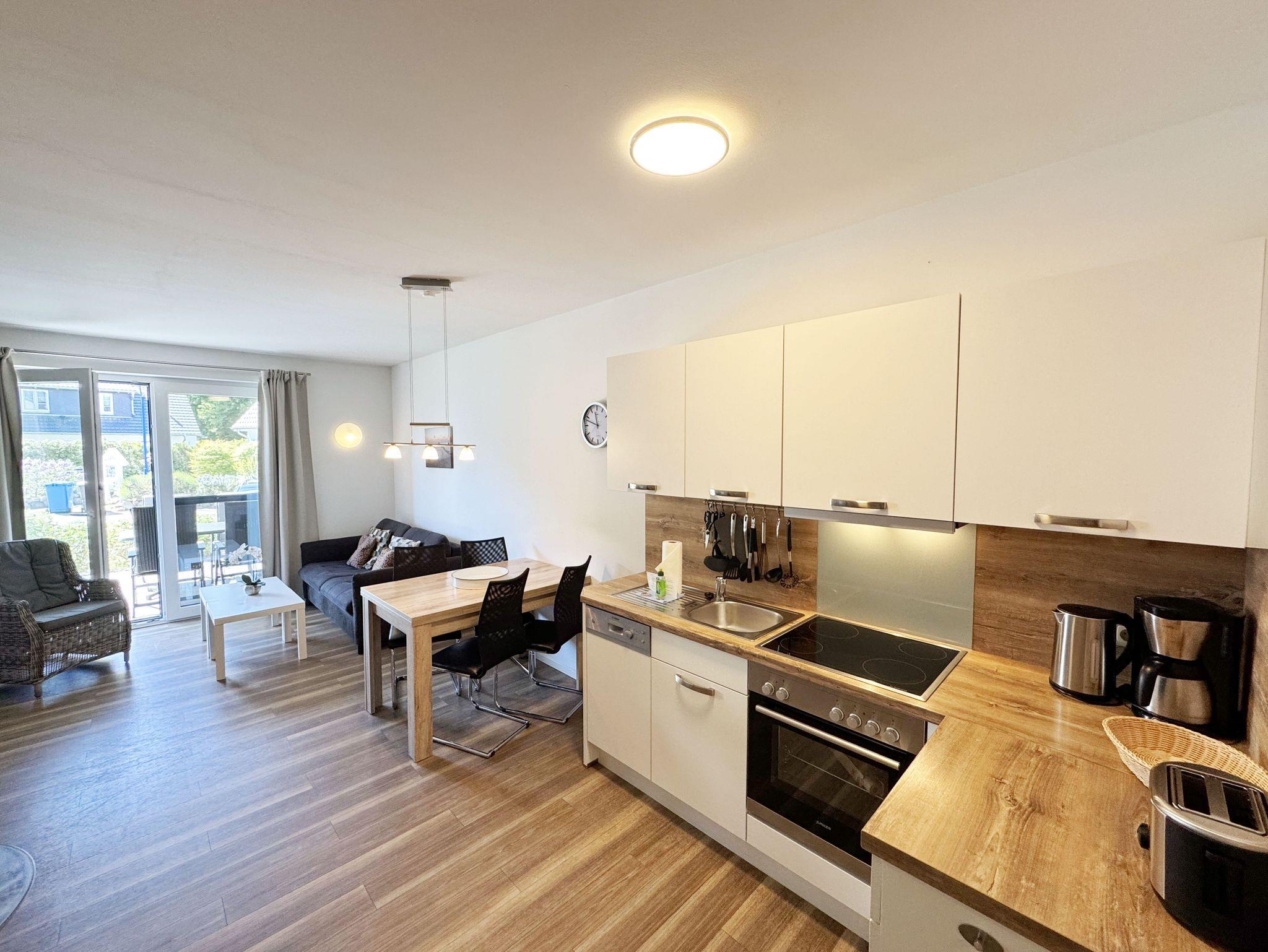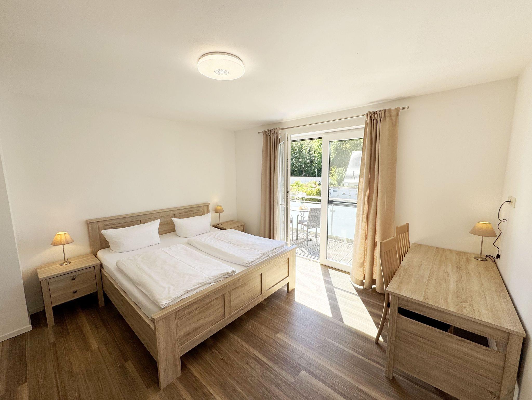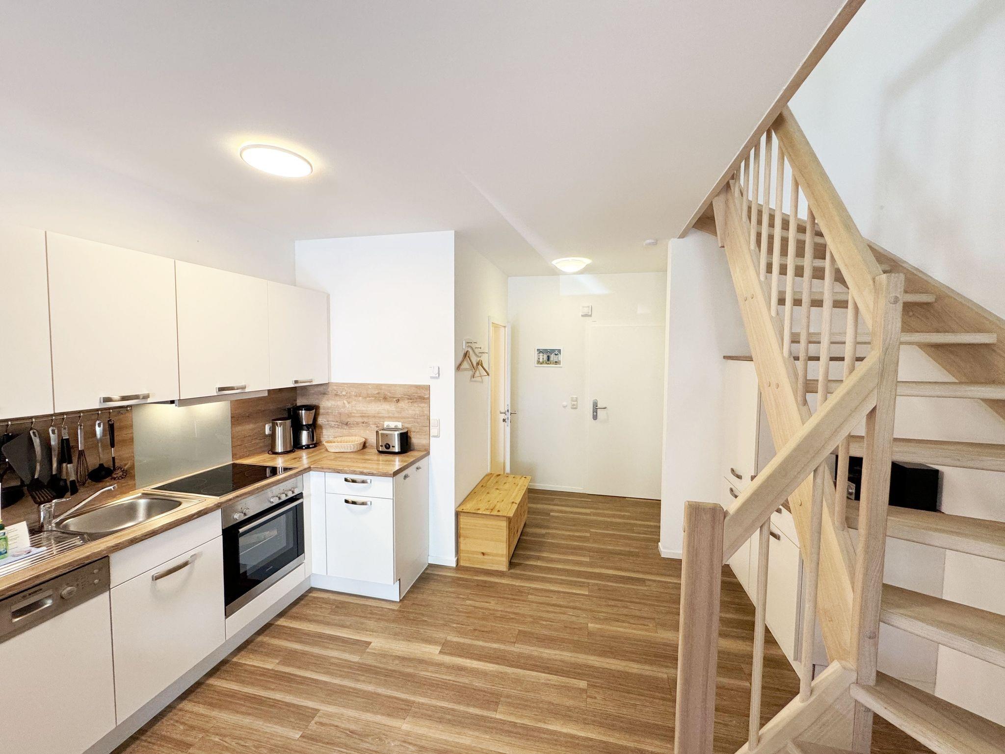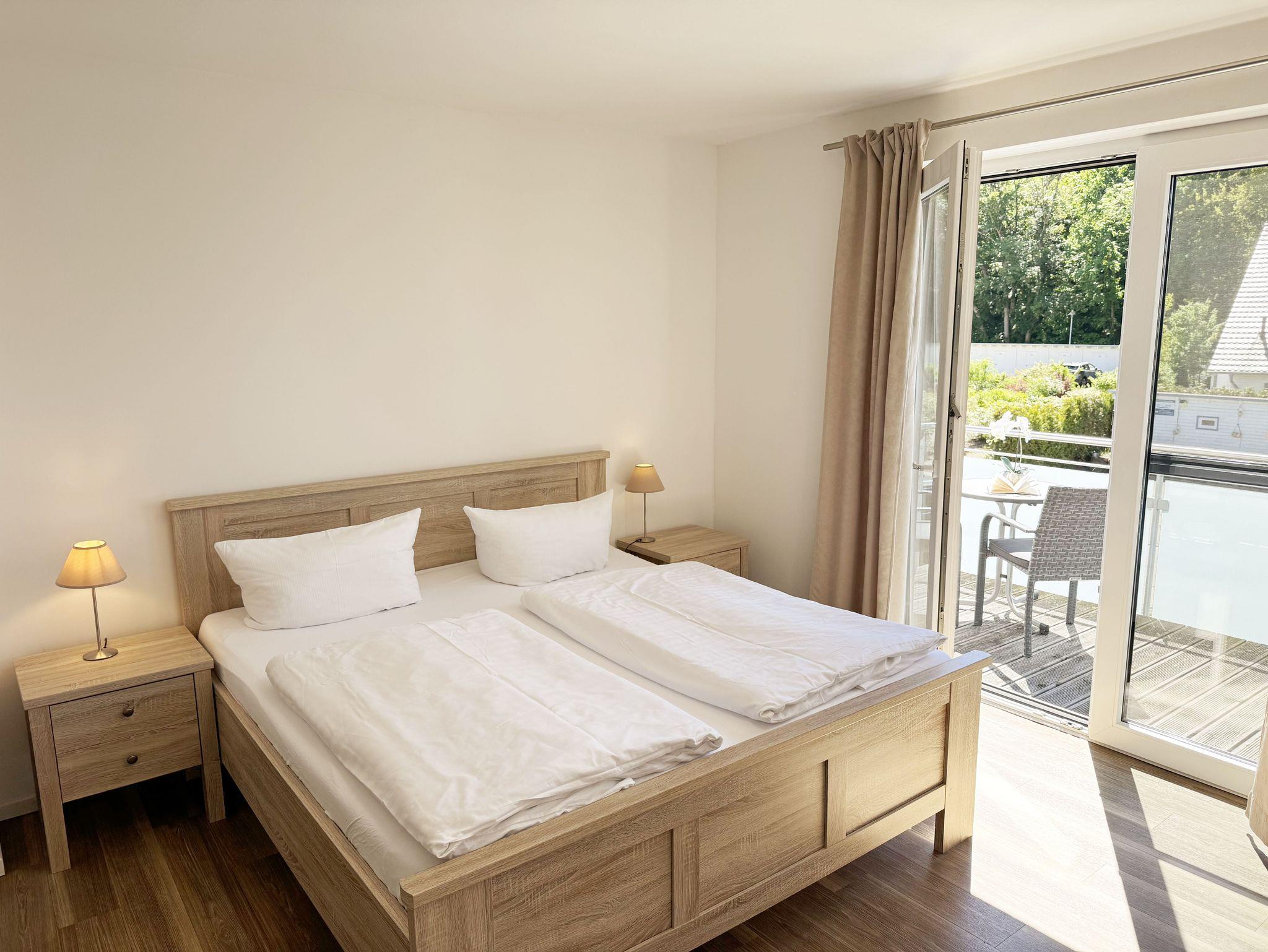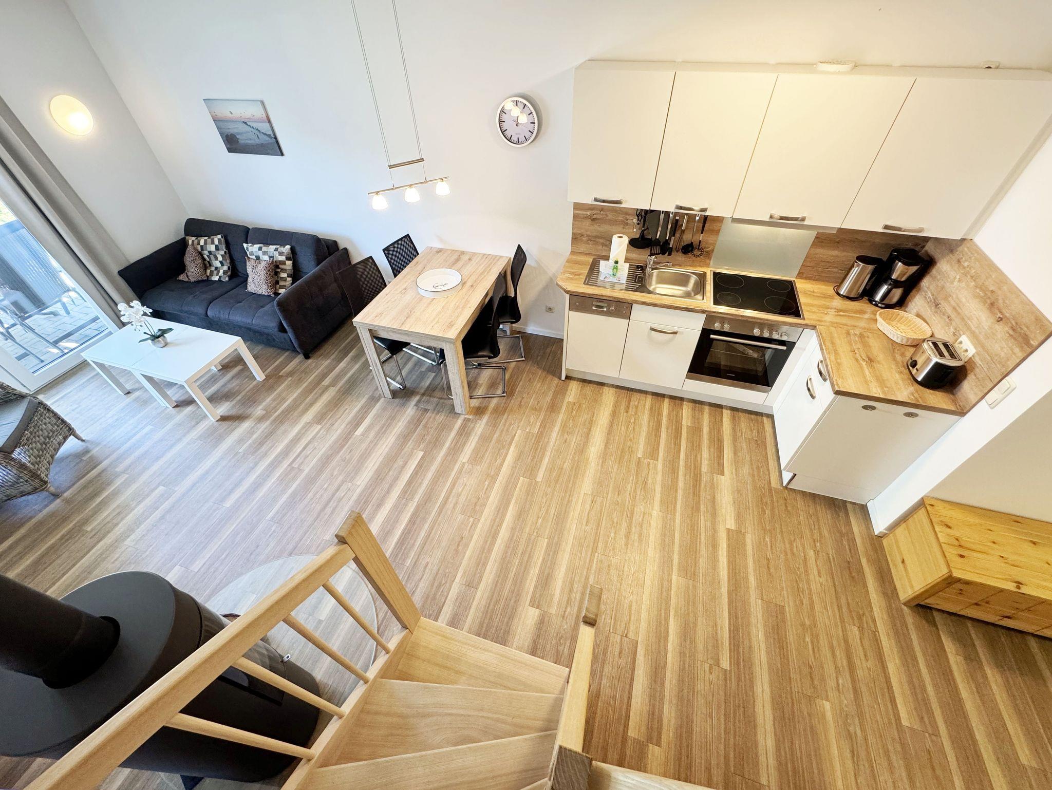 Die großzügige, moderne 2 Raumwohnung (Nichtraucher) mit ca. 63 qm aufgeteilt über 2 Etagen mit Innentreppe, einer Südwest Terrasse mit knapp 8 qm und einen Südwest Balkon mit knapp 4 qm wurde mit Möbeln im modernen Stil ausgestattet. Die Wohnung ist ideal für 1 bis 4 Personen ausgelegt. Der Wohn-, Koch- und Essbereich findet auf einer Ebene statt. Im Obergeschoss befindet sich ein Schlafzimmer mit Doppelbett (2x 0,90m x2,00m), Kleiderschrank und einen Schreibtisch. Hier befindet sich auch das Bad mit ebenerdiger Dusche, Handtuchtrockner, WC, Waschtisch und Fön. Ein Gäste-WC befindet sich zusätzlich im unteren Bereich. In allen Räumen sorgen Fußbodenheizungen mit Einzelraumregelung für angenehmes Wohnklima. Die großen Terrassentüren im Schlaf- und Wohnbereich sind mit elektrischen Rollläden sowie Insektenschutzgitter versehen. Die Küchenzeile mit Geschirrspüler, Ceranfeld mit Umluft Haube, Backofen, Kühlschrank mit Gefrierfach, Kaffeemaschine, Toaster, Wasserkocher, Esstisch und kleine Küchenhelfer runden die Ausstattung für die Selbstverpflegung ab. Im Wohnbereich vor der Terrasse gibt es eine Schlafcouch (Aufbettungsmöglichkeit für 3./4. Person, 1,50m x 2,10m), Tisch, Sessel, Smart-TV, Radio/CD und Blu-Ray-Player. Für die kälteren Tage steht Ihnen auch ein Kaminofen zur Verfügung (kein Brennholz vorhanden). Auch auf einen Internetanschluss (WLAN) brauchen Sie im Urlaub nicht verzichten. Dieser ist für Sie inklusive. Die Terrasse und der Balkon sind mit Tisch und Stühlen ausgestattet. 1 Haustier ist gegen eine Gebühr erlaubt. Ein PKW-Stellplatz Nr. 03 und ein verschließbarer Schuppen für Fahrräder gehören zur Wohnung dazu. Die Erstausstattung eines Wäschepaketes (komplette Bettwäsche, 1 Duschhandtuch, 2 kleine Handtücher) können Sie bis 14 Tage vor Anreise gegen einen Aufpreis dazu buchen oder durch eigene ergänzen. Ab 2 gebuchten Paketen erhalten Sie einmalig 1 Geschirrhandtuch und 1 Duschvorleger hinzu.