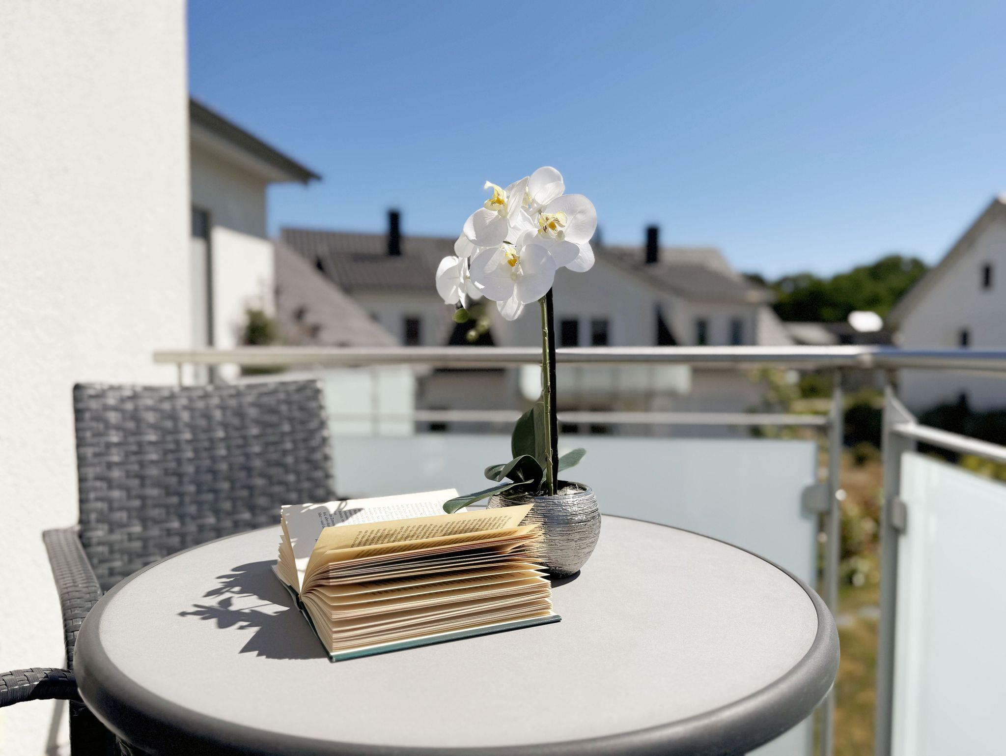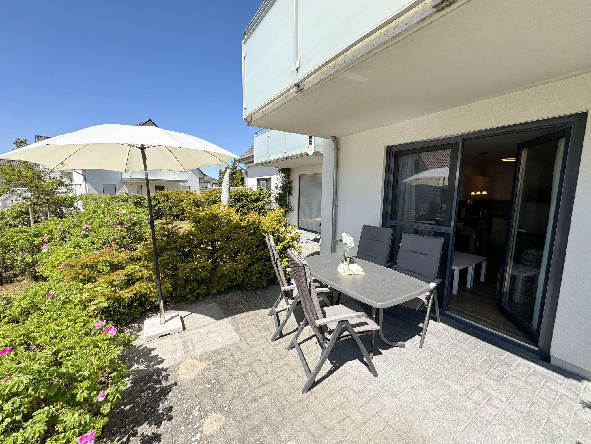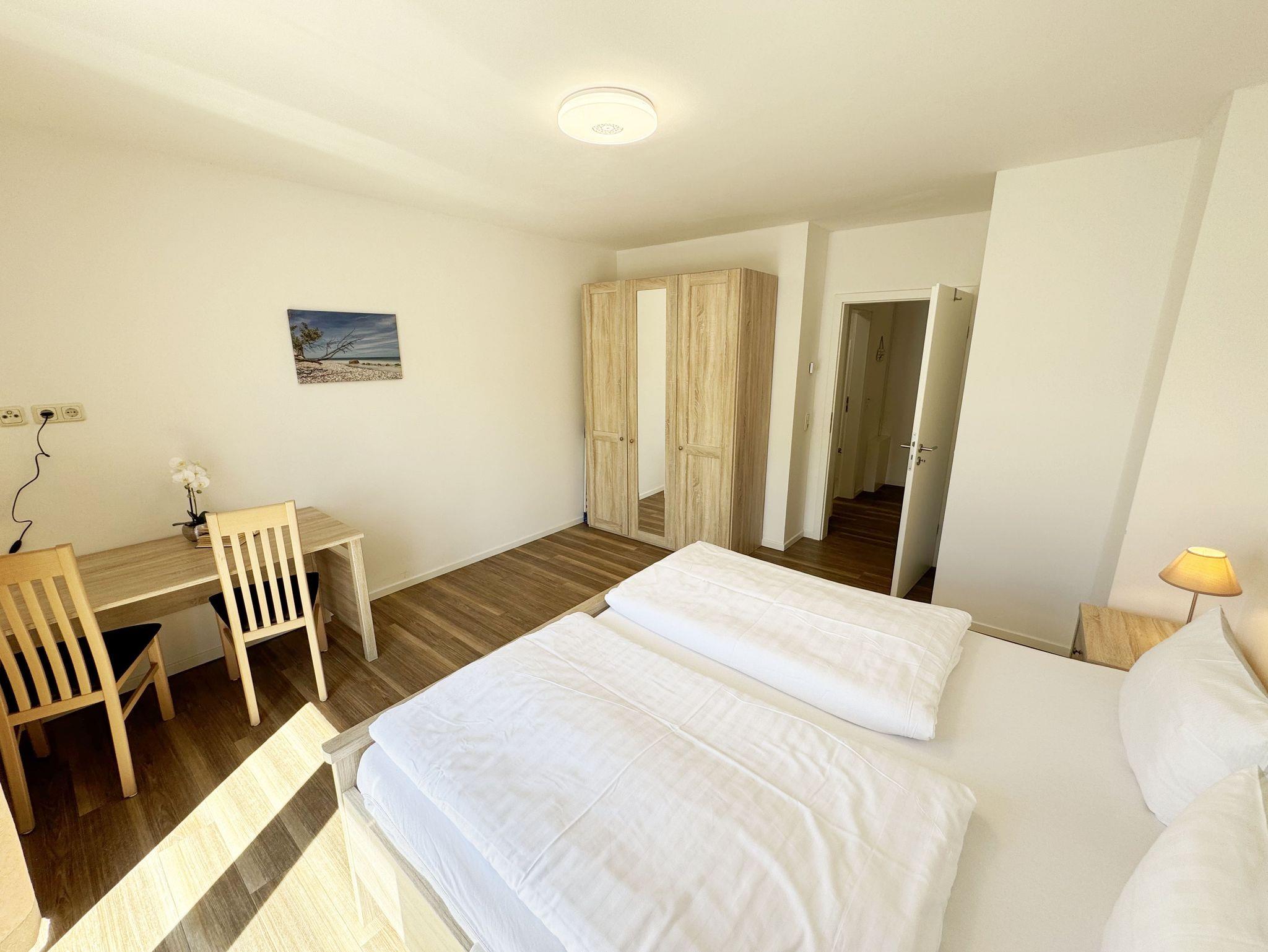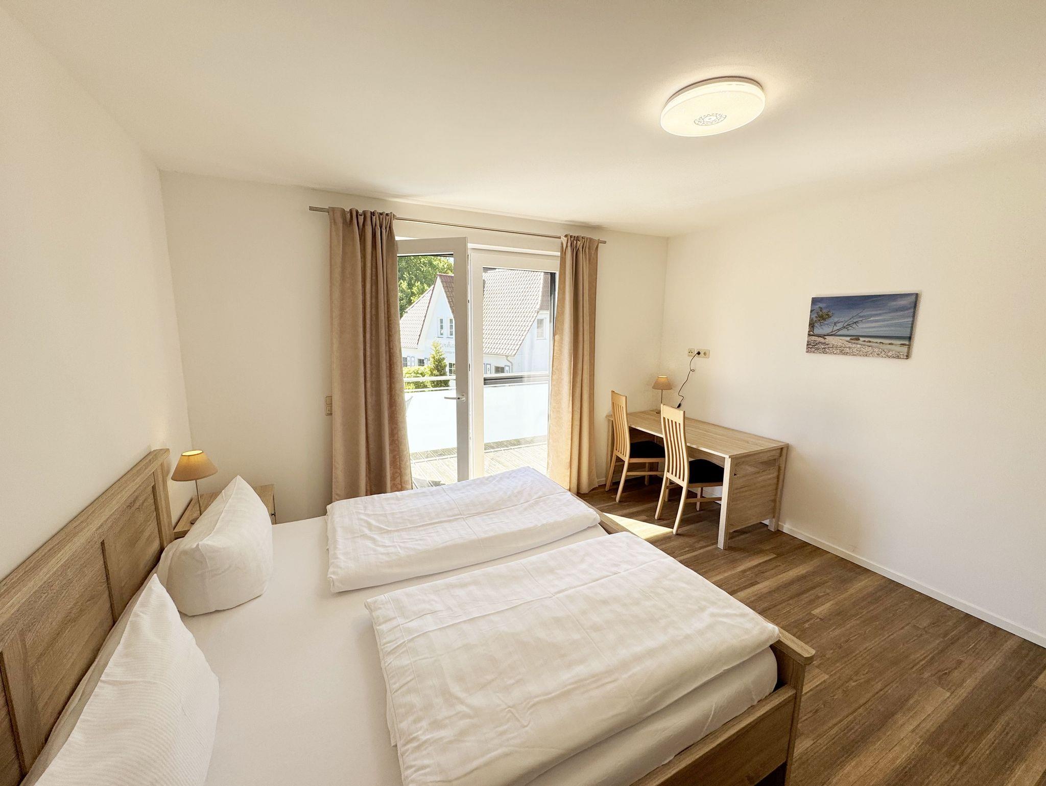Die großzügige, moderne 2 Raumwohnung (Nichtraucher) mit ca. 63 qm aufgeteilt über 2 Etagen mit Innentreppe, einer Südwest Terrasse mit knapp 8 qm und einen Südwest Balkon mit knapp 4 qm wurde mit Möbeln im modernen Stil ausgestattet. Die Wohnung ist ideal für 1 bis 4 Personen ausgelegt. Der Wohn-, Koch- und Essbereich findet auf einer Ebene statt. Im Obergeschoss befindet sich ein Schlafzimmer mit Doppelbett (2x 0,90m x2,00m), Kleiderschrank und einen Schreibtisch. Hier befindet sich auch das Bad mit ebenerdiger Dusche, Handtuchtrockner, WC, Waschtisch und Fön. Ein Gäste-WC befindet sich zusätzlich im unteren Bereich. In allen Räumen sorgen Fußbodenheizungen mit Einzelraumregelung für angenehmes Wohnklima. Die großen Terrassentüren im Schlaf- und Wohnbereich sind mit elektrischen Rollläden sowie Insektenschutzgitter versehen. Die Küchenzeile mit Geschirrspüler, Ceranfeld mit Umluft Haube, Backofen, Kühlschrank mit Gefrierfach, Kaffeemaschine, Toaster, Wasserkocher, Esstisch und kleine Küchenhelfer runden die Ausstattung für die Selbstverpflegung ab. Im Wohnbereich vor der Terrasse gibt es eine Schlafcouch (Aufbettungsmöglichkeit für 3./4. Person, 1,50m x 2,10m), Tisch, Sessel, Smart-TV, Radio/CD und Blu-Ray-Player. Für die kälteren Tage steht Ihnen auch ein Kaminofen zur Verfügung (kein Brennholz vorhanden). Auch auf einen Internetanschluss (WLAN) brauchen Sie im Urlaub nicht verzichten. Dieser ist für Sie inklusive. Die Terrasse und der Balkon sind mit Tisch und Stühlen ausgestattet. 1 Haustier ist gegen eine Gebühr erlaubt. Ein PKW-Stellplatz Nr. 03 und ein verschließbarer Schuppen für Fahrräder gehören zur Wohnung dazu. Die Erstausstattung eines Wäschepaketes (komplette Bettwäsche, 1 Duschhandtuch, 2 kleine Handtücher) können Sie bis 14 Tage vor Anreise gegen einen Aufpreis dazu buchen oder durch eigene ergänzen. Ab 2 gebuchten Paketen erhalten Sie einmalig 1 Geschirrhandtuch und 1 Duschvorleger hinzu.