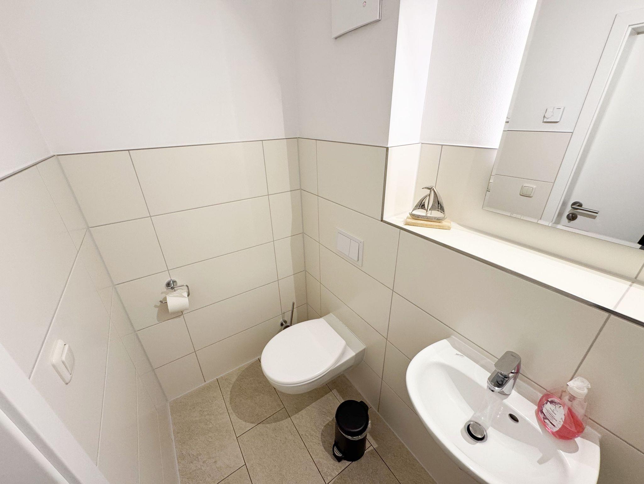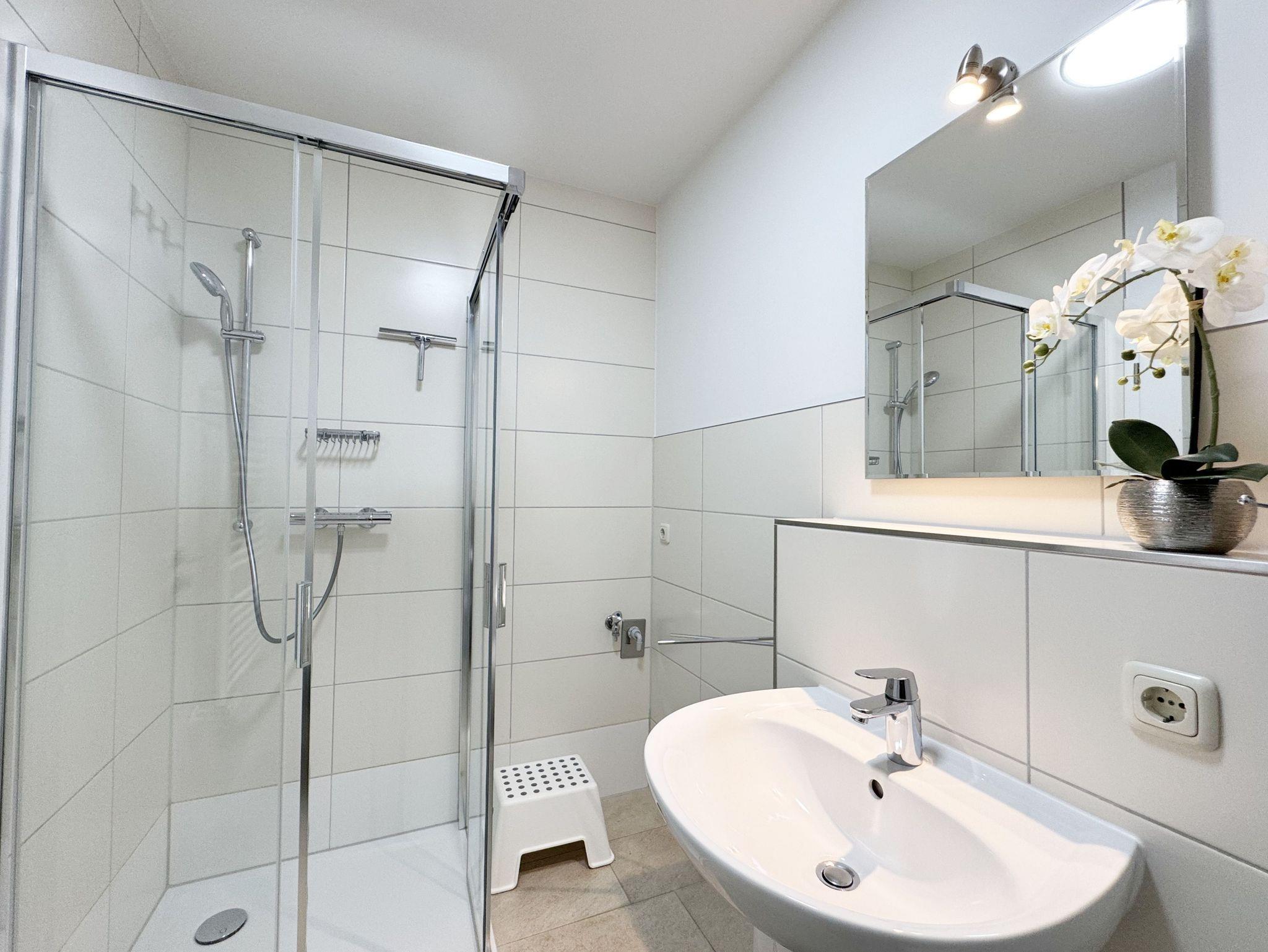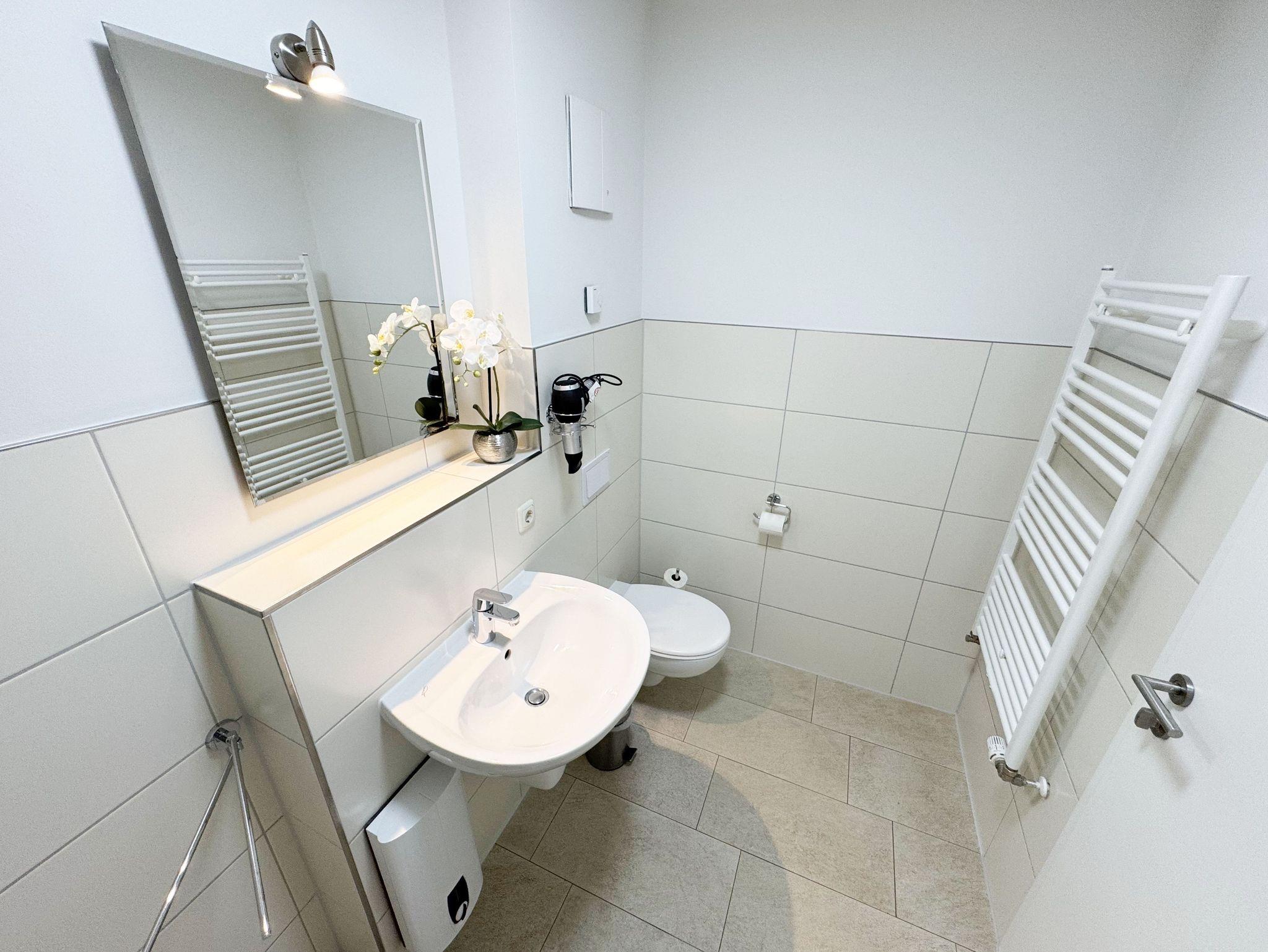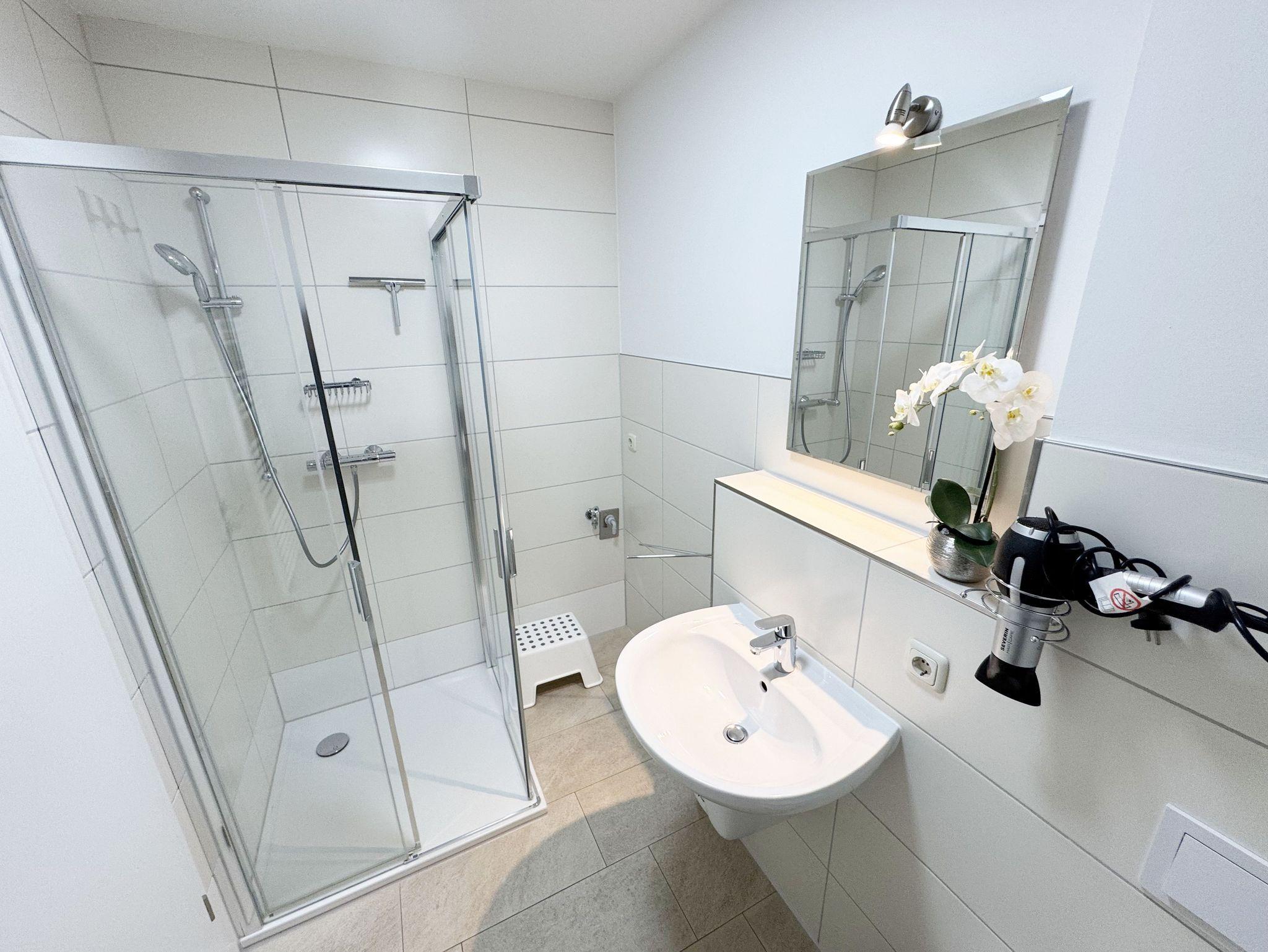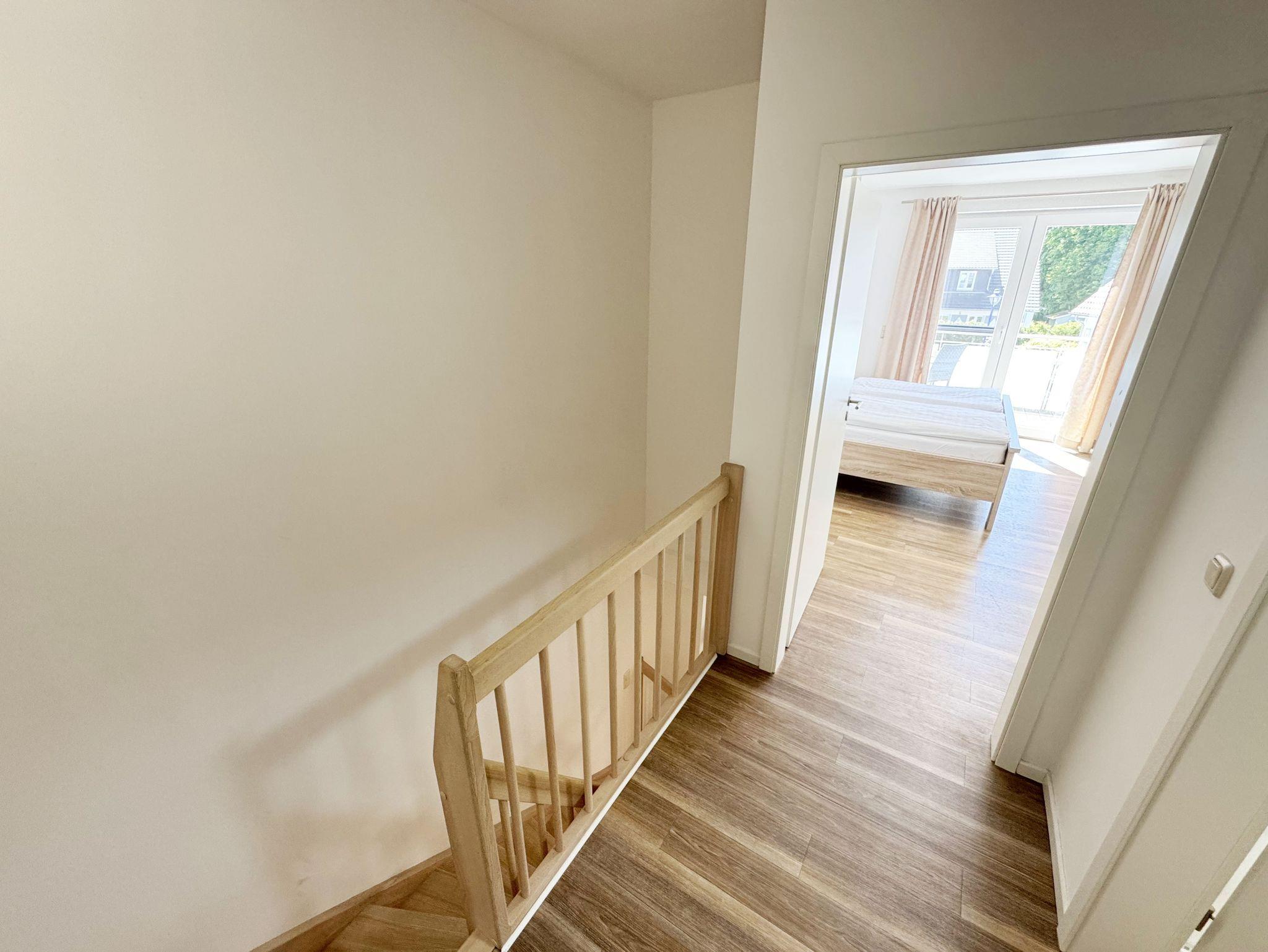 Die großzügige, moderne 2 Raumwohnung (Nichtraucher) mit ca. 63 qm aufgeteilt über 2 Etagen mit Innentreppe, einer Südwest Terrasse mit knapp 8 qm und einen Südwest Balkon mit knapp 4 qm wurde mit Möbeln im modernen Stil ausgestattet. Die Wohnung ist ideal für 1 bis 4 Personen ausgelegt. Der Wohn-, Koch- und Essbereich findet auf einer Ebene statt. Im Obergeschoss befindet sich ein Schlafzimmer mit Doppelbett (2x 0,90m x2,00m), Kleiderschrank und einen Schreibtisch. Hier befindet sich auch das Bad mit ebenerdiger Dusche, Handtuchtrockner, WC, Waschtisch und Fön. Ein Gäste-WC befindet sich zusätzlich im unteren Bereich. In allen Räumen sorgen Fußbodenheizungen mit Einzelraumregelung für angenehmes Wohnklima. Die großen Terrassentüren im Schlaf- und Wohnbereich sind mit elektrischen Rollläden sowie Insektenschutzgitter versehen. Die Küchenzeile mit Geschirrspüler, Ceranfeld mit Umluft Haube, Backofen, Kühlschrank mit Gefrierfach, Kaffeemaschine, Toaster, Wasserkocher, Esstisch und kleine Küchenhelfer runden die Ausstattung für die Selbstverpflegung ab. Im Wohnbereich vor der Terrasse gibt es eine Schlafcouch (Aufbettungsmöglichkeit für 3./4. Person, 1,50m x 2,10m), Tisch, Sessel, Smart-TV, Radio/CD und Blu-Ray-Player. Für die kälteren Tage steht Ihnen auch ein Kaminofen zur Verfügung (kein Brennholz vorhanden). Auch auf einen Internetanschluss (WLAN) brauchen Sie im Urlaub nicht verzichten. Dieser ist für Sie inklusive. Die Terrasse und der Balkon sind mit Tisch und Stühlen ausgestattet. 1 Haustier ist gegen eine Gebühr erlaubt. Ein PKW-Stellplatz Nr. 03 und ein verschließbarer Schuppen für Fahrräder gehören zur Wohnung dazu. Die Erstausstattung eines Wäschepaketes (komplette Bettwäsche, 1 Duschhandtuch, 2 kleine Handtücher) können Sie bis 14 Tage vor Anreise gegen einen Aufpreis dazu buchen oder durch eigene ergänzen. Ab 2 gebuchten Paketen erhalten Sie einmalig 1 Geschirrhandtuch und 1 Duschvorleger hinzu.