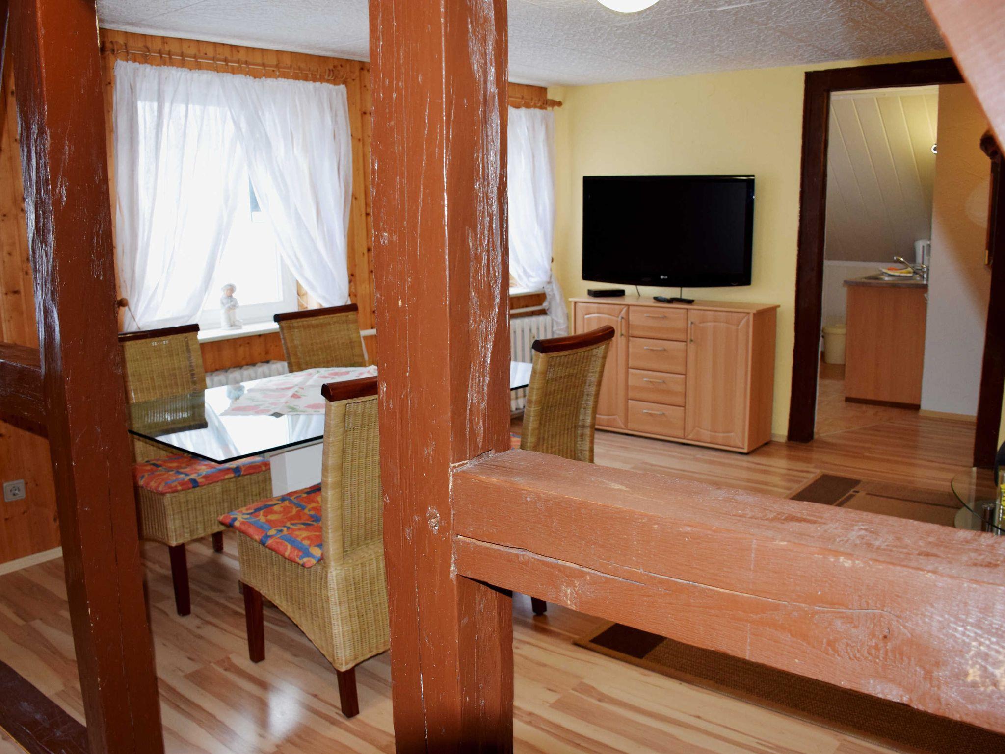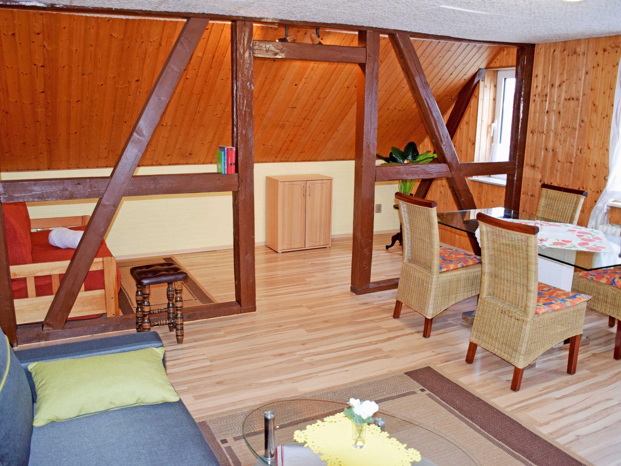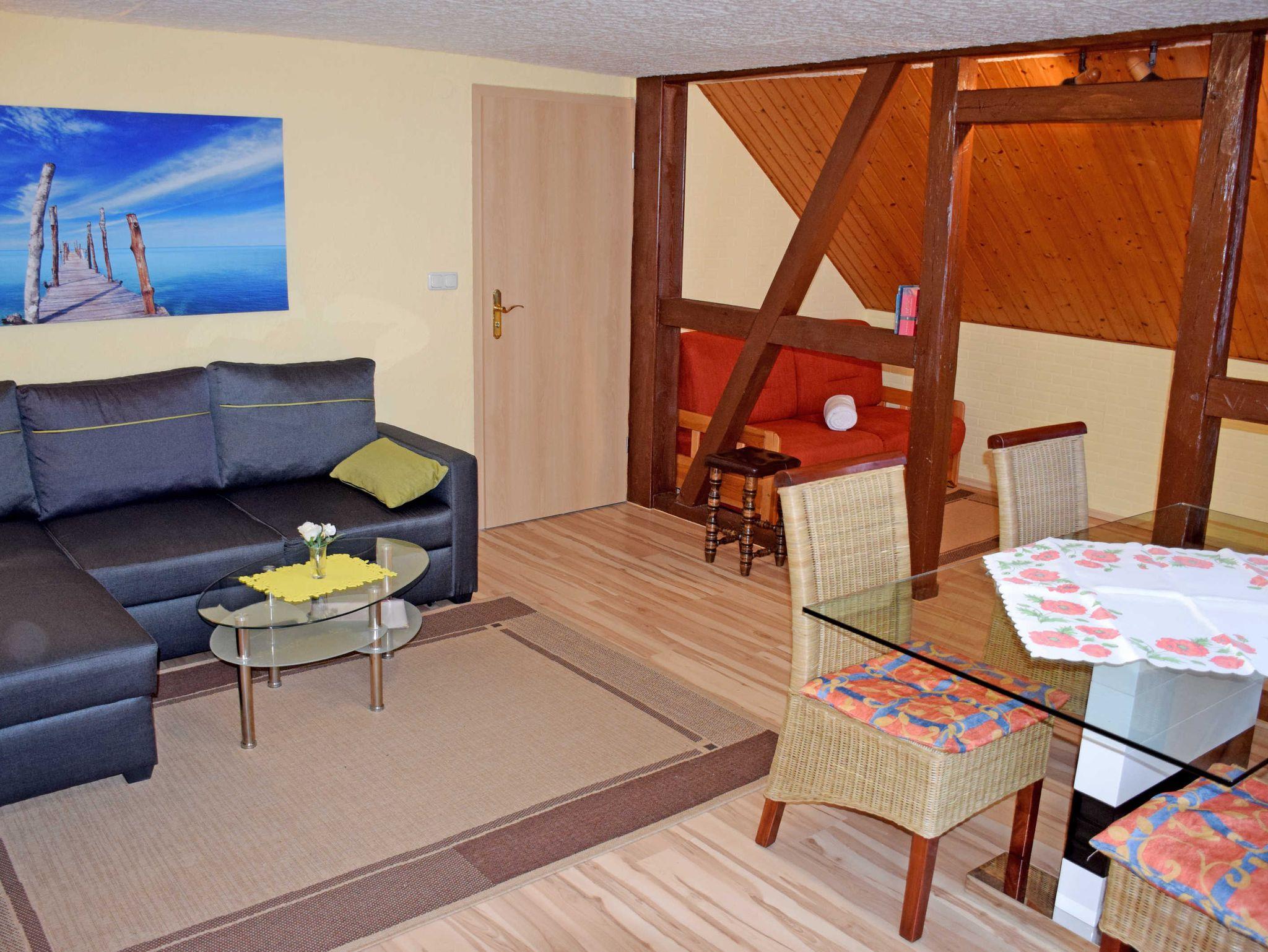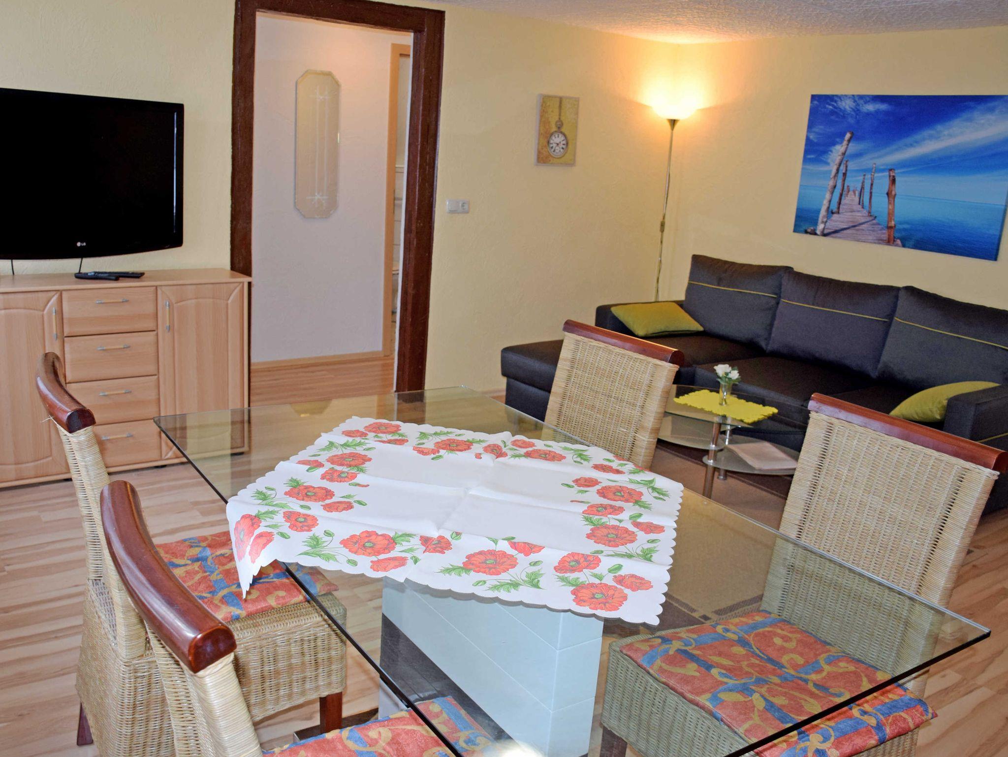 Im großen Wohnzimmer stehen eine Sitzgruppe mit Tisch und Sesseln, ein Esstisch mit Stühlen und ein Schrank mit TV - Gerät. Die Couch kann bei Bedarf für zwei Gäste aufgebettet werden. Ein kleines Kinderreisebett und ein Hochstuhl können auf Wunsch kostenlos bereit gestellt werden.