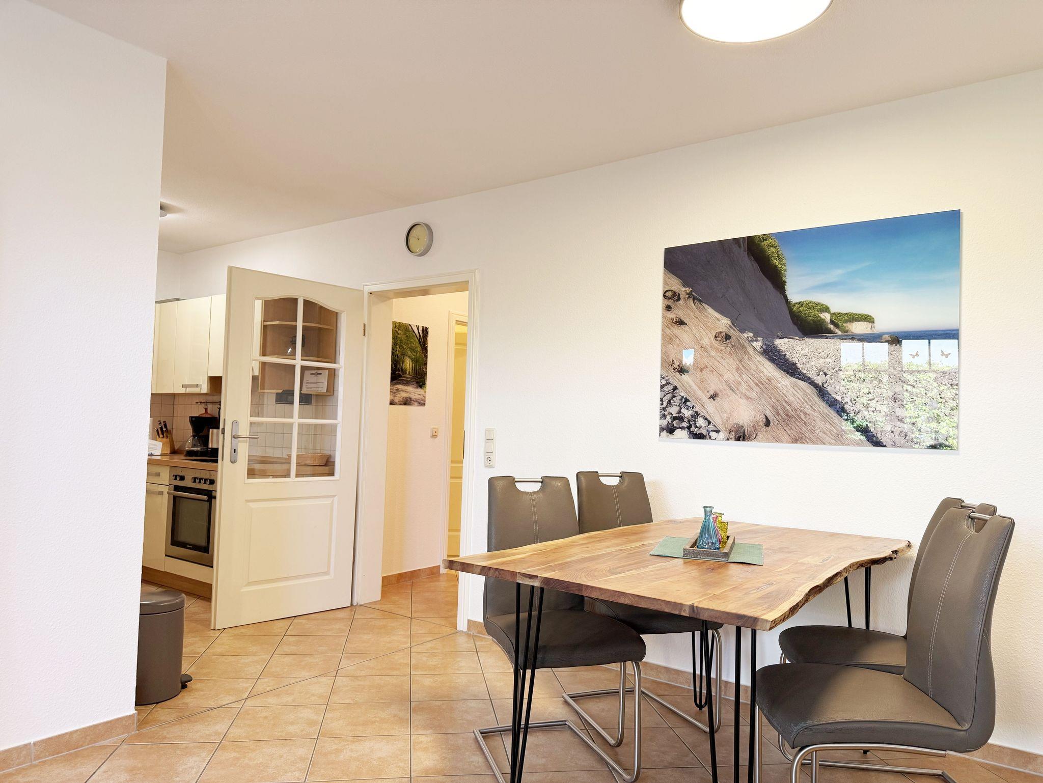 Ihr Urlaub hat begonnen! Nur ein kleines Kiefernwäldchen und wenige Schritte trennen Ihr komfortabel eingerichtetes Appartement vom weißen Sonnenstrand. Das ca. 50 m² Nichtraucher-Appartement im Erdgeschoß ist für 3 Erwachsene + 1 Kind bis 12 Jahre ausgestattet. Die komplett ausgestattete Küchenzeile verfügt über einen Kühlschrank mit Gefrierfach, Ceranfeld, Backofen, Mikrowelle, Kaffeemaschine, Toaster, Wasserkocher und viele kleine Küchenhelfern lässt keine Wünsche offen. Ein großer Esszimmertisch mit bequemen Stühlen bietet Ihnen viel Platz. Moderne Leuchten tauchen den gemütlichen Wohnbereich in ein stimmungsvolles Licht. Die bequeme Schlafcouch mit Ausziehfunktion (Aufbettung für 2 Personen, 1,60m x 2,00m), der Couchtisch und auch der stilvolle Schwingsessel lassen Sie abschalten. Für eine Auszeit sorgt der LED-TV, der mittels Wandhalterung in jede gewünschte Richtung verstellbar ist. Auf dem Low Board stehen ein Blu-Ray-Player, ein DAB-Radio, einige Spiele und eine Büchersammlung für die ruhigen Minuten zur Verfügung. Ebenso wie schnelles WLAN (50MB/s) und ein modernes Internet-Radio. Vom Wohnbereich gelangen Sie auf die möblierte Sonnen-Terrasse (Westen) im eingezäunten, fast uneinsehbaren Garten. Hier können Sie auch ungestört die Zeit im schönen Strandkorb aus edlem, lackiertem Mahagoni-Holz verbringen. Das geräumige Schlafzimmer mit Doppelbett (1,60m x 2,00m) verfügt über einen großzügigen Schwebetürenschrank, verstellbare Lattenroste, Nachttischablagen mit Leseleuchten und einen Herrendiener. Ihr erholsame Schlaf wird durch Insektenschutz und Verdunklungs-Plissees im gesamten Appartement unterstützt. Vom hellen Flur mit Garderobe gelangen Sie in das hochwertige Badezimmer mit einer ebenerdigen Echtglas-Dusche, Wandtiefspül-WC, Waschtisch, Haartrockner und beheiztem Handtuchtrockner. Im gesamten Wohnbereich sorgt eine Fußbodenheizung das ganze Jahr über für eine angenehme, leicht zu regulierende Wärme. Für unsere kleinen Gäste stehen ein Kinderreisebett und ein Hochstuhl bereit. Maximal sind 2 Haustiere gegen eine Gebühr gern gesehene Gäste. Ein Wäscheständer sowie diverse Reinigungsutensilien sind vorhanden. Im wohnungseigenen Abstellraum finden sich zwei Fahrräder zu Ihrer Nutzung (nicht Bestandteil des Vertrages). Ihr PKW-Stellplatz (Nr.03) befindet sich direkt am Objekt. Die Erstausstattung eines Wäschepaketes (komplette Bettwäsche, 1 Duschhandtuch, 2 kleine Handtücher) können Sie bis 14 Tage vor Anreise gegen einen Aufpreis dazu buchen oder durch eigene ergänzen. Ab 2 gebuchten Paketen erhalten Sie einmalig 1 Geschirrhandtuch und 1 Duschvorleger hinzu.