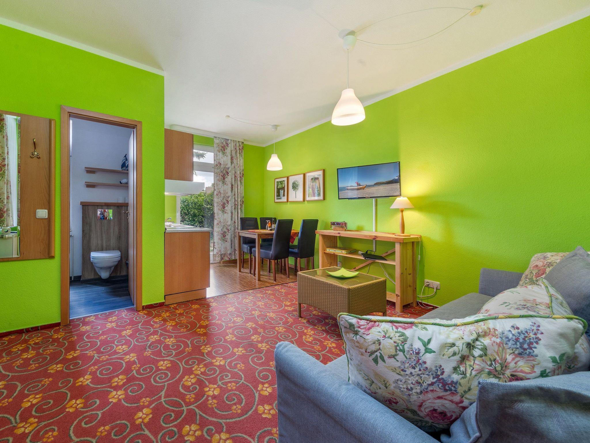 2-4 Pers.: 2-Zimmer-Wohnung mit 37 qm Wohnfläche, Parterre. Wohn-/Essraum mit Couchgarnitur (Ausziehcouch 2 Pers.), Esstisch, Küchenzeile (2 P. E-Herd, Spülmaschine, Minibackofen, Kaffeemaschine, Wasserkocher, 6-Set-Ess-Geschirr und Besteck, kleine Auswahl an Gläsern, kleine Topfsammlung, ein paar kleine Küchenhelfer --- Grundausstattung!!!)). Doppelbett, Couchgarnitur (Ausziehcouch 2 Personen), Bad/WC. Balkon mit Sitzmöbeln.