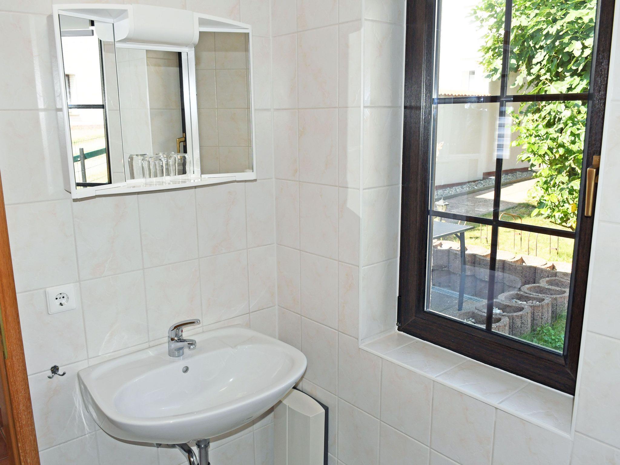 Das Bad ist mit Dusche, WC und Waschtisch ausgestattet und verfügt über Tageslicht.