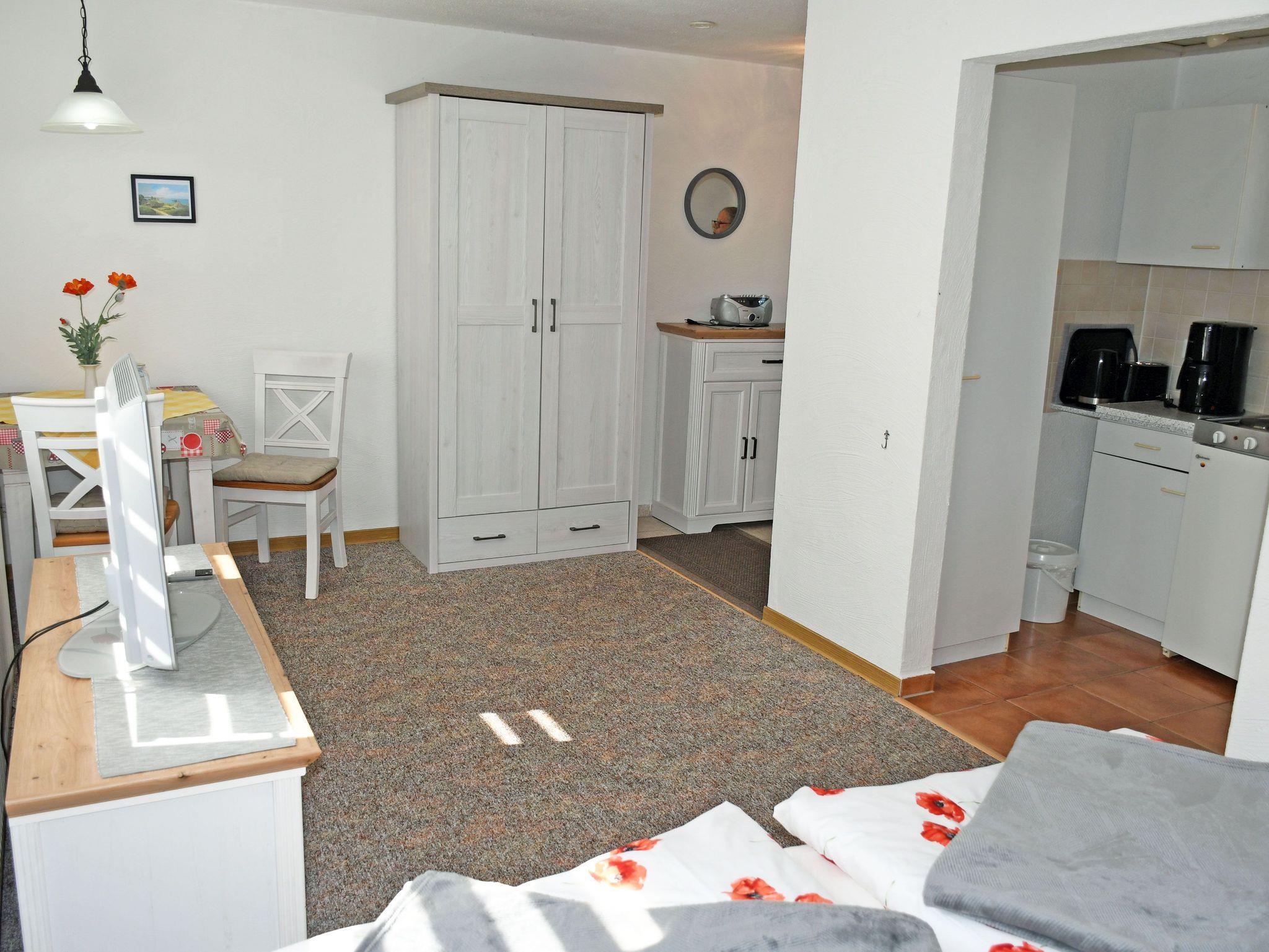 Im Wohn-/Schlafraum befinden sich ein bequemes Doppelbett mit Nachtischen und Leselampen, div, Schränke zur Ablage, ein Tisch mit Stühlen und ein modernes Flachbild-TV-Gerät sowie WLAN.