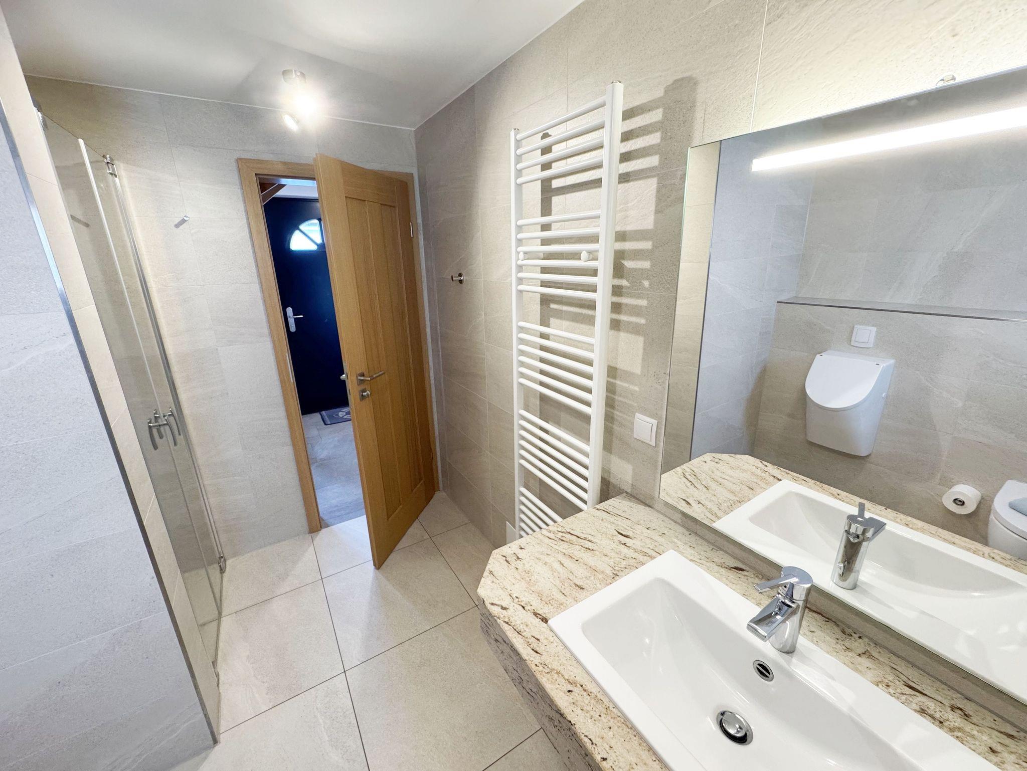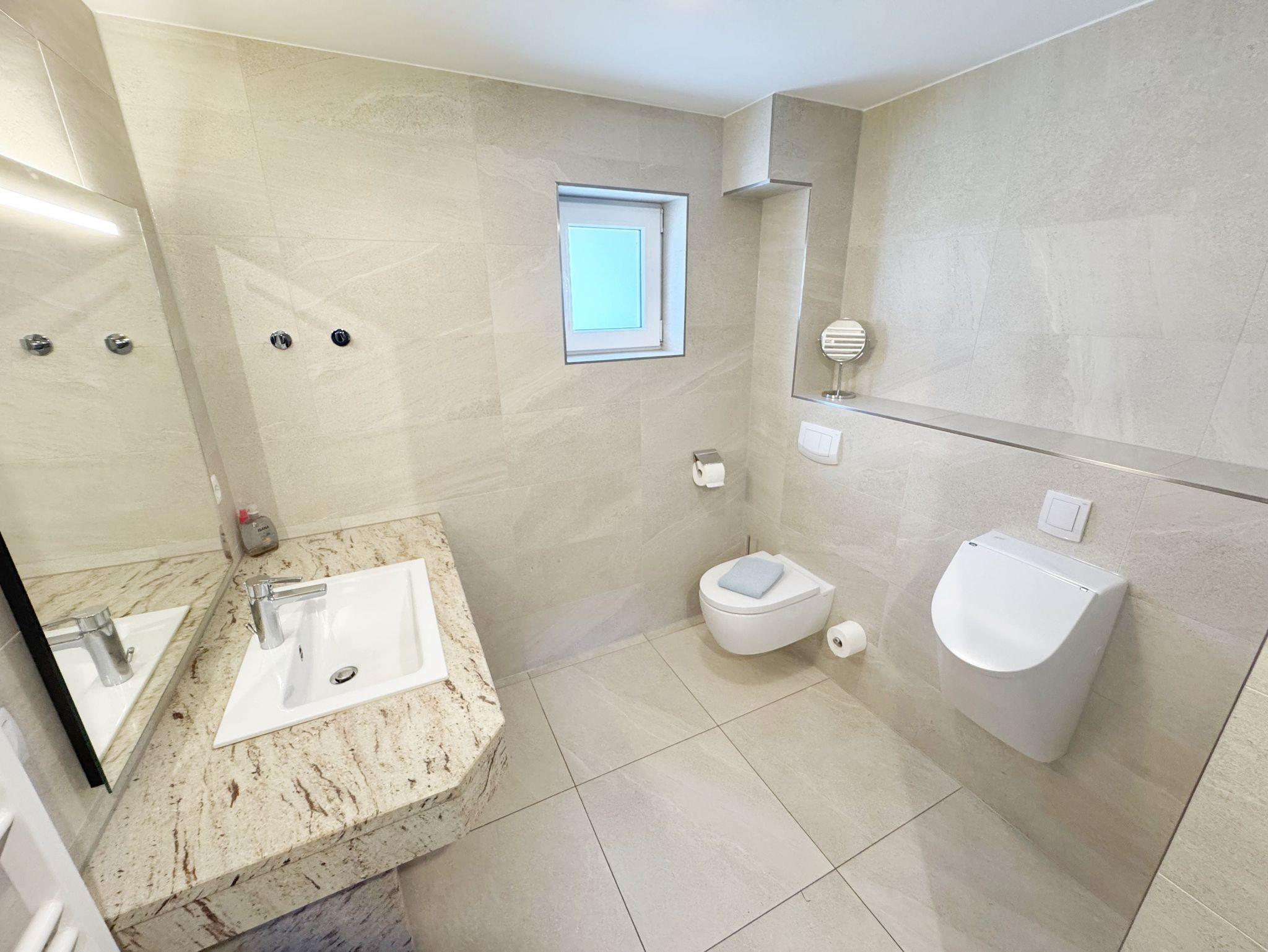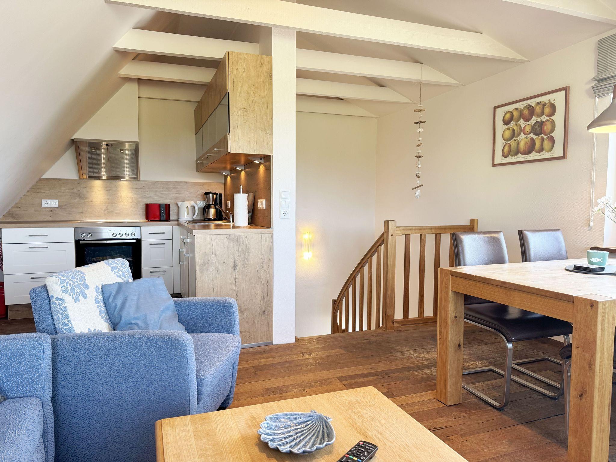 Die hier angebotene Nichtraucherwohnung mit 55 m² für 2 bis 4 Personen, befindet sich in einem Doppelhaus. Die Wohnung verfügt im Erdgeschoss über einen Eingangsbereich, ein luxuriöses Bad mit Granitwaschtisch, Echtglasdusche, Handtuchheizkörper, Fön und Fußbodenheizung sowie ein Schlafzimmer mit Doppelbett in der Größe 180 x 200 cm. Die Matratzen haben einen Härtegrad von 2 und 3. Die Möbel sind cremefarbig. Verdunklungsvorhänge in Sand- und Blautönen runden das Bild ab. Ein Einzelbett (0,90m x 2,00m) befindet sich zusätzlich im Schlafzimmer. Das Erdgeschoss ist mit hochwertigen italienischen Lake-Stone-Fliesen ausgestattet. Über eine massive Eichenholztreppe gelangt man in die obere Etage. Hier erwartet Sie der gemütliche Wohnbereich (ca. 25m²) mit Eichen-Parkettfußboden, einer offenen, modernen Küche mit Cerankochfeld, Backofen, Geschirrspülmaschine und einem Kühlschrank mit Gefrierfach. Die Küchenausstattung enthält an Kleinelektrogeräten einen Toaster, eine Kaffeemaschine, einen Handmixer sowie einen Wasser- und Eierkocher. Komfortable blau/beige Polstermöbel mit einer ausziehbaren Schlafcouch (1,60m x 2,00m), einem Esstisch aus massiver, geölter Wildeiche, Edelstahl-Schwingstühlen mit Lederbezügen in der Farbe mocca, Flachbildfernseher und Mini-Stereoanlage sowie WLAN (inklusive) runden das Bild ab. Große Giebelfenster ausgestattet mit Insektenschutz und Plissees, erlauben einen wunderbaren Blick auf die Ostsee. Eine original finnische Sauna mit moderner Dusche und Ruheliegen steht allen Gästen gegen Gebühr zur Verfügung. Die Parkplätze und ein überdachter Fahrradunterstand stehen kostenlos zur Verfügung. Ein ca. 3.000 qm großes Rasengrundstück, nahe am Haus und unmittelbar vor der Ostseeküste gelegen, steht zur Urlaubsgestaltung mit Strandkorb und bequemer Sonnenliege zur Verfügung. Ebenfalls kann ein Kinderspielplatz und ein mit bequemen Sitzgelegenheiten ausgestatteter Grillplatz genutzt werden. Für unsere kleinen Gäste steht 1x Kinderreisebett (ohne Zusatzmatratze, ohne Bettinlett) und 1x Hochstuhl inklusive bereit. Haustiere sind nicht erlaubt. Die Erstausstattung eines Wäschepaketes (komplette Bettwäsche, 1 Duschhandtuch, 2 kleine Handtücher, 2 Geschirrhandtücher) können Sie bis 14 Tage vor Anreise gegen einen Aufpreis dazu buchen oder durch eigene ergänzen.