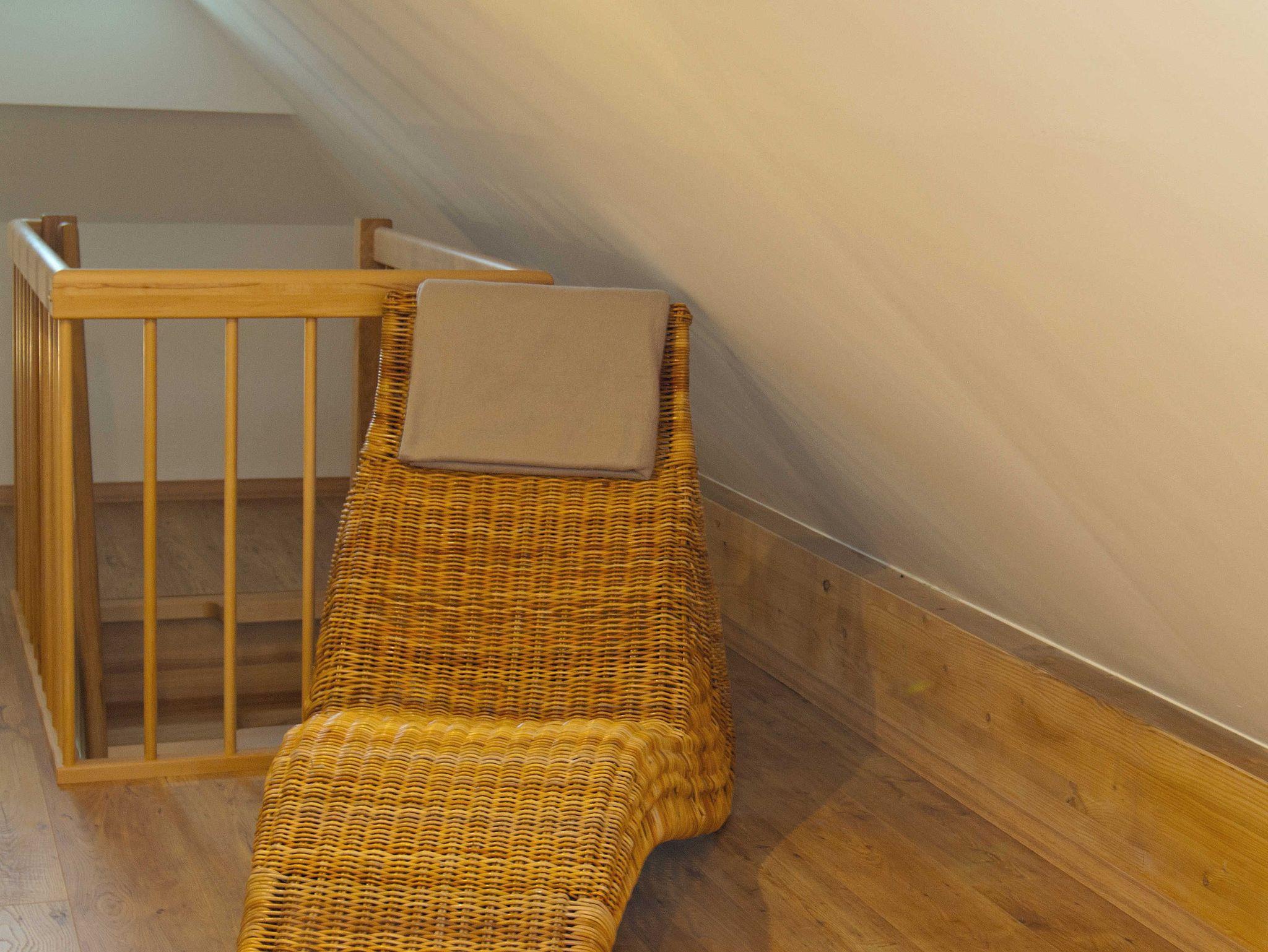 Die wunderschöne Küche im Landhaus Stil ist mit hochwertigen Markengeräten ausgestattet. Ein großer Esstisch bietet Platz für gemütliche Abende mit weitem Ausblick bis hin zur Insel Vilm. Die beiden Schlafbereiche sind mit Doppelbetten und Flachbild-TV ausgestattet. Den besonders gemütlichen Schlafbereich im Spitzboden erreicht man über eine Treppe vom Wohnzimmer. Die im Wohnbereich offene Zwischendecke mit freiliegenden Balken ist das Highlight dieser Wohnung. Zum luxuriös ausgestattete Bad mit großer ebenerdiger Regendusche gehört eine große Badewanne und ausreichend Platz. Das nicht im Bad befindliche WC ist von beiden Schlafbereichen separat zugänglich.