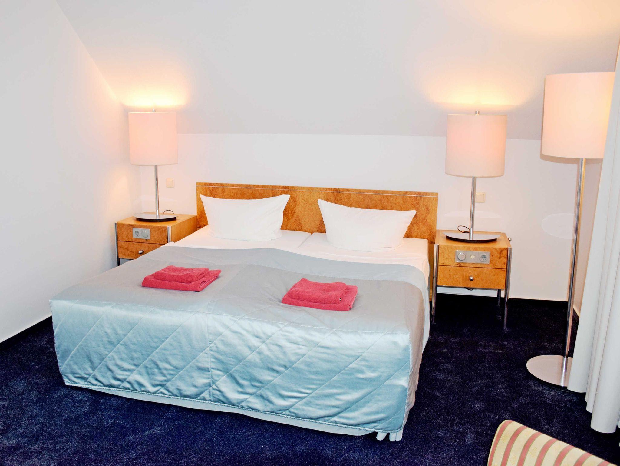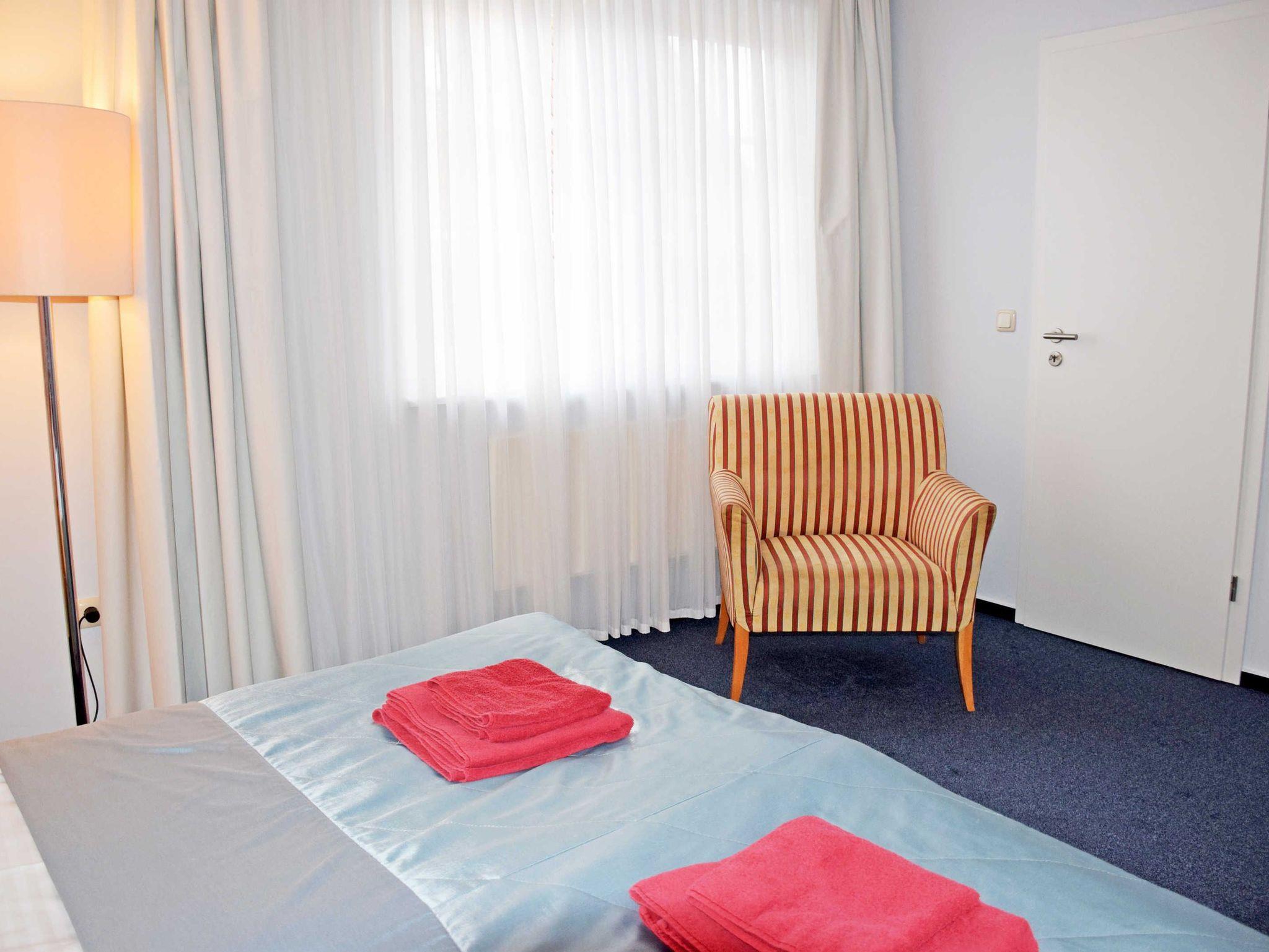 Die Ferienwohnung liegt im Hotelgebäude und ist ca. 36 qm groß. Sie hat Platz für maximal 3 Erwachsene und wurde modern und hochwertig eingerichtet. Im Wohnraum befinden sich eine bequeme Sitzcouch mit Tisch und ein modernes Flachbild-TV-Gerät. Hier steht auch ein Esstisch mit Stühlen. Die moderne Küchenzeile ist mit einem Herd, Mikrowelle, Wasserkocher, Kaffeemaschine, Toaster und Kühlschrank komplett ausgestattet. Das großzügige Schlafzimmer ist mit einem bequemen Doppelbett mit Nachttischen und Leselampen sowie einem Kleiderschrank ausgestattet.