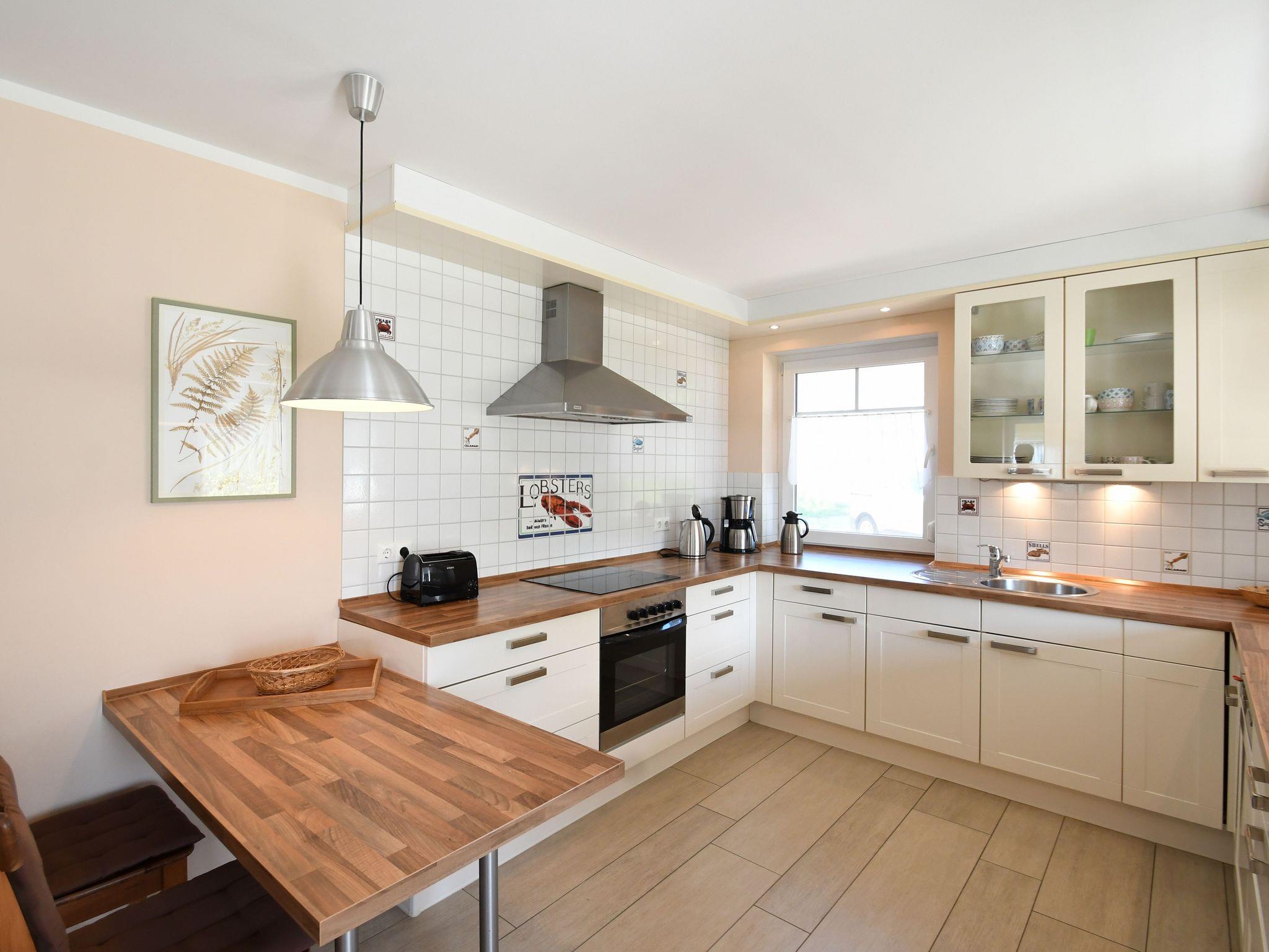 Die offene Küche verfügt über einen Backofen, einen Kühlschrank einen Geschirrspüler, Kaffeemaschine, einen Wasserkocher, einen Toaster und diverses Küchenutensilien.