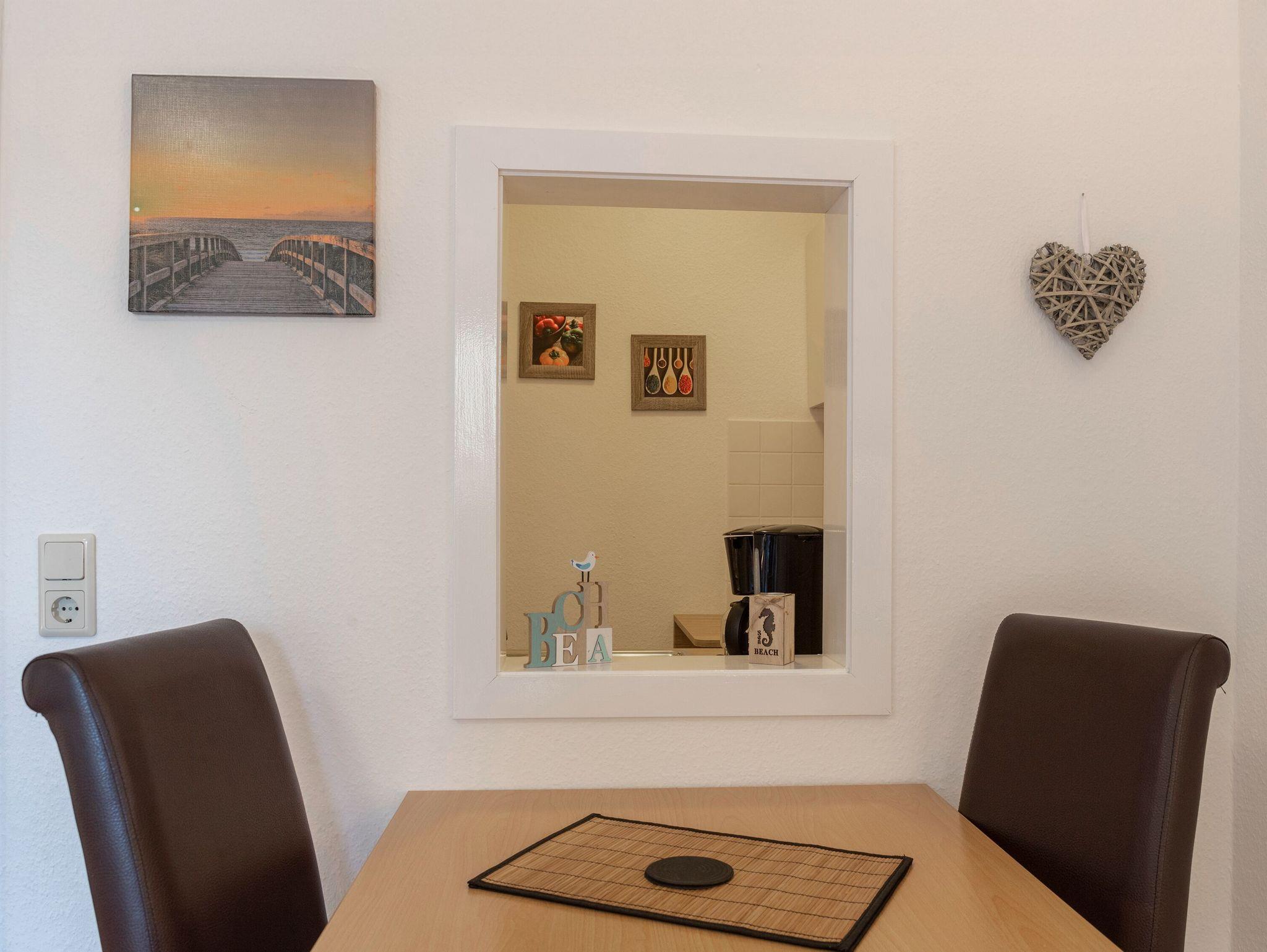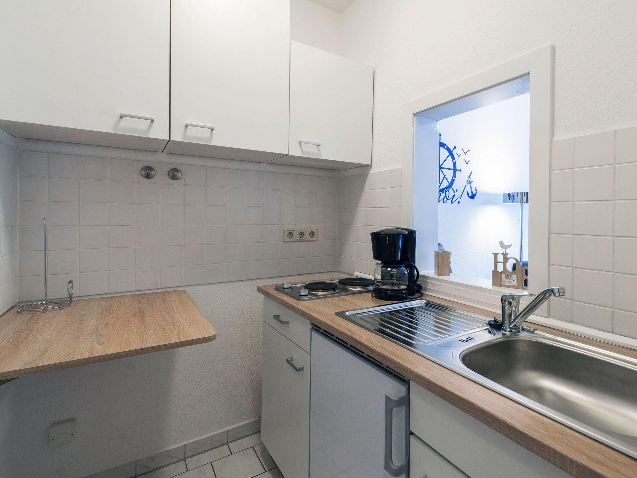Die separate Küche mit offener Durchreiche verfügt über einen 2-Platten-Herd, einen Kühlschrank, eine Kaffeemaschine, Wasserkocher und Toaster sowie natürlich auch über das nötige Koch- und Essgeschirr. Das Badezimmer ist mit Dusche/WC, Waschbecken, Spiegel und Fön ausgestattet.