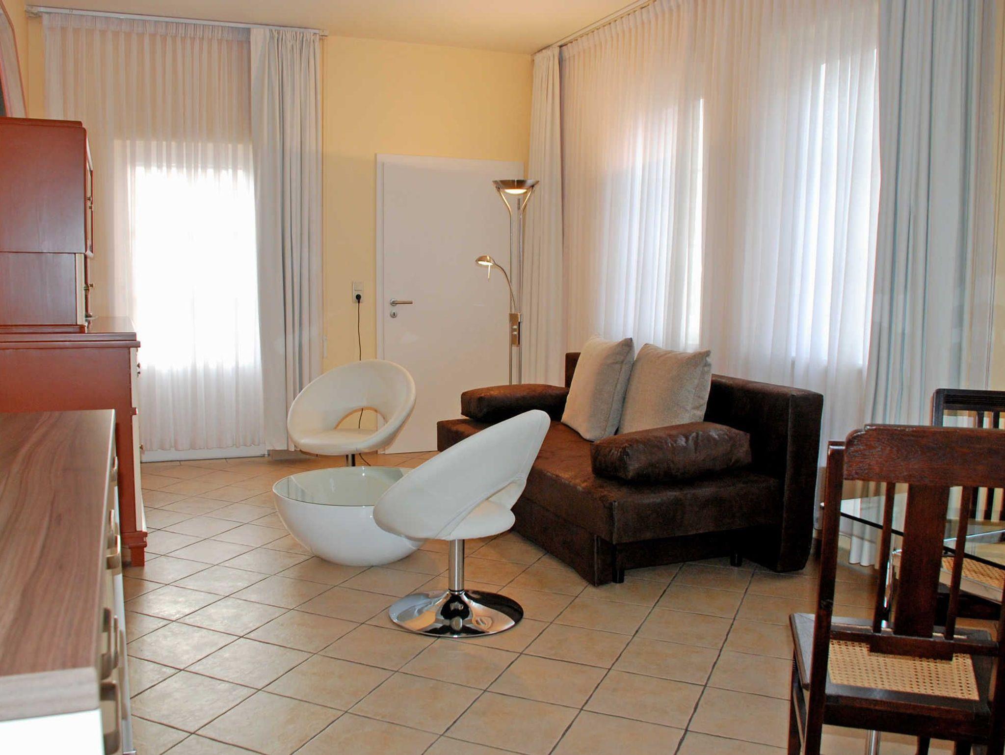 Die Ferienwohnung liegt im Hotelgebäude und verfügt über einen separaten Eingang. Sie ist ca. 36 qm groß, hat Platz für maximal 3 Erwachsene und wurde modern und hochwertig eingerichtet. Im Wohnraum befinden sich eine bequeme Sitzcouch mit Tisch und ein modernes Flachbild-TV-Gerät. Hier steht auch ein Esstisch mit Stühlen. Die moderne Küchenzeile ist mit einem Herd, Mikrowelle, Wasserkocher, Kaffeemaschine, Toaster und Kühlschrank komplett ausgestattet. Das großzügige Schlafzimmer ist mit einem bequemen Doppelbett mit Nachttischen und Leselampen sowie einem Kleiderschrank ausgestattet.