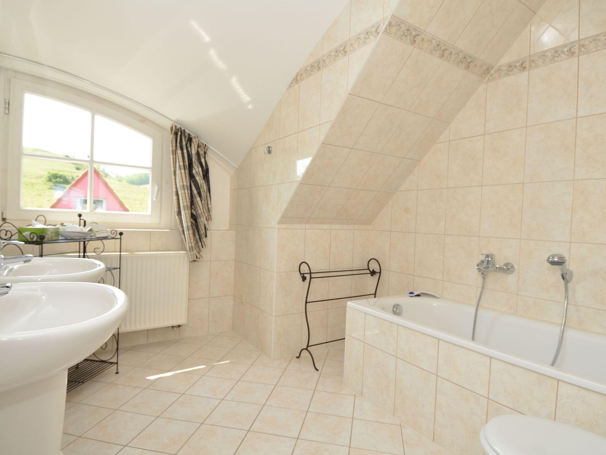 Im Obergeschoss der Wohnung findet man ein zweites Bad mit Badewanne und zwei Waschbecken, ein Schlafzimmer mit einem Doppelbett und Ankleidezimmer sowie zwei weitere Schlafzimmer mit je einem Doppelbett (1,80 x 2,00 m bzw. 1,60 x 2,00 m). Von zweien der Schlafzimmer genießt man ebenfalls den Blick zum Boddengewässer.
