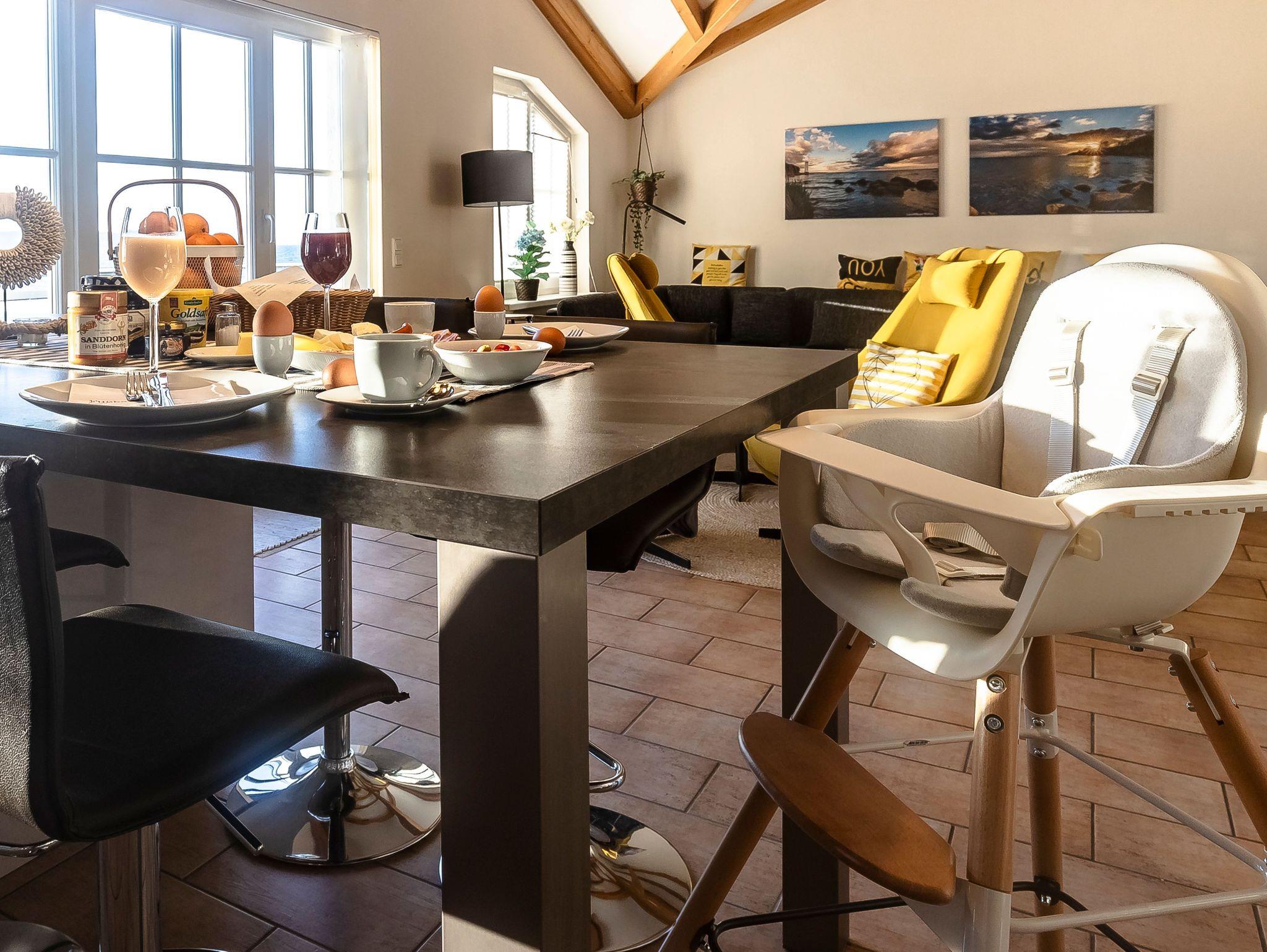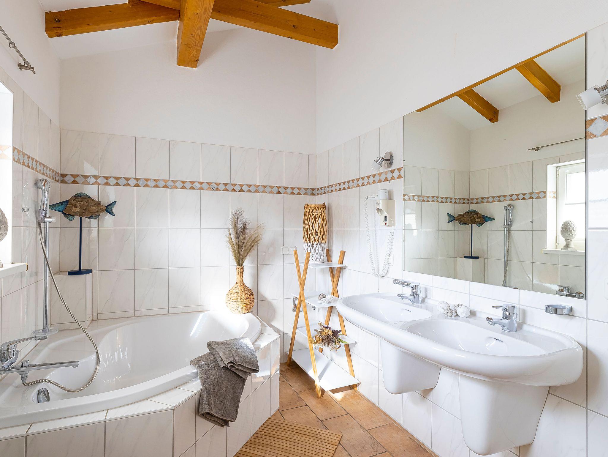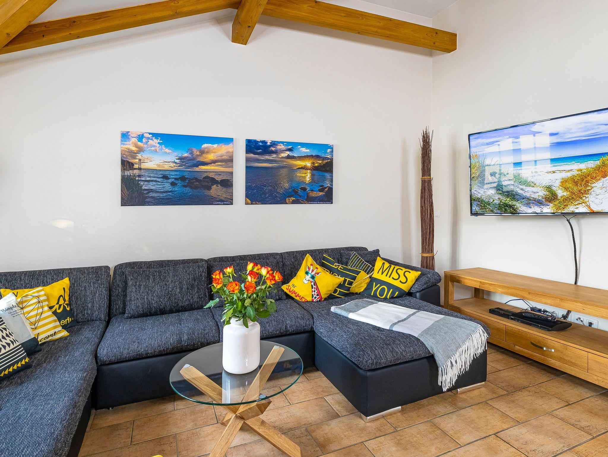 Die modern und liebevoll eingerichtete Penthouse-Wohnung 9 im Haus Seeblick verfügt über eine sonnige Dachterrasse mit offenem Seeblick, zwei separaten Schlafbereichen, sowie einem hellen Wohnbereich mit offener großer Küchenzeile. Der komfortable Wohnbereich mit einer Wohnlandschaft (Aufbettungsmöglichkeit für 5./6. Person, 1,30m x 2,00m) + Couchtisch, 2 Relaxsessel, 2 Stehlampen, einem Kamin (Holz inklusive) sowie eine TV-Bank mit Flachbild-TV bietet einen gemütlichen Ort zum Ausklingen der erlebnisreichen Tage auf der Halbinsel Mönchgut. Von hier aus gelangen Sie auf die sonnige Dachterrasse Süden und Osten) mit Balkonbestuhlung und einem einzigartigen Seeblick. Angrenzend befindet sich eine offene und voll ausgestattete Küchenzeile mit Spülmaschine, Backofen, Dunstabzugshaube, Induktionsfeld, Mikrowelle, Kühlschrank mit Eisfach, Wasserkocher, Kaffeemaschine, Nespresso Maschine, Toaster, allerlei Küchenkleingeräte sowie ein Essplatz in Form eines Bartisches. Das größere Schlafzimmer verfügt über ein Boxspringbett (2,00m x 2,00m), eine Nachttischablage, ein Kleiderschrank, eine Kommode sowie einen Sessel. Im zweiten Schlafzimmer befindet sich ein Boxspringbett (1,40m x 2,00m), Nachttischablage, ein Kleiderschrank, eine Kommode, eine Stehlampe sowie ein Standspiegel. Das freundliche Badezimmer bietet Ihnen eine geräumige Eck-Badewanne, ein WC, ein Fön, ein Kosmetikspiegel und ein Doppelwaschplatz mit dazugehörigem Spiegel. Des Weiteren befindet sich ein zusätzliches Gäste-WC mit kleinem Waschtisch in der Wohnung. Für unsere kleinen Gäste steht ein Hochstuhl sowie ein Kinderreisebett (ohne Bett Inlett/inkl. Matratze) zur Verfügung. Auch ein 4-Beiner ist mit seinem eigenen Schlafplatz gegen eine Gebühr ein gern gesehener Gast. Eine Fahrrad-Unterstellmöglichkeit steht Ihnen und allen Gästen des Hauses zur gemeinschaftlichen Nutzung kostenfrei zur Verfügung. Ihr PKW-Stellplatz befindet sich knapp 100m vom Haus entfernt und ist für Sie inklusive. Die Erstausstattung eines Wäschepaketes (komplette Bettwäsche, 1 Duschhandtuch, 2 kleine Handtücher) können Sie bis 14 Tage vor Anreise gegen einen Aufpreis dazu buchen oder durch eigene ergänzen. Ab 2 gebuchten Paketen erhalten Sie einmalig 1 Geschirrhandtuch und 1 Duschvorleger hinzu.