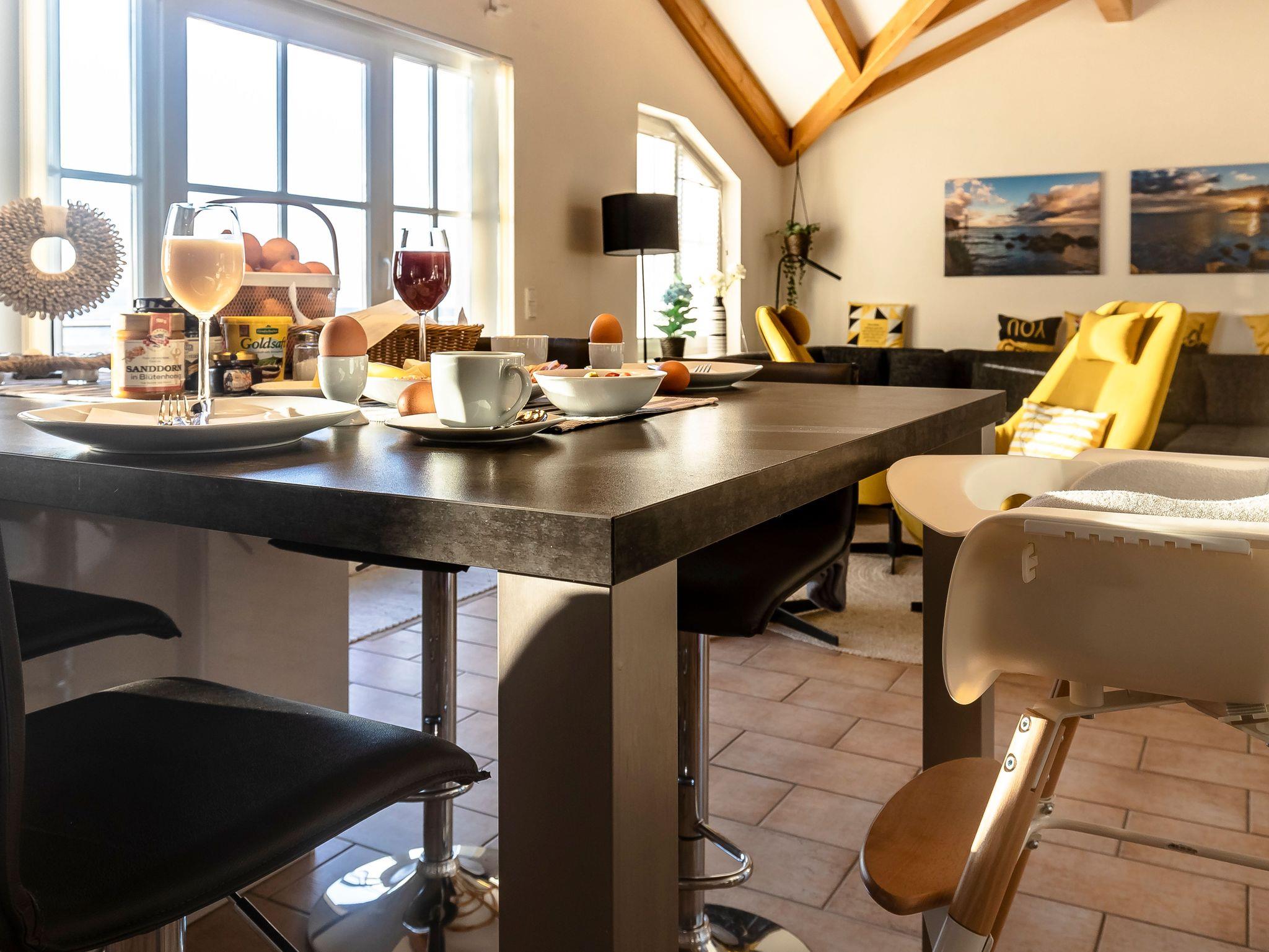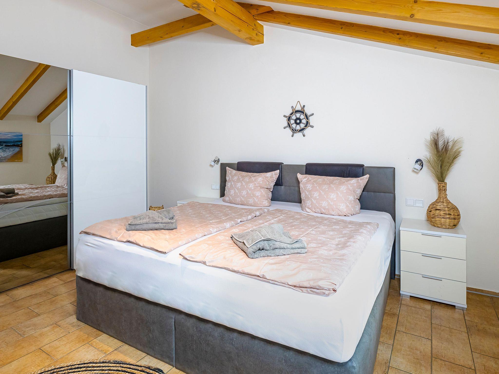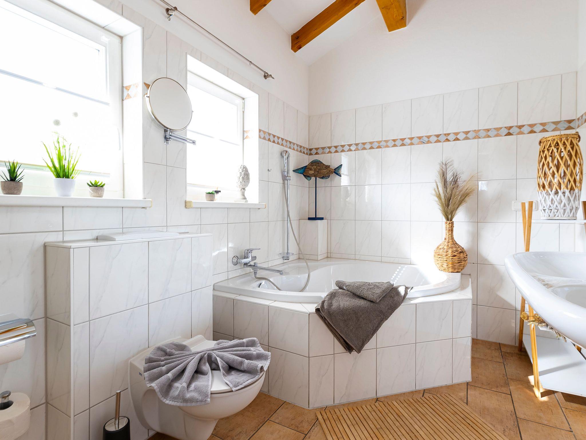 Die modern und liebevoll eingerichtete Penthouse-Wohnung 9 im Haus Seeblick verfügt über eine sonnige Dachterrasse mit offenem Seeblick, zwei separaten Schlafbereichen, sowie einem hellen Wohnbereich mit offener großer Küchenzeile. Der komfortable Wohnbereich mit einer Wohnlandschaft (Aufbettungsmöglichkeit für 5./6. Person, 1,30m x 2,00m) + Couchtisch, 2 Relaxsessel, 2 Stehlampen, einem Kamin (Holz inklusive) sowie eine TV-Bank mit Flachbild-TV bietet einen gemütlichen Ort zum Ausklingen der erlebnisreichen Tage auf der Halbinsel Mönchgut. Von hier aus gelangen Sie auf die sonnige Dachterrasse Süden und Osten) mit Balkonbestuhlung und einem einzigartigen Seeblick. Angrenzend befindet sich eine offene und voll ausgestattete Küchenzeile mit Spülmaschine, Backofen, Dunstabzugshaube, Induktionsfeld, Mikrowelle, Kühlschrank mit Eisfach, Wasserkocher, Kaffeemaschine, Nespresso Maschine, Toaster, allerlei Küchenkleingeräte sowie ein Essplatz in Form eines Bartisches. Das größere Schlafzimmer verfügt über ein Boxspringbett (2,00m x 2,00m), eine Nachttischablage, ein Kleiderschrank, eine Kommode sowie einen Sessel. Im zweiten Schlafzimmer befindet sich ein Boxspringbett (1,40m x 2,00m), Nachttischablage, ein Kleiderschrank, eine Kommode, eine Stehlampe sowie ein Standspiegel. Das freundliche Badezimmer bietet Ihnen eine geräumige Eck-Badewanne, ein WC, ein Fön, ein Kosmetikspiegel und ein Doppelwaschplatz mit dazugehörigem Spiegel. Des Weiteren befindet sich ein zusätzliches Gäste-WC mit kleinem Waschtisch in der Wohnung. Für unsere kleinen Gäste steht ein Hochstuhl sowie ein Kinderreisebett (ohne Bett Inlett/inkl. Matratze) zur Verfügung. Auch ein 4-Beiner ist mit seinem eigenen Schlafplatz gegen eine Gebühr ein gern gesehener Gast. Eine Fahrrad-Unterstellmöglichkeit steht Ihnen und allen Gästen des Hauses zur gemeinschaftlichen Nutzung kostenfrei zur Verfügung. Ihr PKW-Stellplatz befindet sich knapp 100m vom Haus entfernt und ist für Sie inklusive. Die Erstausstattung eines Wäschepaketes (komplette Bettwäsche, 1 Duschhandtuch, 2 kleine Handtücher) können Sie bis 14 Tage vor Anreise gegen einen Aufpreis dazu buchen oder durch eigene ergänzen. Ab 2 gebuchten Paketen erhalten Sie einmalig 1 Geschirrhandtuch und 1 Duschvorleger hinzu.