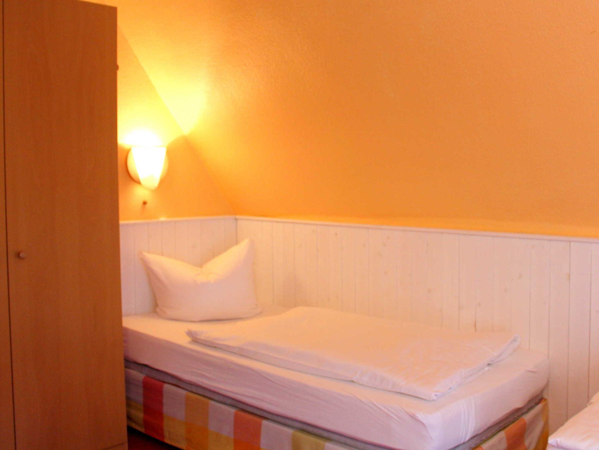 Über eine Wendeltreppe erreichen Sie ein gemütlich eingerichtetes Schlafzimmer mit Doppelbett und Leseplatz. Im benachbarten zweiten Schlafzimmer stehen zwei normal große Schlafliegen. Kleiderschrank und Kommode bieten viel Stauraum. Beide Räume sind trotz Dachschrägen großzügig.