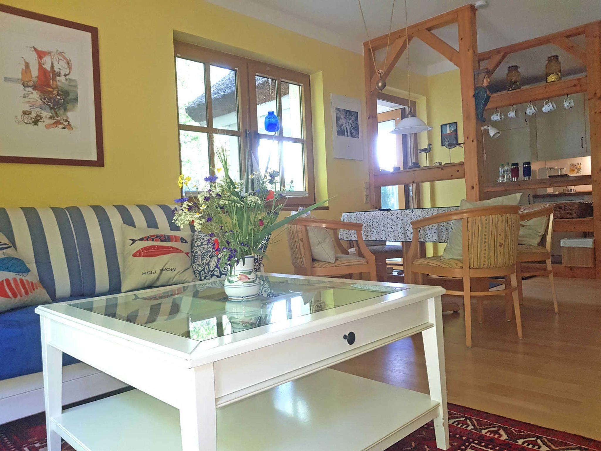 Stilvolle Maisonette-Wohnung mit Boddenblick und Terrasse auf Mönchgut, ideal für Familien und Naturfreunde.