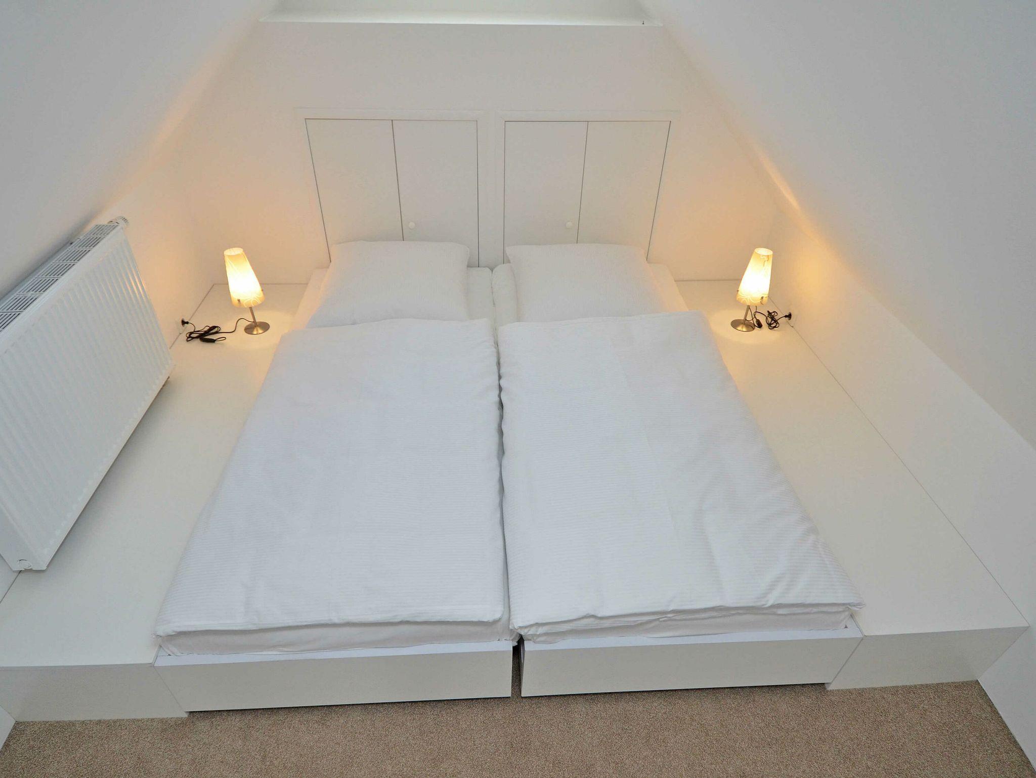 Über eine Treppe gelangen Sie in das Obergeschoß. Pro Haushälfte erwarten Sie hier 3 Schlafzimmer - 2 davon mit einem Doppelbett (Box-Spring-Betten) der Größe 180x200 cm/160x200cm und einem eigenem TV. Das dritte Schlafzimmer ist mit einem Landhaus-Doppelbett Größe 160x200 cm ausgestattet. Ein Kinderreisebett steht ebenfalls zur Verfügung.