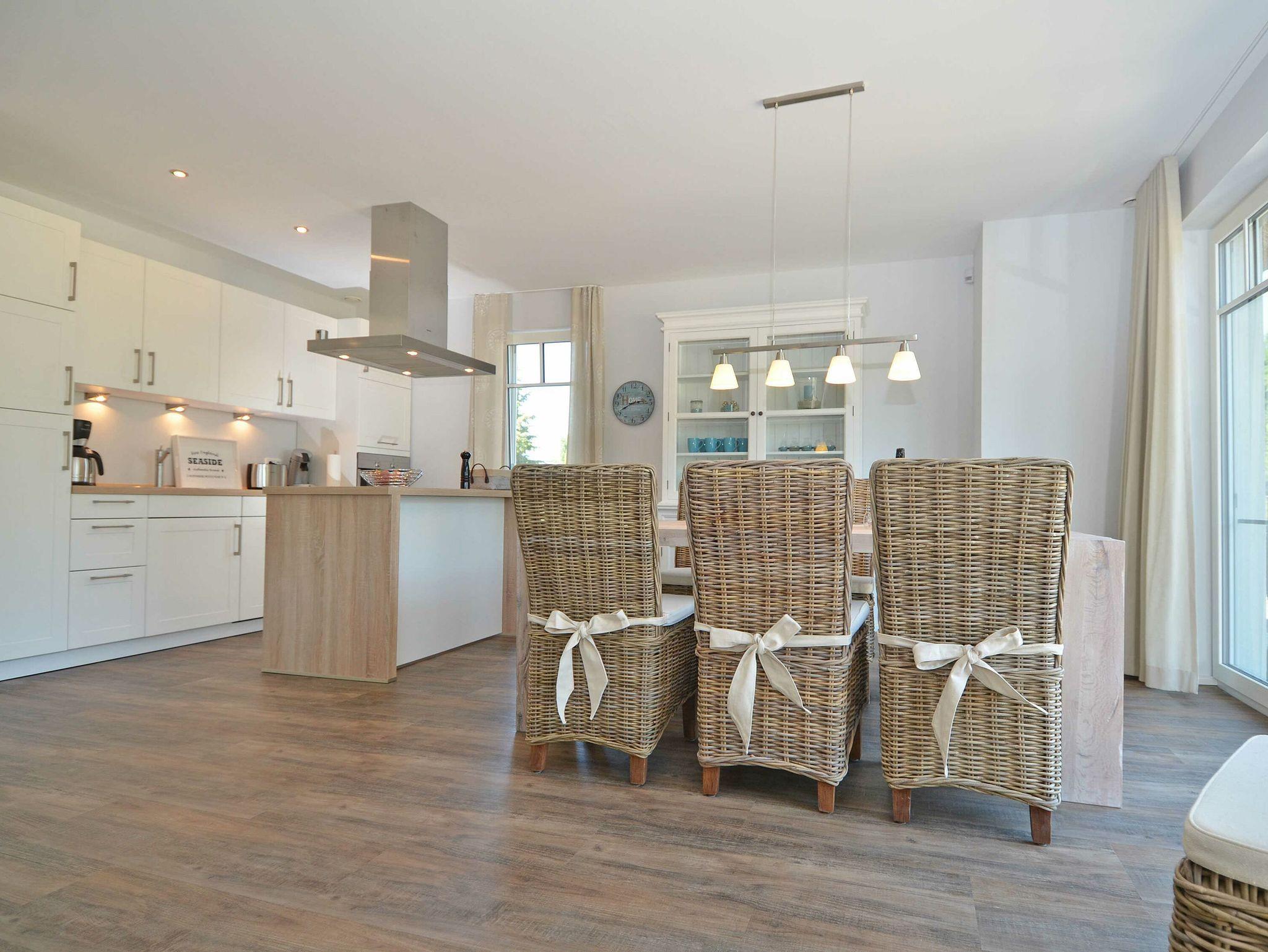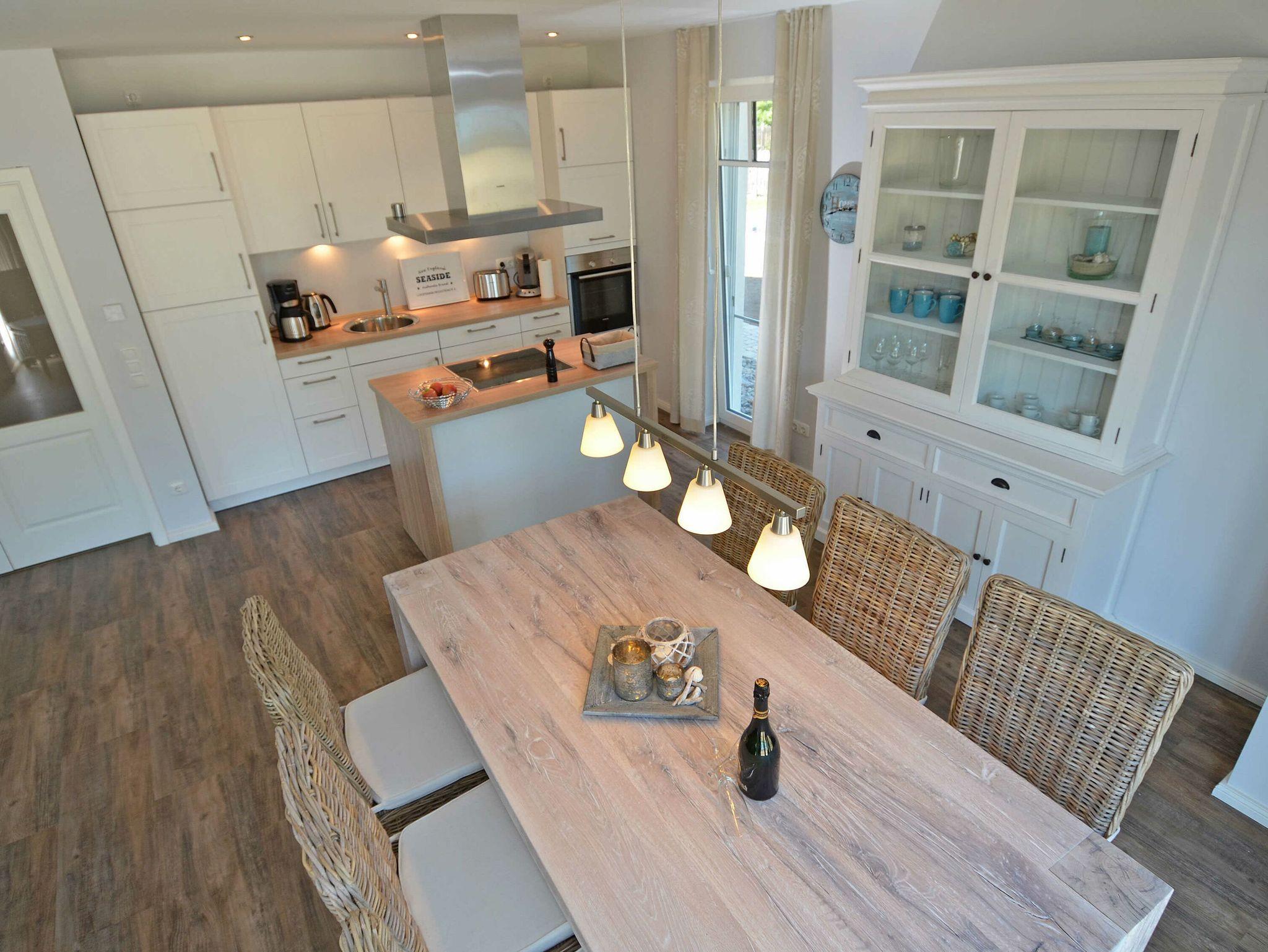 Ein großer Esstisch aus Holz mit markanter Oberfläche ermöglicht bis zu 6 Personen ein anregendes Mahl. In der warmen Jahreszeit können Sie natürlich auch an der frischen Seeluft draußen speisen. Die Terrasse ist entsprechend bestuhlt. Die Balkon- bzw. Terrassenmöbel stehen saisonal - in der Regel von Mai bis Ende September - zur Verfügung.