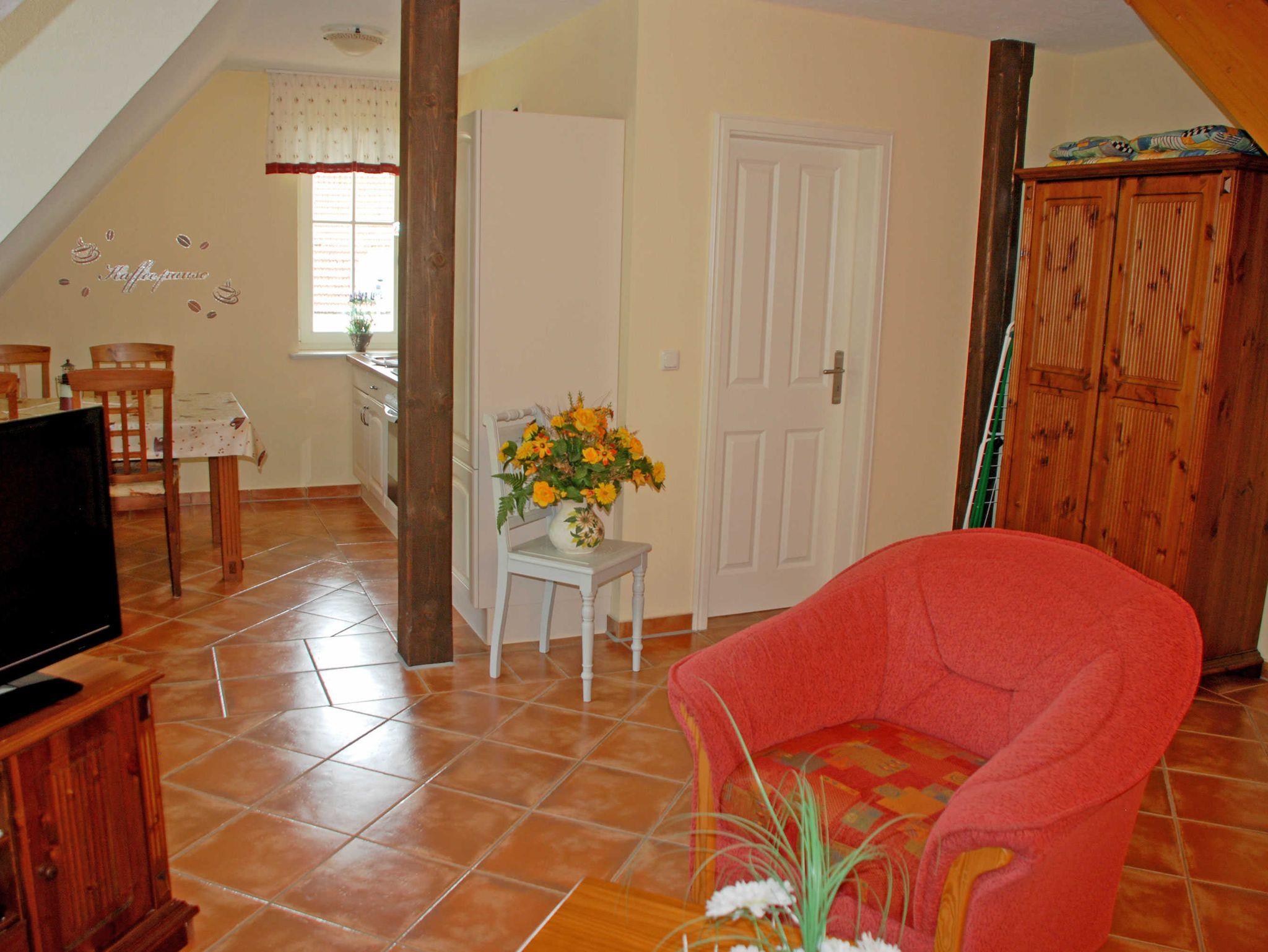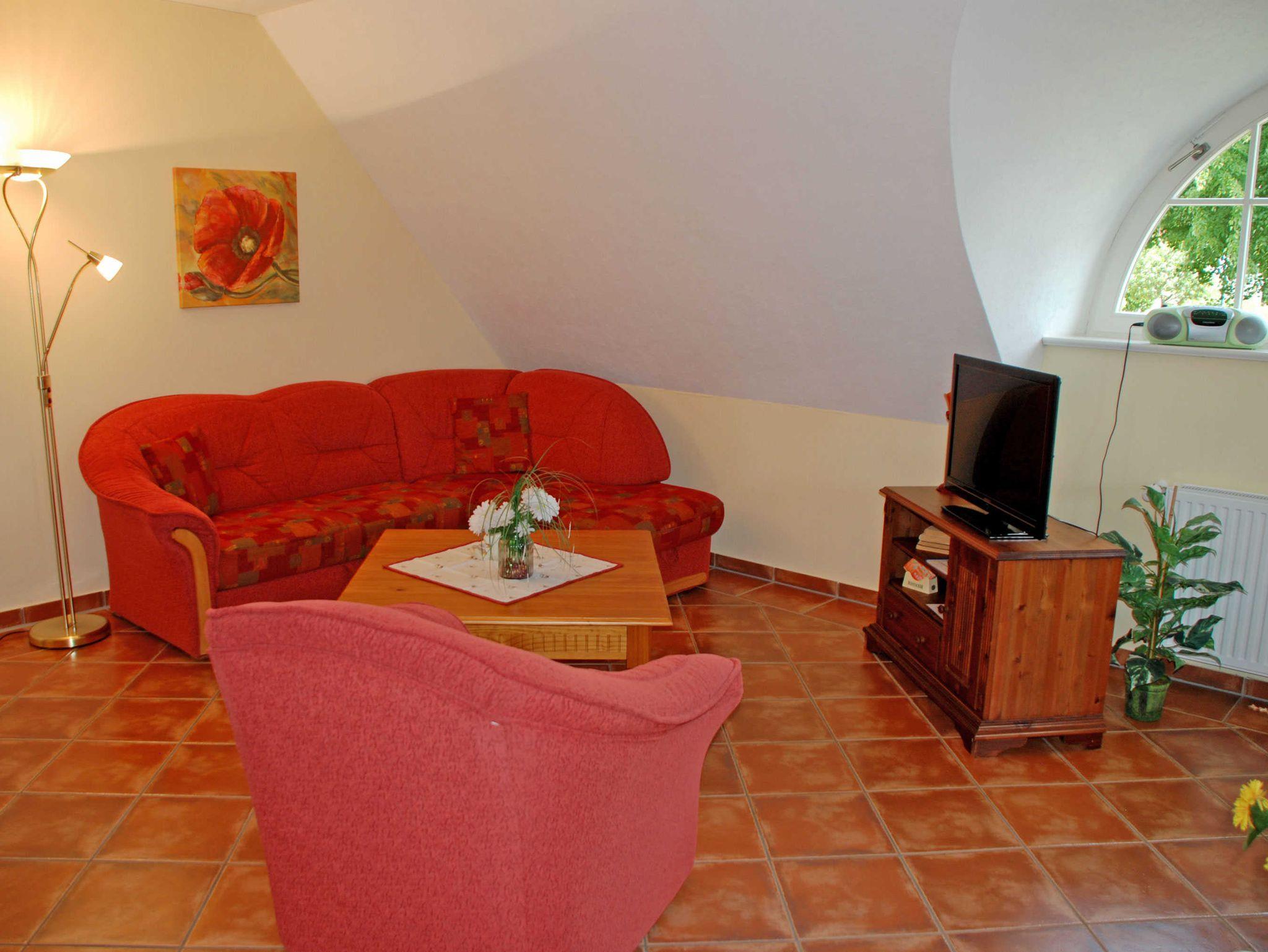Dieses großzügige und sehr liebevoll eingerichtete Maisonette Appartement verfügt über ein Wohnküche und ein großes Schlafzimmer sowie Bad/WC und Flur. Es befindet sich im Obergeschoss des Landhus, das Schlafzimmer ist über eine Treppe bequem zu erreichen. Im Schlafzimmer stehen ein Doppelbett und ein Einzelbett. Eine weitere Liege oder ein Kinderreisebett können hier als Aufbettung gegen Aufpreis bereitgestellt werden. Im Wohnraum gibt es eine Couch mit Sitzgelegenheiten. Das Bad ist mit einer Dusche ausgestattet.