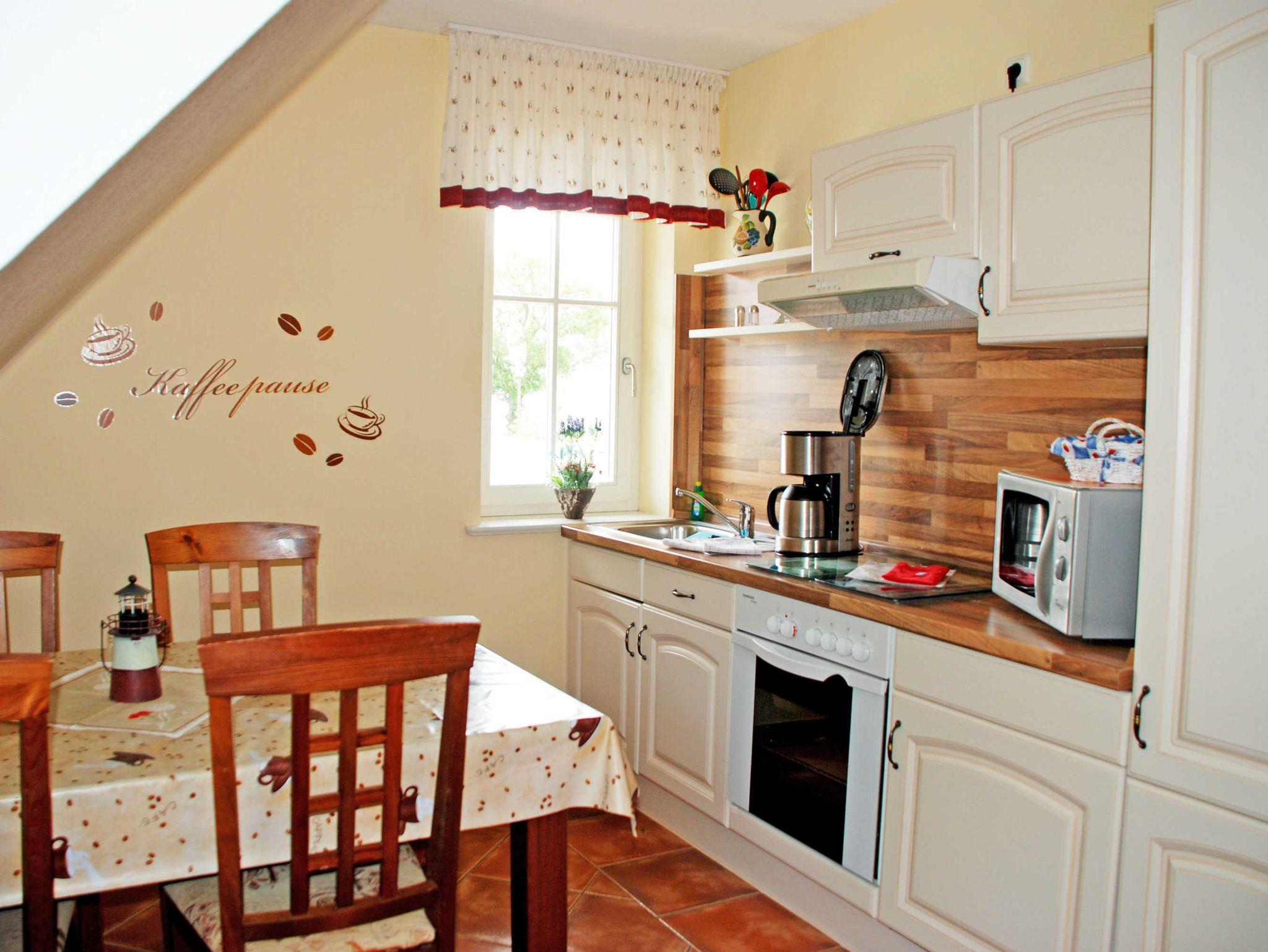 Die komplette Einbauküche mit 4-Platten-Ceranherd, Backofen, Mikrowelle, Kaffeemaschine, Toaster, Wasser- und Eierkocher, Kühlschrank usw. lässt keine Wünsche offen. In diesem Appartement ist das Mitbringen von Kleintieren nicht möglich!