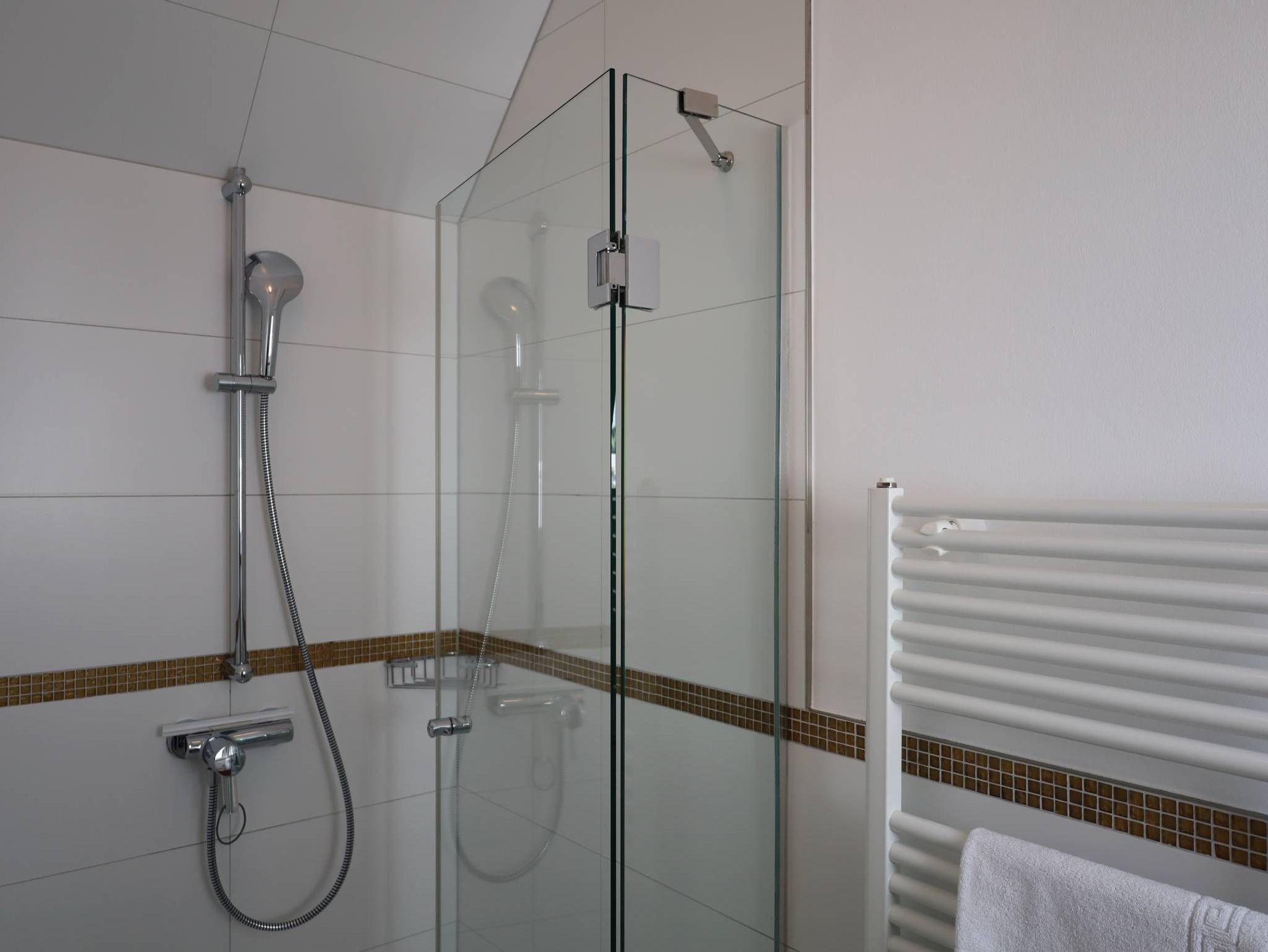 Im Obergeschoss befinden sich zwei separate Schlafzimmer. Eines ist mit einem Doppelbett und einem Kleiderschrank ausgestattet, das andere mit einem Einzelbett und einer großzügigen Kommode. Das dritte Schlafzimmer mit Doppelbett befindet sich im Dachgeschoss und verfügt über einen zusätzlichen Fernseher. Beide Badezimmer verfügen über eine ebenerdige Dusche.