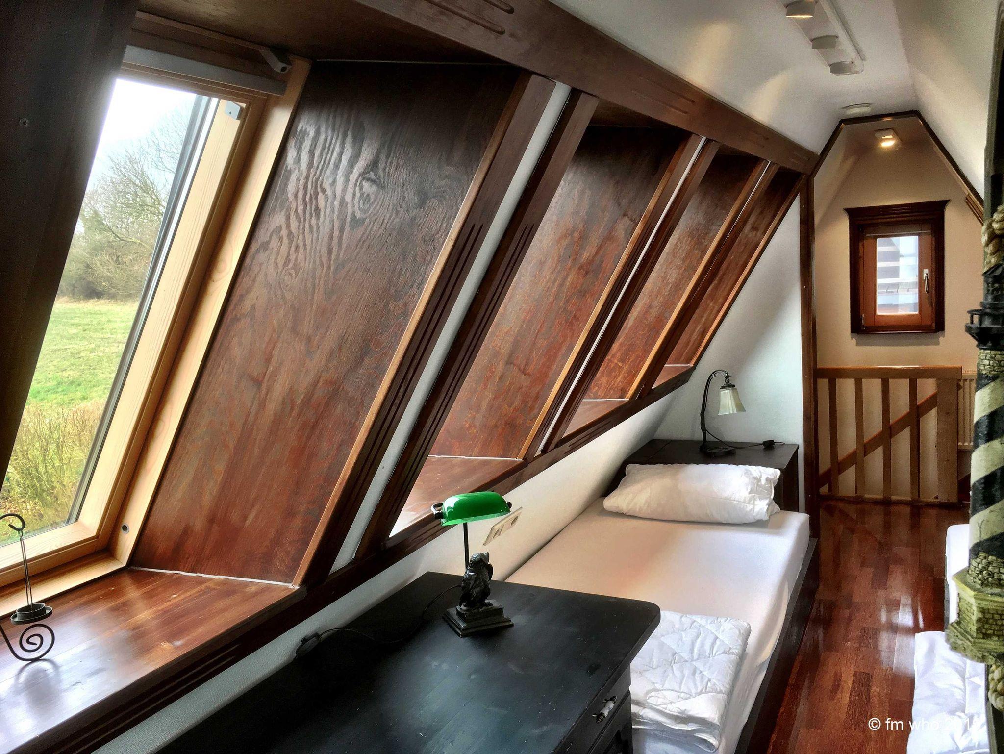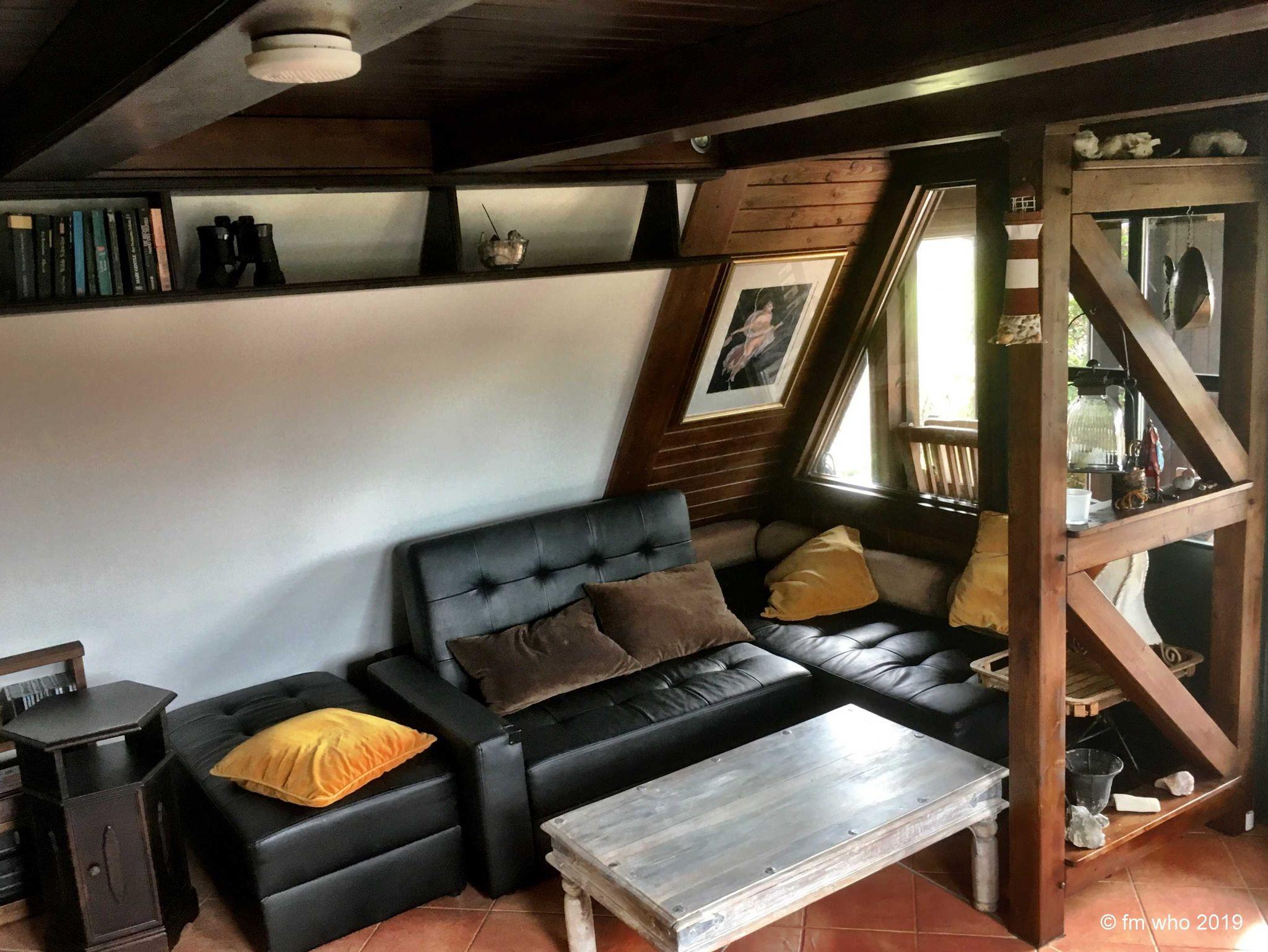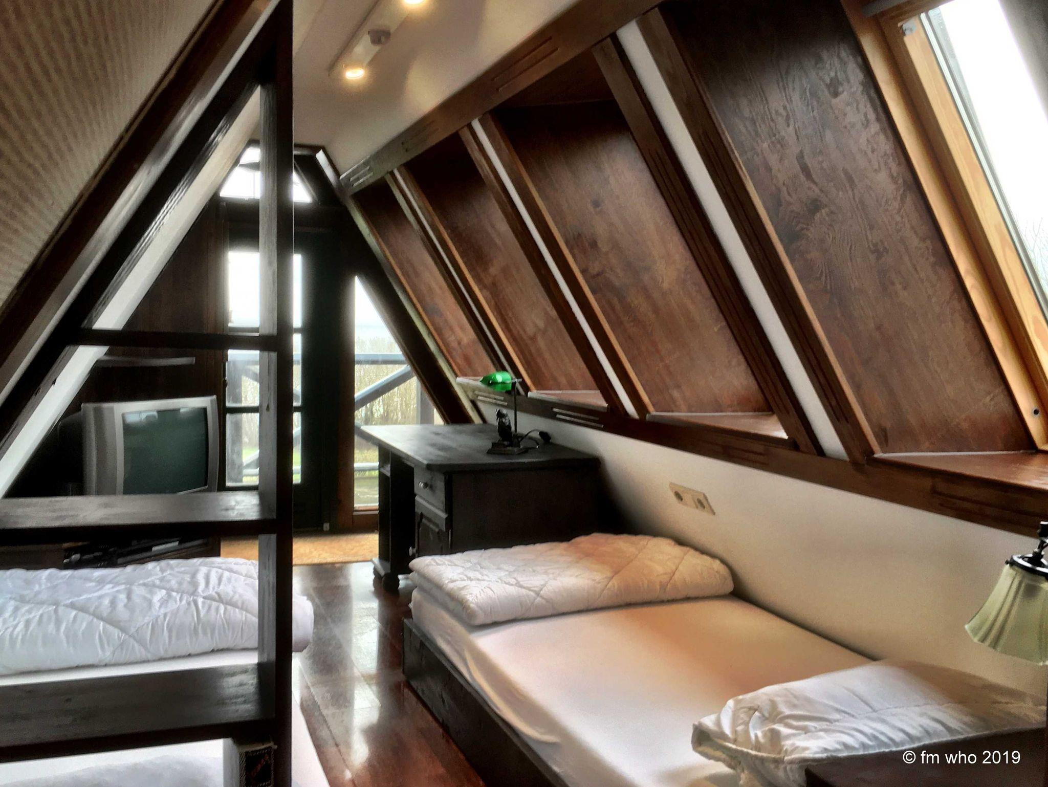 Als Finnhütte angelegt finden Sie geruhsamen Schlaf in der ersten Etage mit großzügigem Balkon und ausgestattet mit zwei Betten, einem Schreibtisch TV Gerät, DVD Player sowie Einbau- und Wandschränken für Ihre Kleidung. Beim Aufwachen am Morgen fällt Ihr Blick dann sogleich auf vorgelegene Ostsee. Die komplette Fensterfront und vielen Dachfenster sorgen für freundliches Tageslicht.
