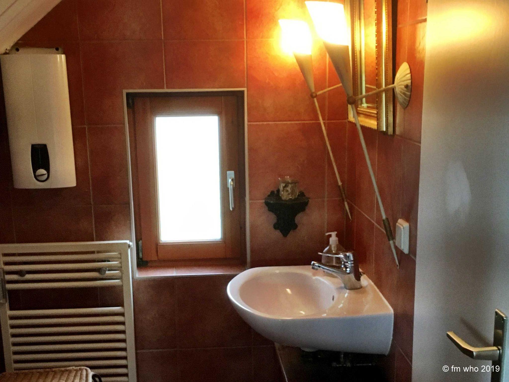 Das angrenzende Bad, wie das komplette EG gefliest mit Terrakotta-Fliesen, hat eine Dusche und ein Waschbecken; das WC ist vom Bad aus mit separater Tür zu begehen.