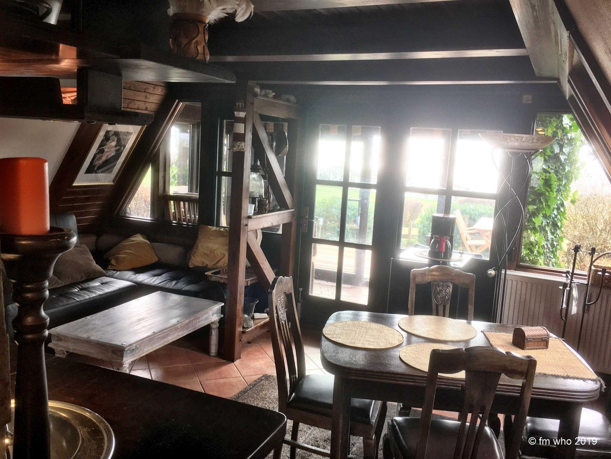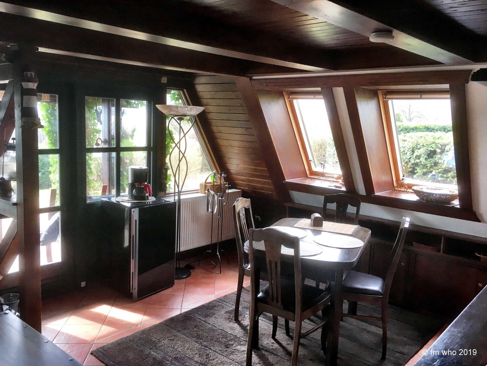 Vor dem Wohnraum mit Blick auf die Hagensche Wiek sowie links und rechts auf die angrenzenden Wiesen und Wälder gelangen Sie in den kleinen Wintergarten, in dem sich auch bei stürmischem Wetter ein Buch oder ein Glas Wein hervorragend genießen lässt, und Ihnen trotzdem das Gefühl vermittelt, sich mitten in der Natur zu befinden.