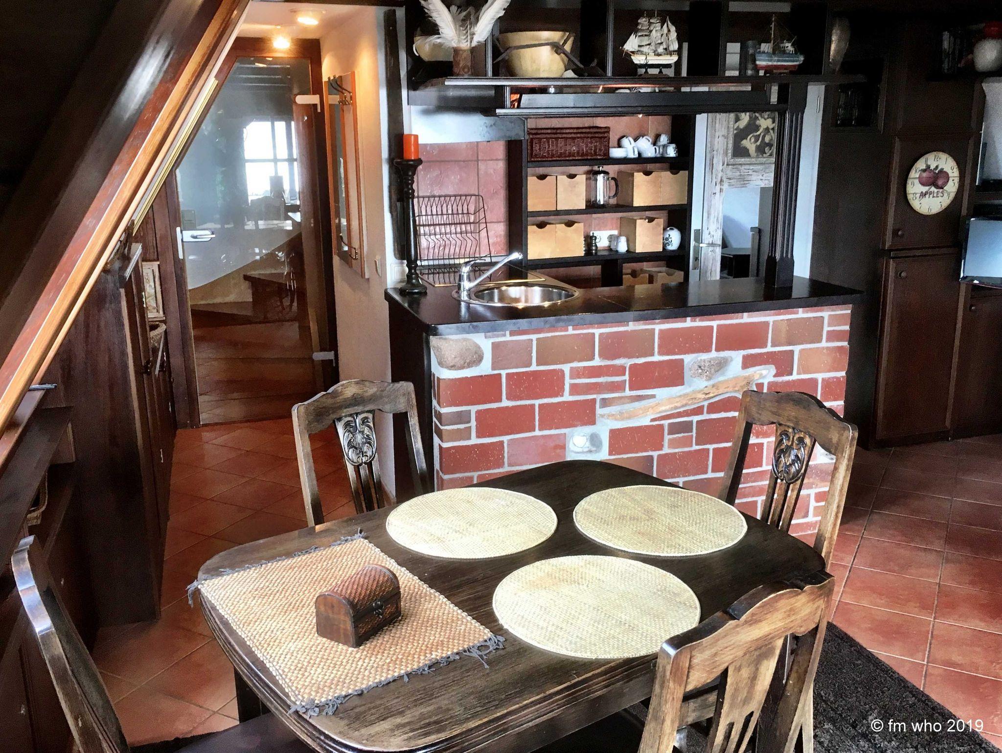 Die angrenzende offene Küche mit Essbereich ist ein rustikaler Hingucker wenn man den Wohnbereich betritt.